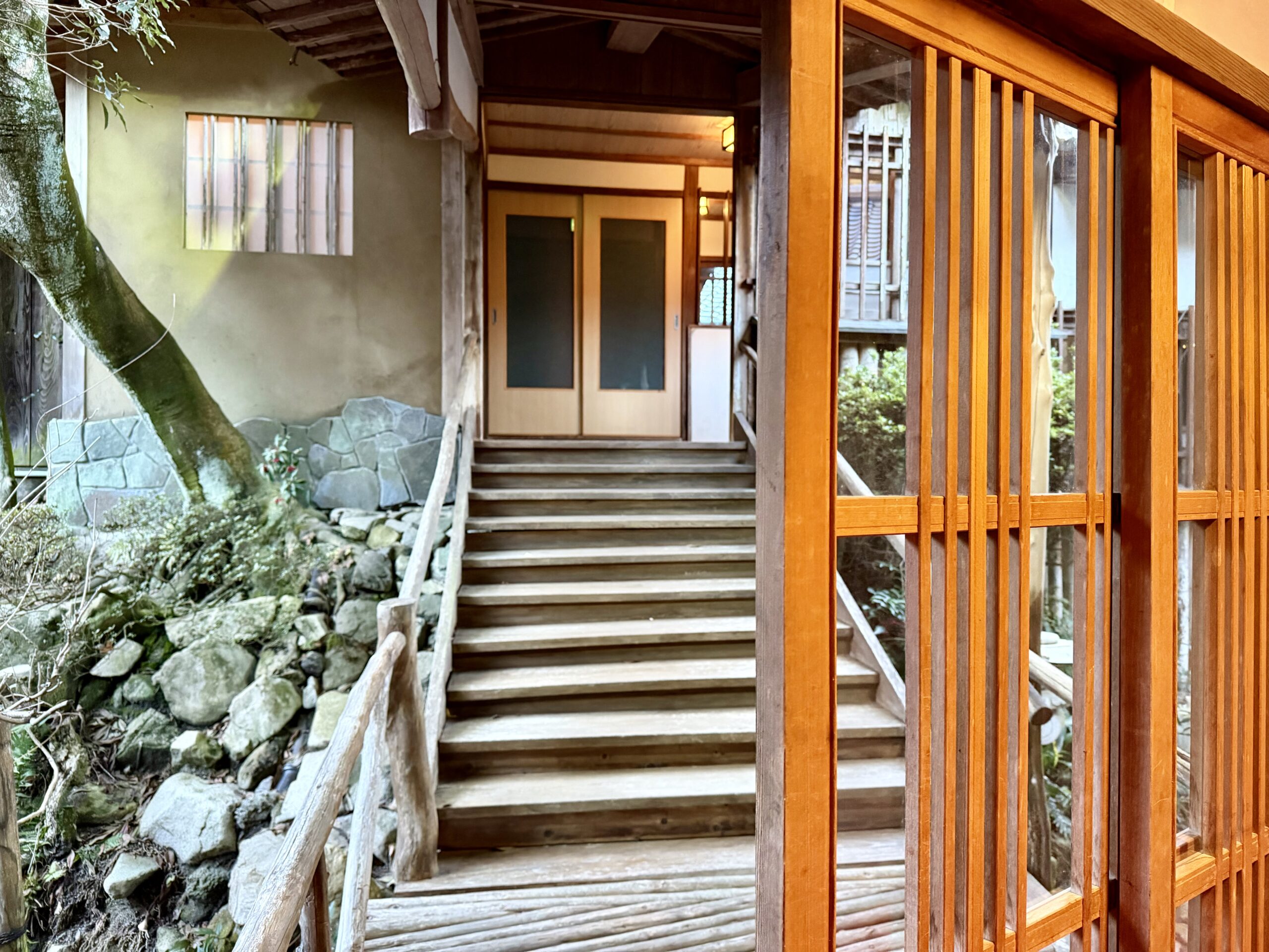 大浴場ではなく貸切風呂。玄関のある母屋から一瞬外階段で離れの建物へ。