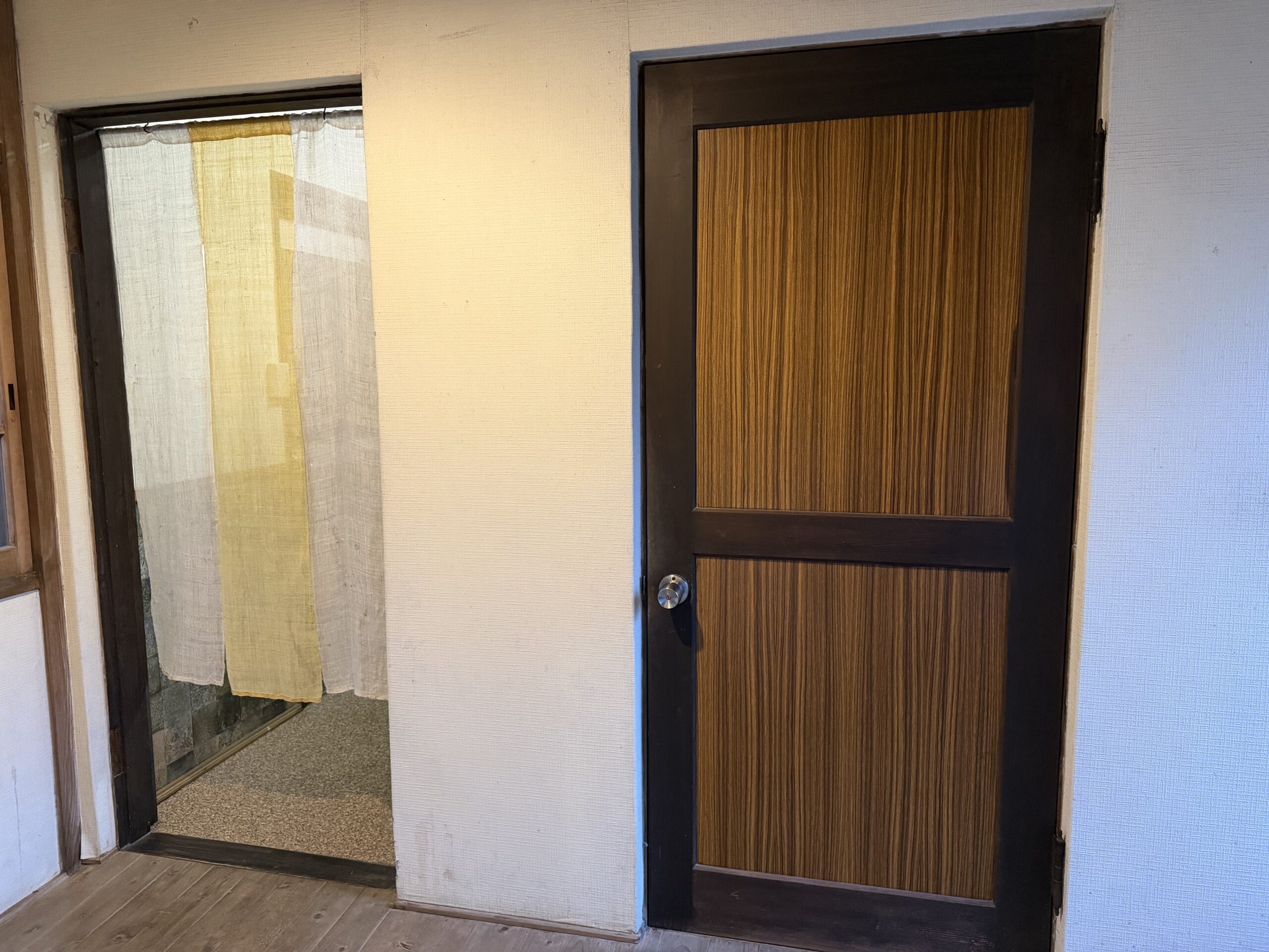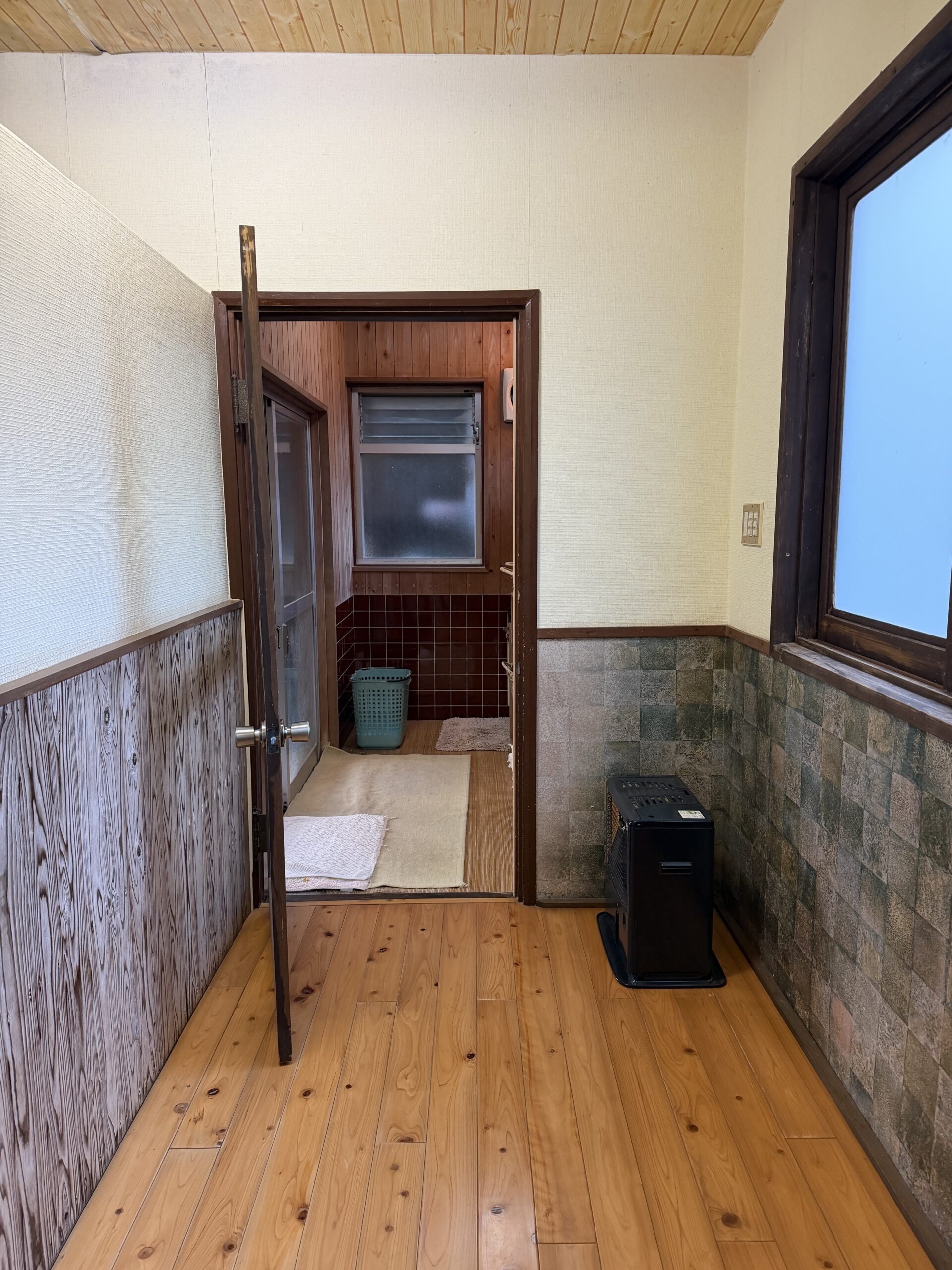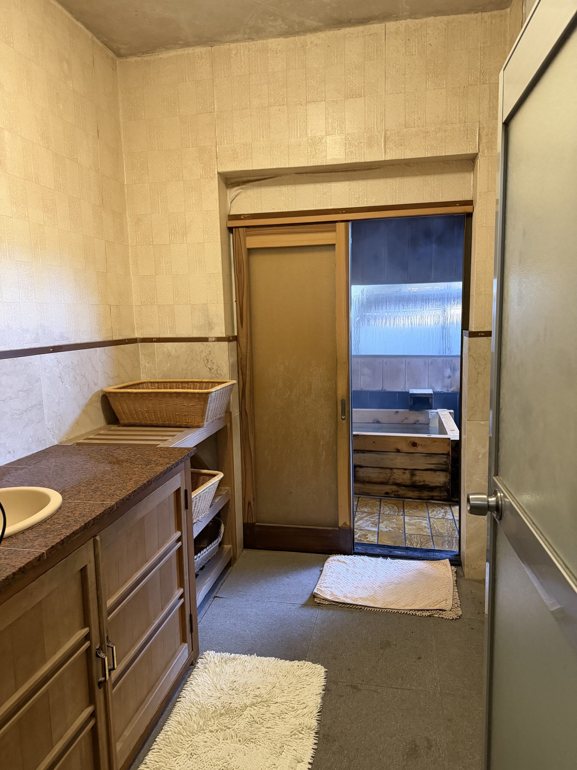 夕食前のお風呂は2つある貸切風呂の右側の大きい方。広めの廊下スペースの先の扉の向こうに脱衣場。