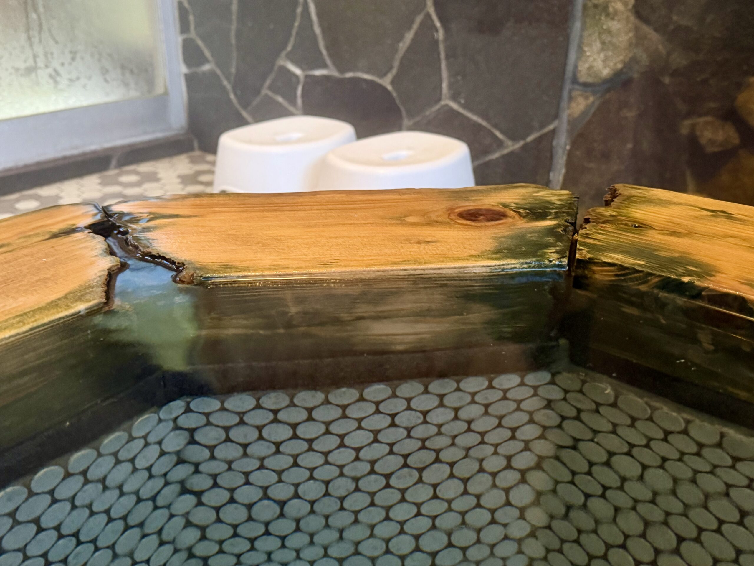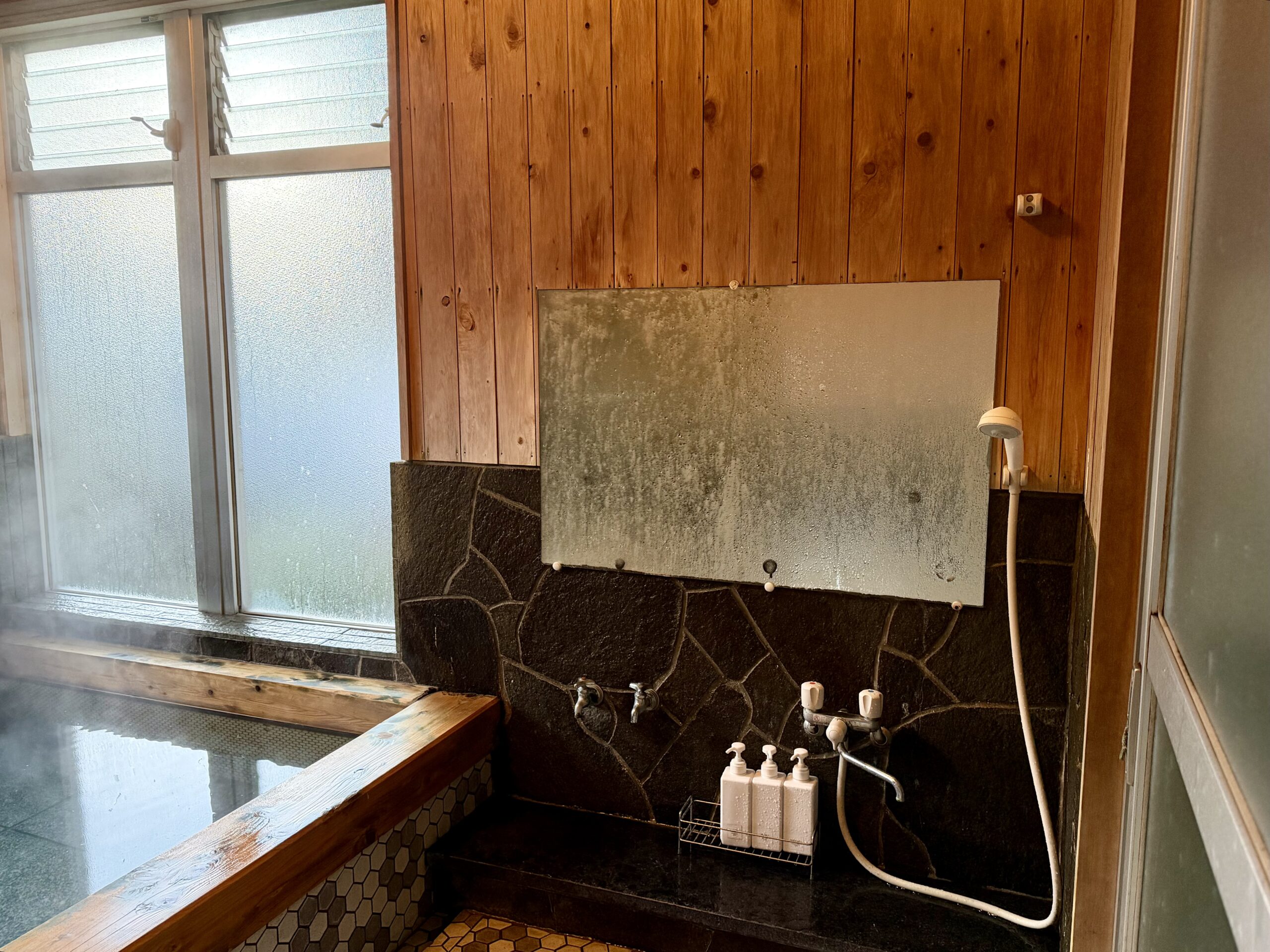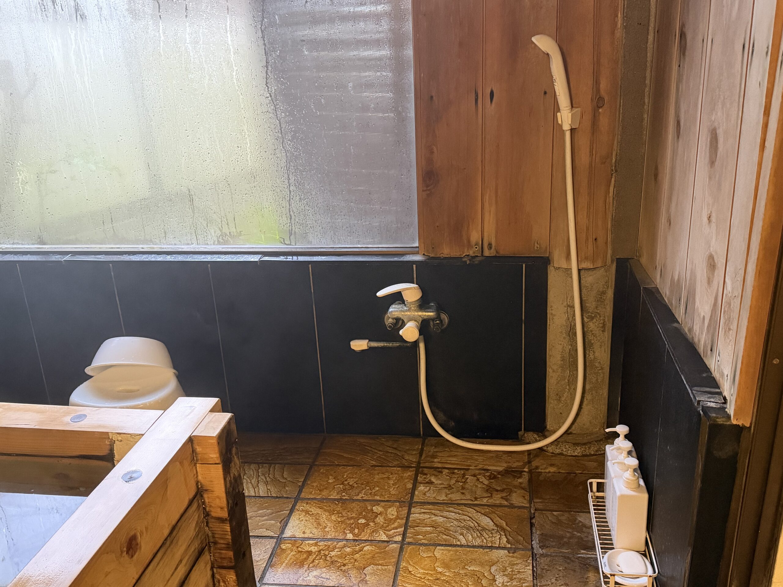 シャワーはひとつで、こちらも源泉が出る。翌朝はもう一方の小さな貸切風呂で、シャワーがないから、こちらで洗髪しとくようにと言われた。