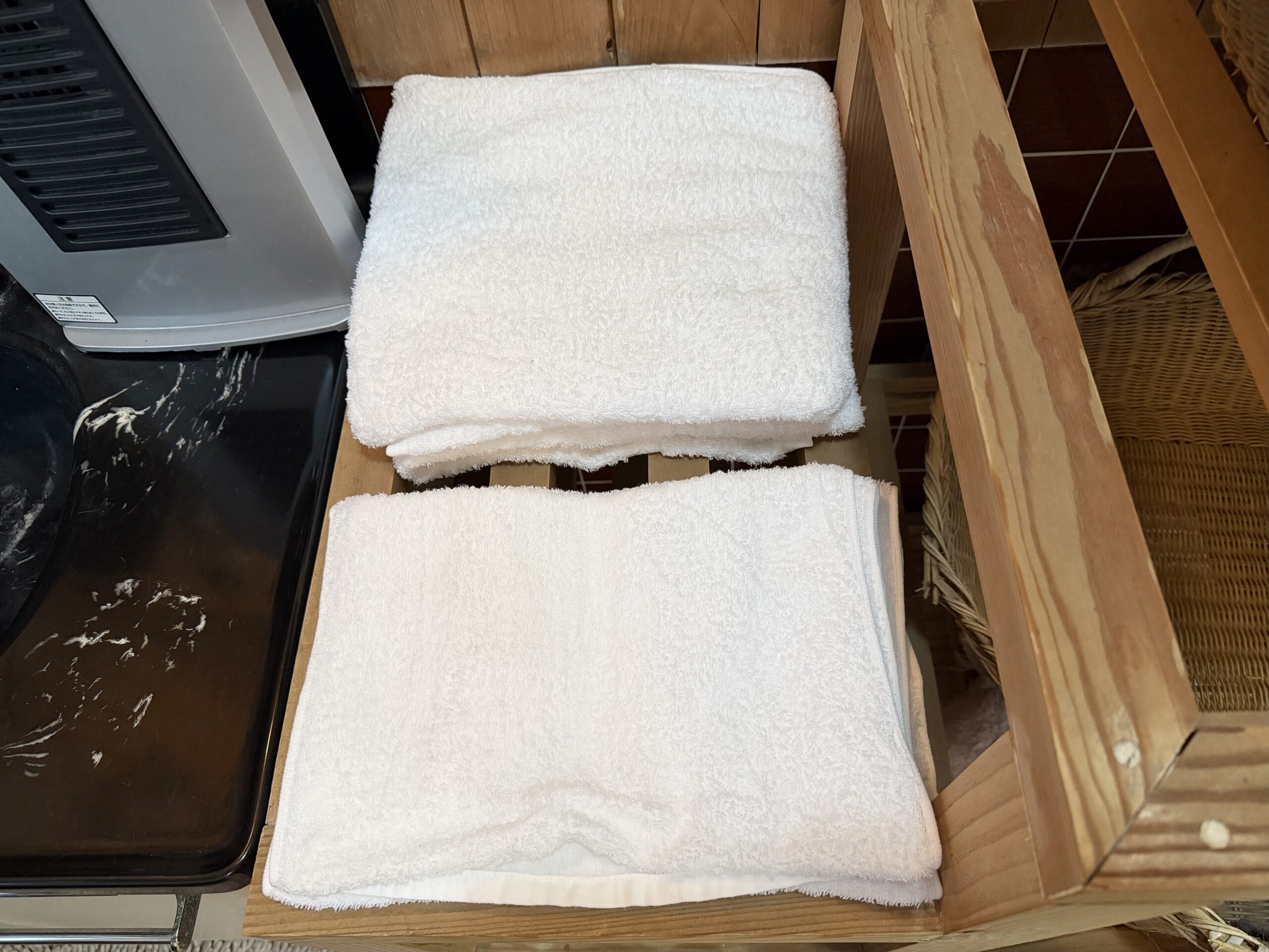 棚に籠、洗面台もあり、こちらにフェイスタオルとバスタオルを用意してくれてる。