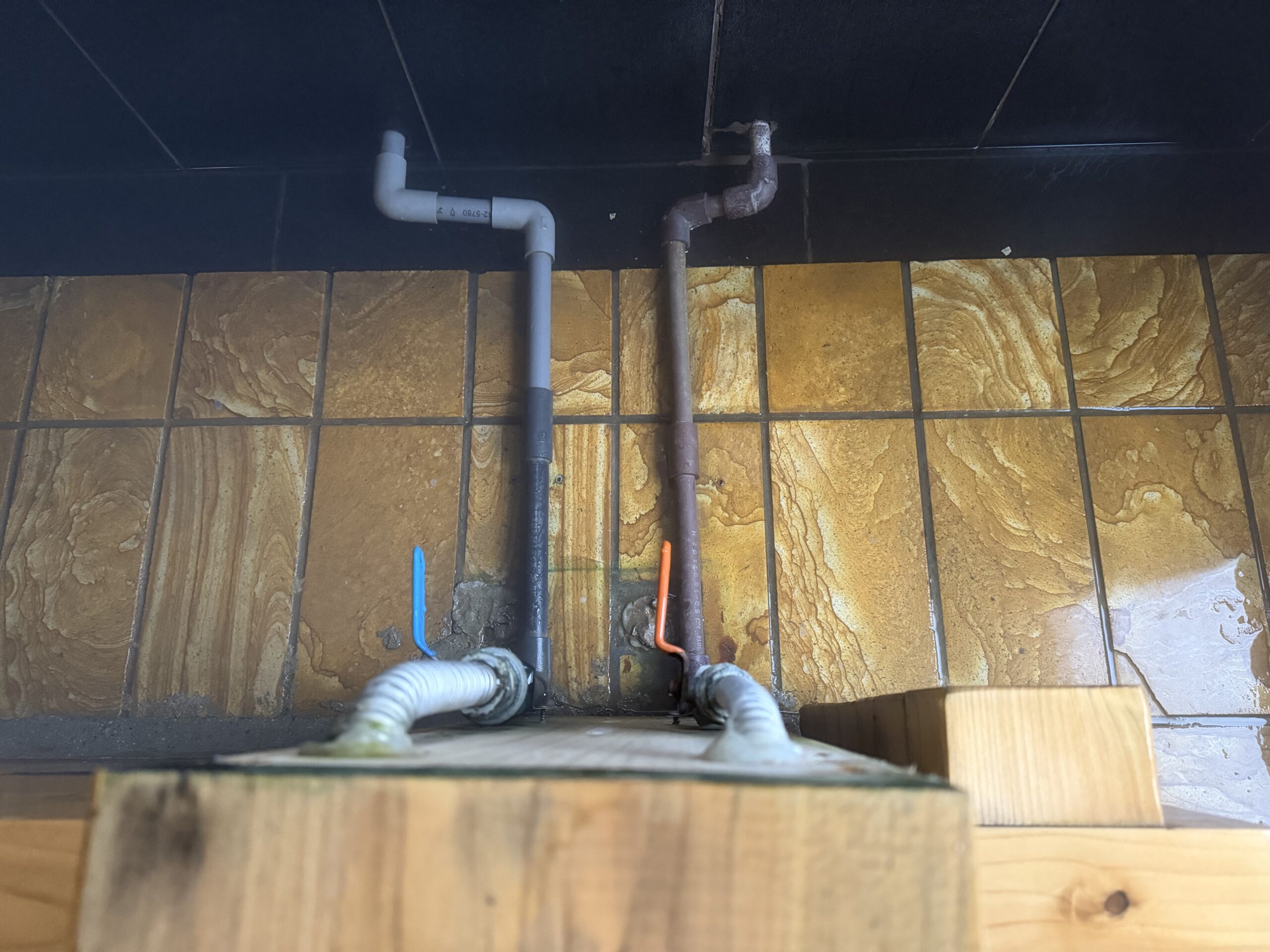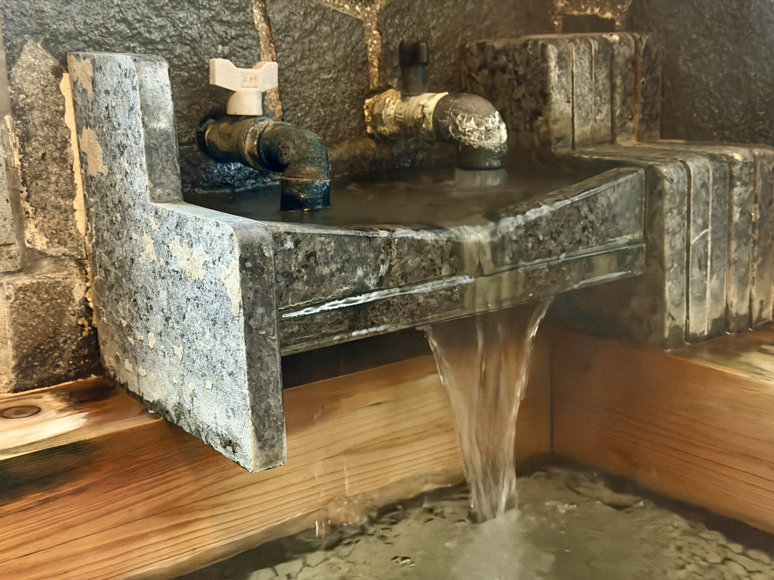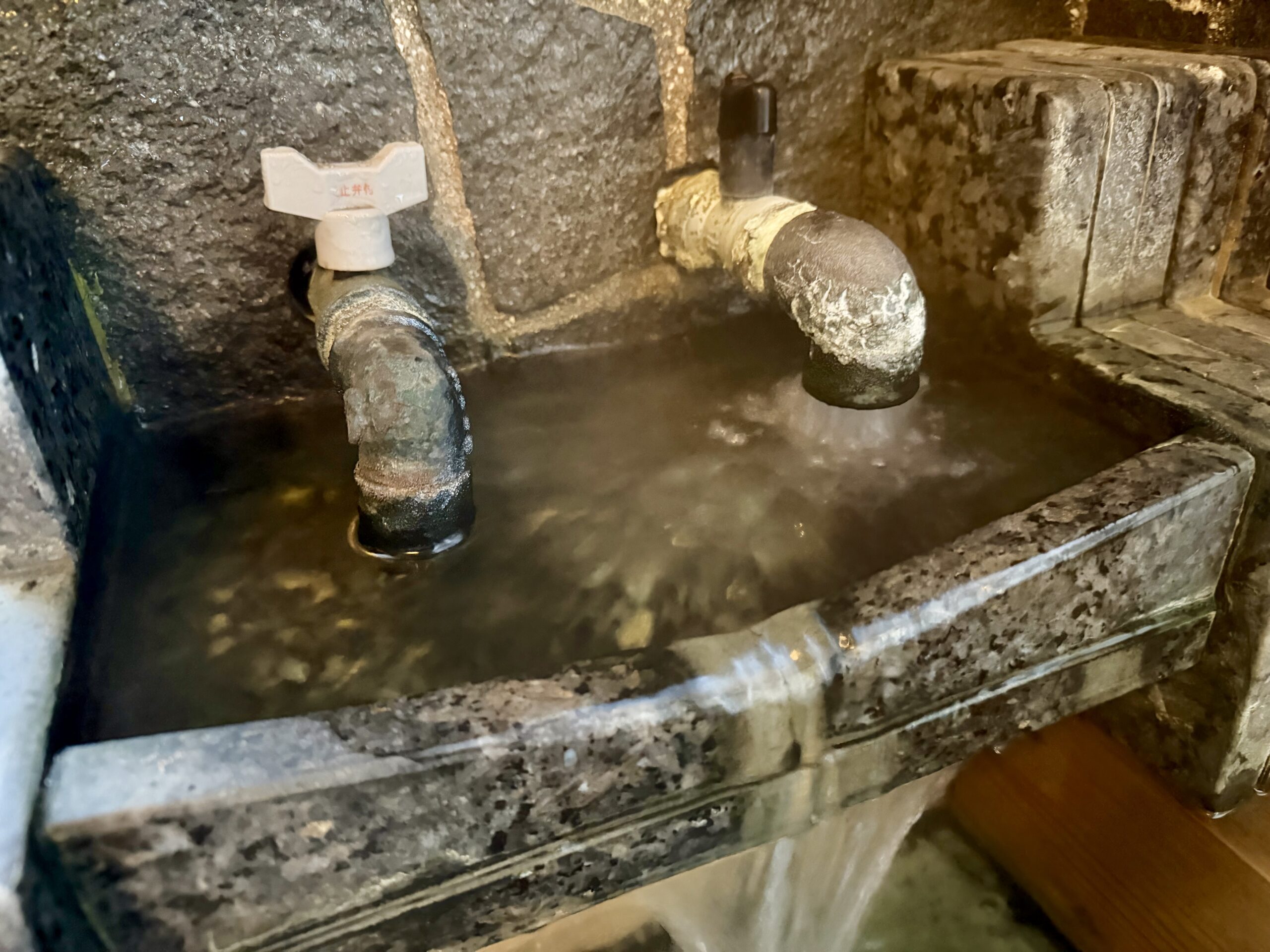 入って湯揉みしたら38度とぬるめなので、加温源泉を足す。右の黒い蛇口が加温源泉、左の白い蛇口が源泉そのもの。