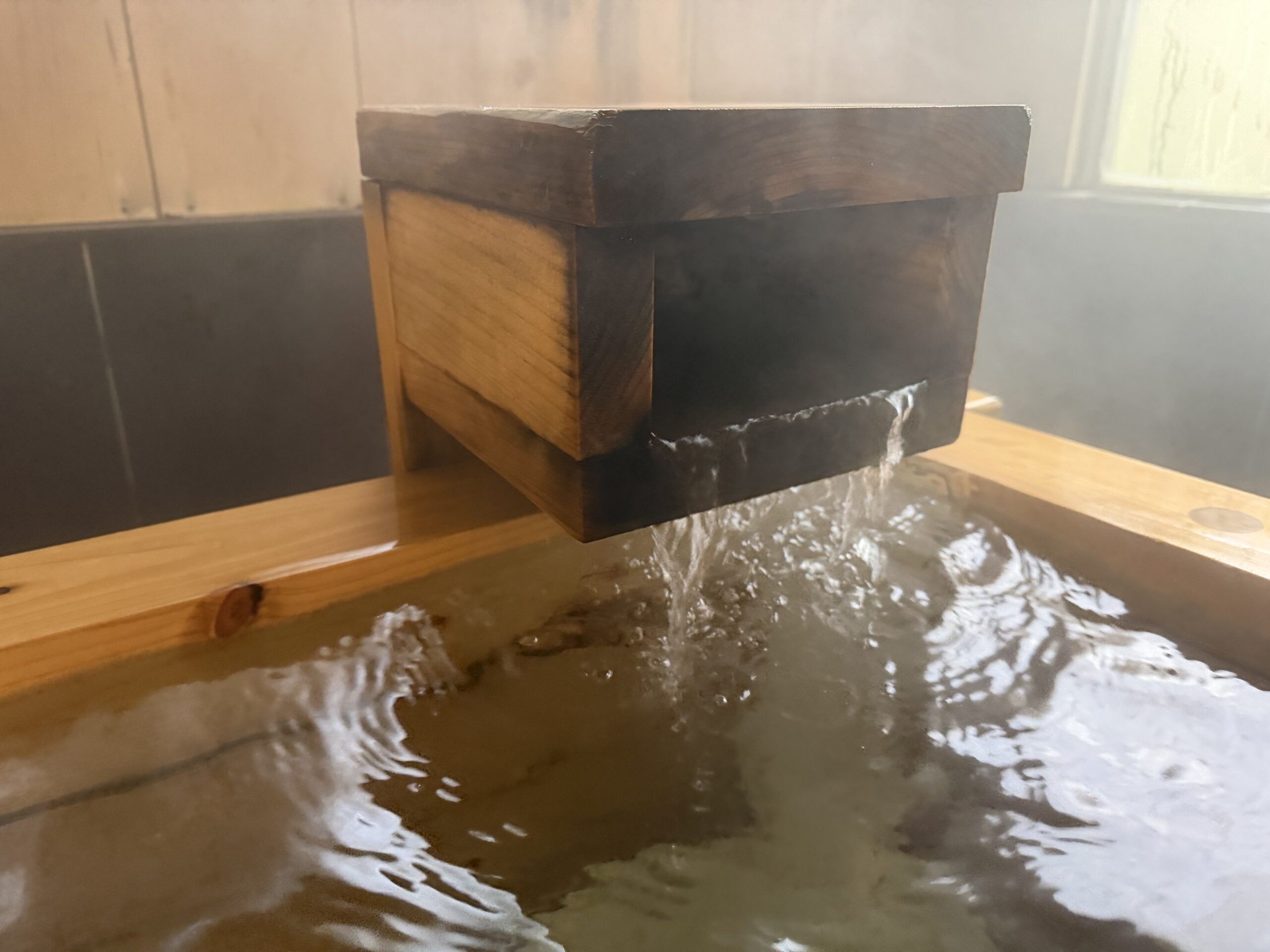 四角い木の湯口から源泉を注げる。隣と同じく、源泉そのものと加温源泉の2つのレバーがあり、自分で調整できる。
