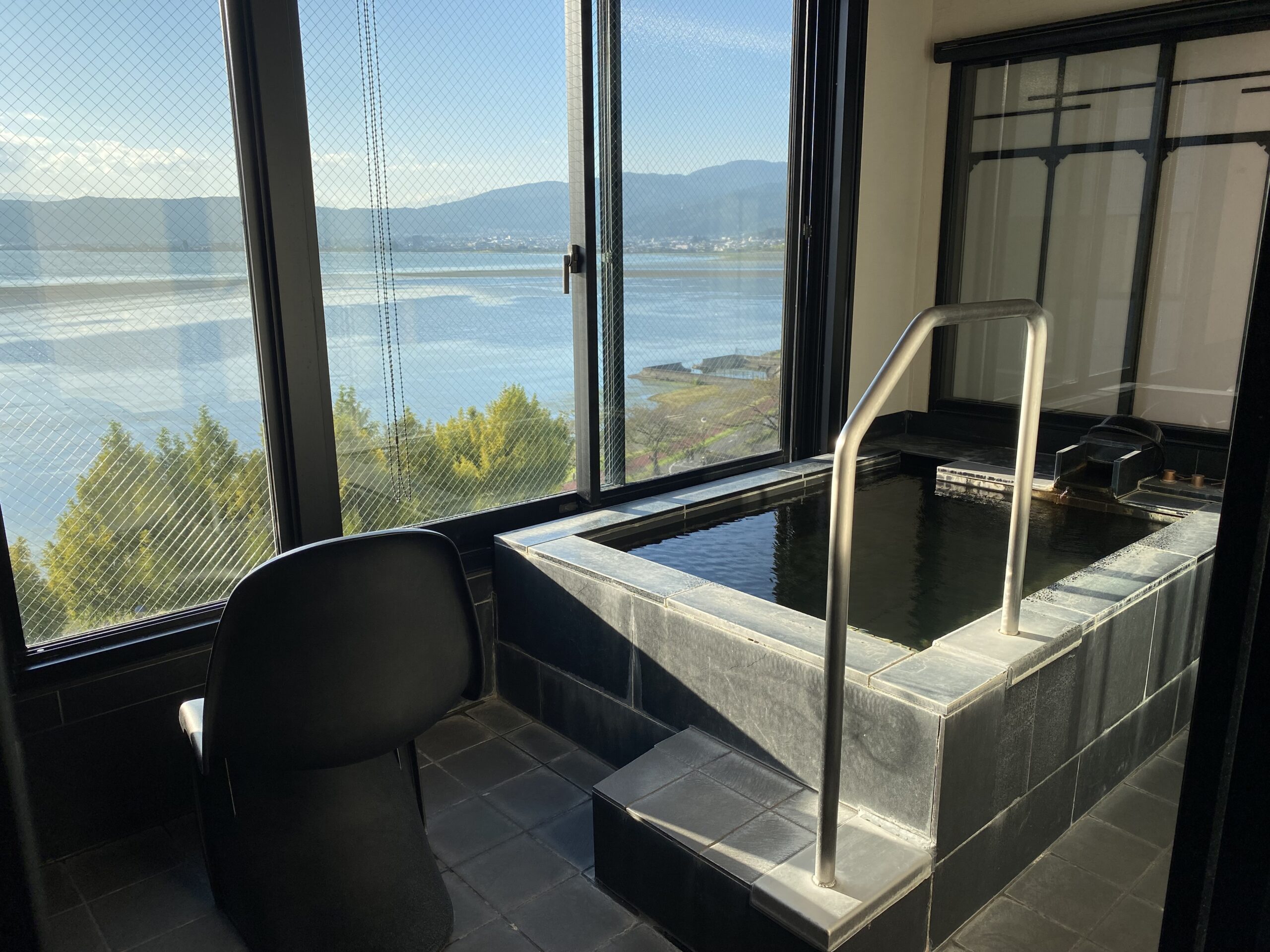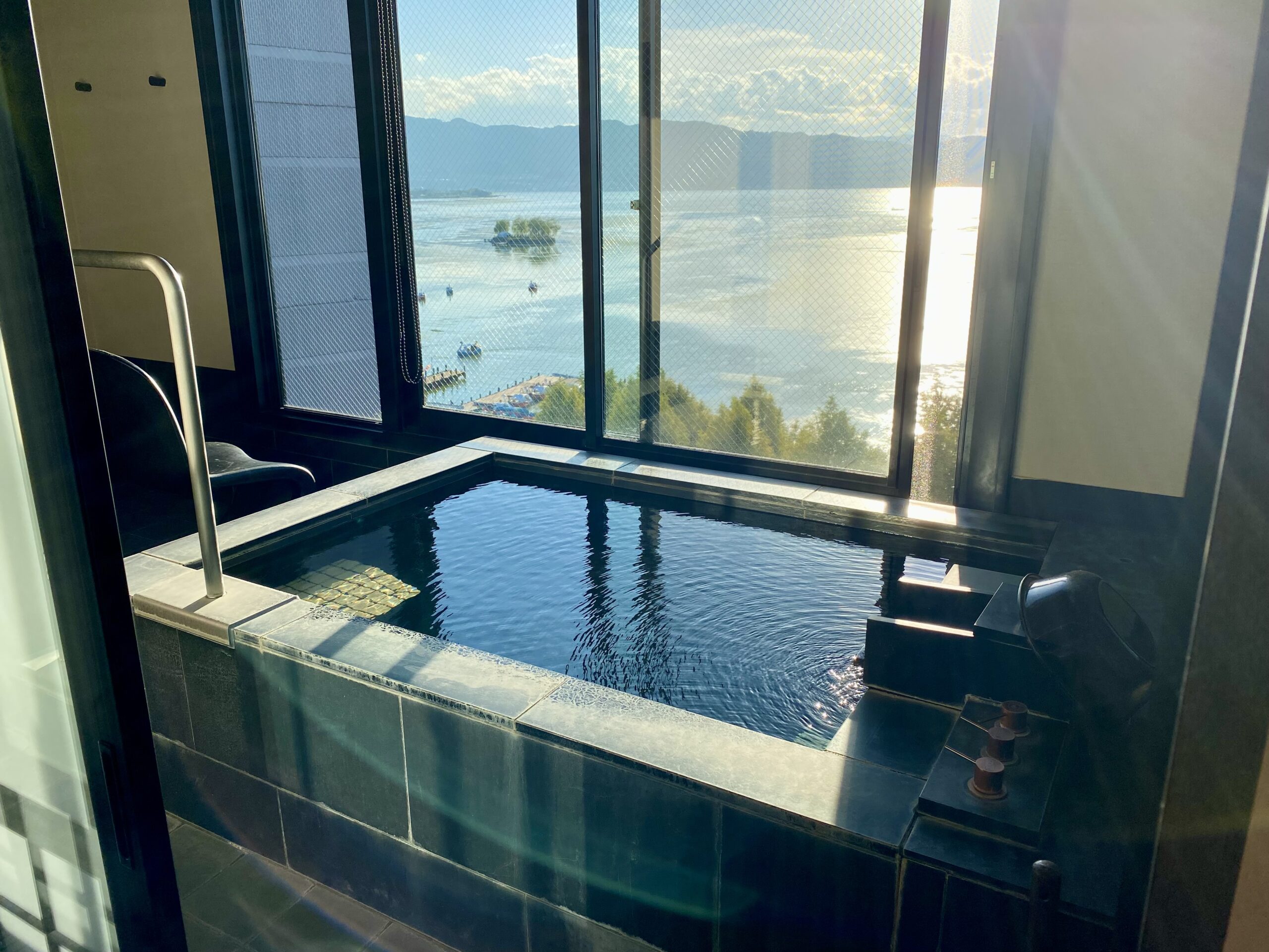 萃suiの並びで、諏訪湖の目の前の立地。元は源湯の宿 緑水という旅館で、名前の通り敷地内に緑色の塚原源泉という自家源泉が湧出してる。