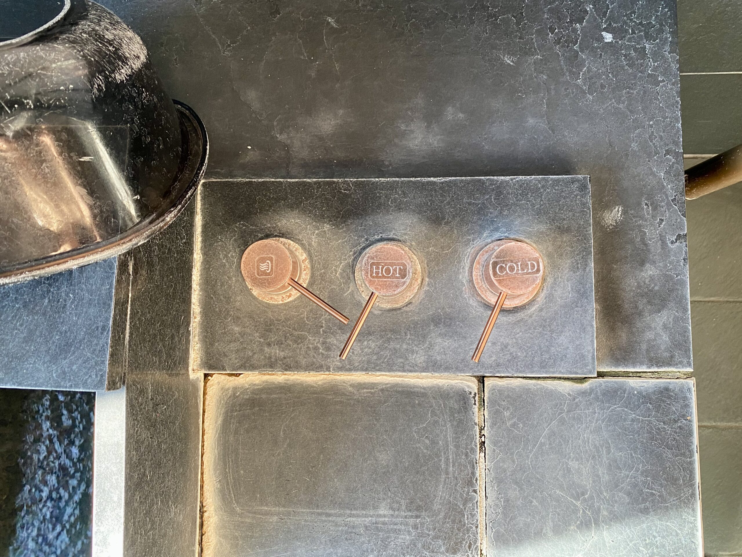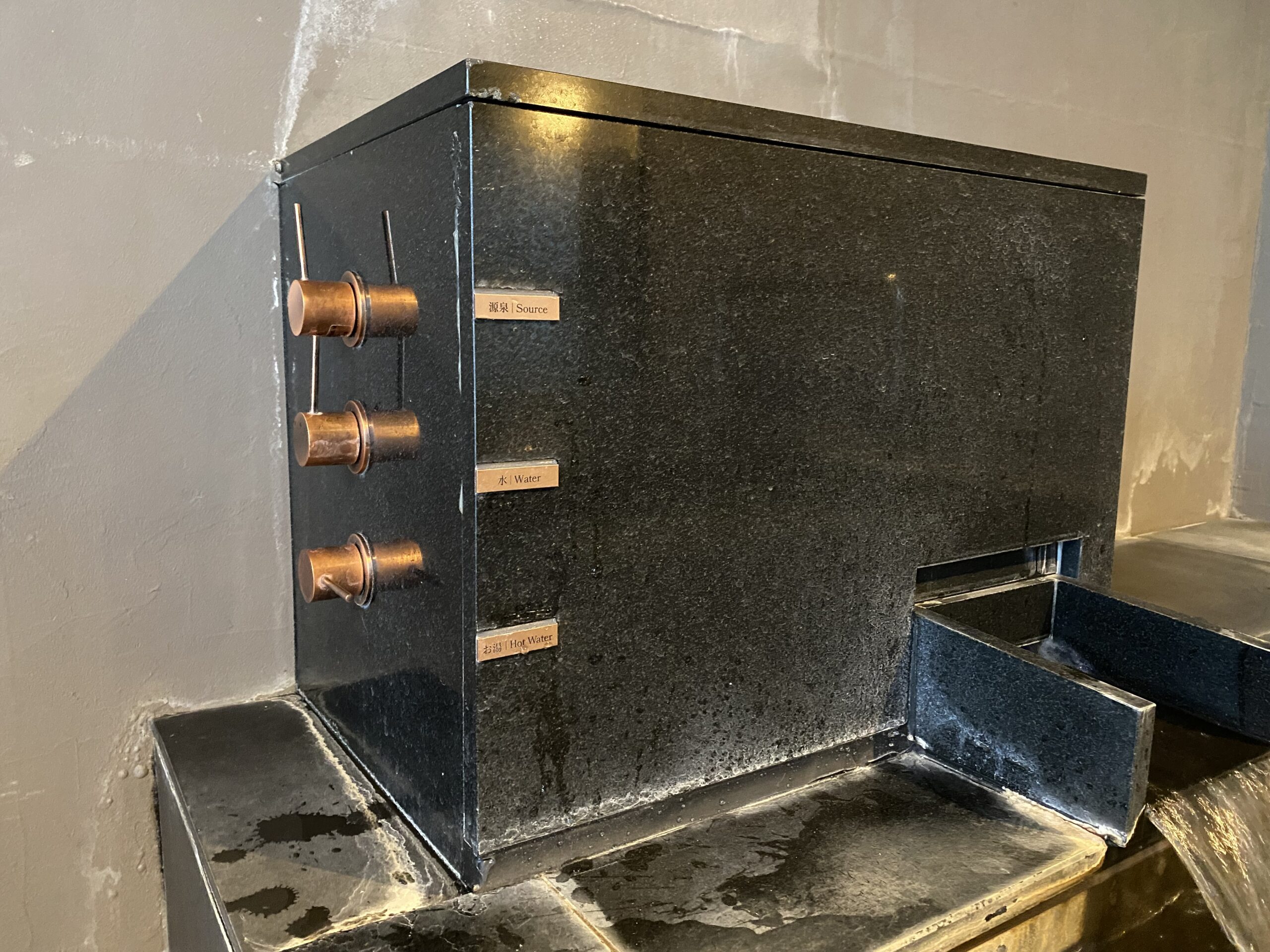 源泉、お湯、水のカランで自由に調整できる優れもの。萃suiの部屋風呂も同じだった。大きな湯船なので、加水し過ぎたら、底の方がぬる過ぎてしまうので注意しながら。