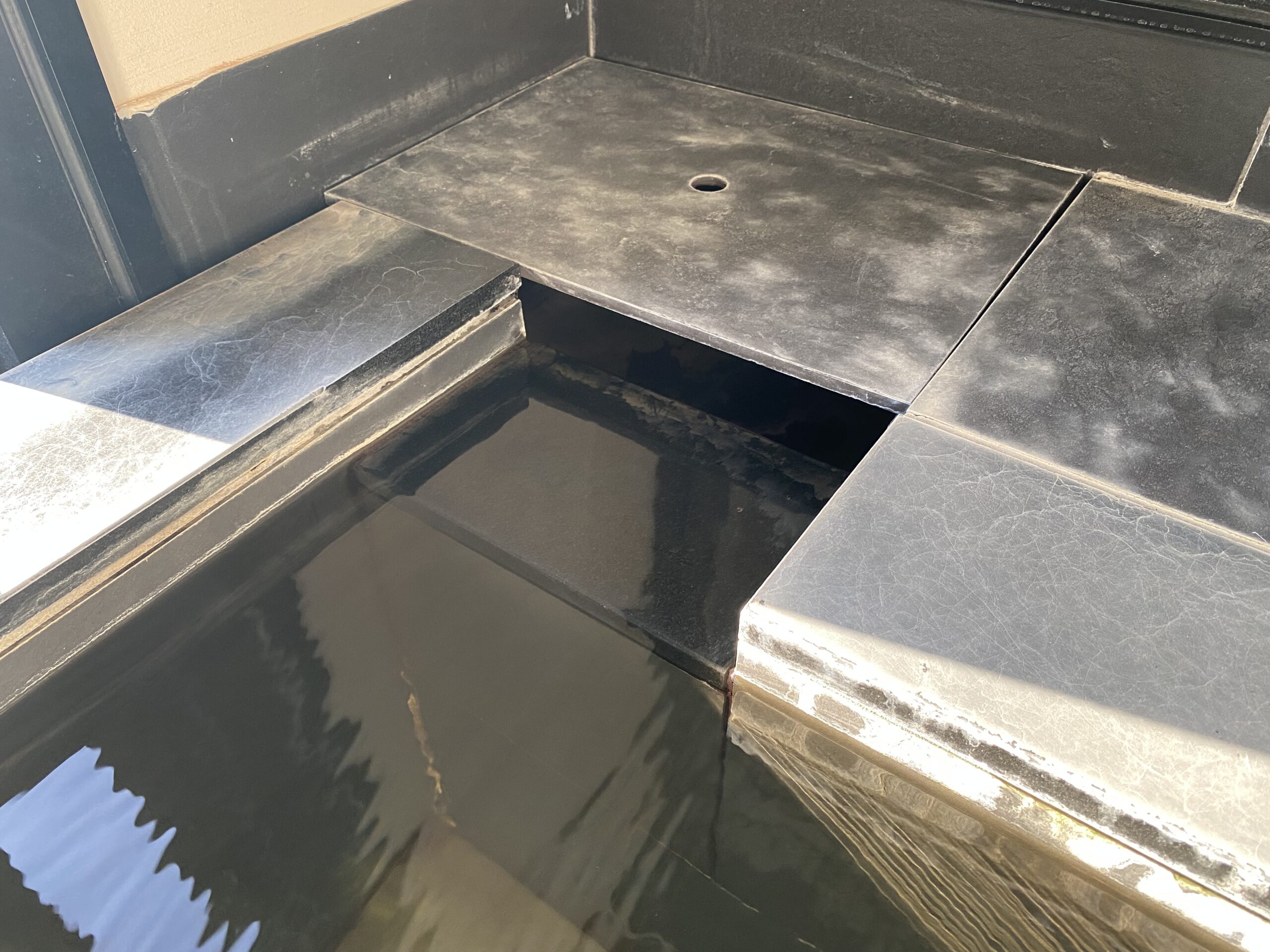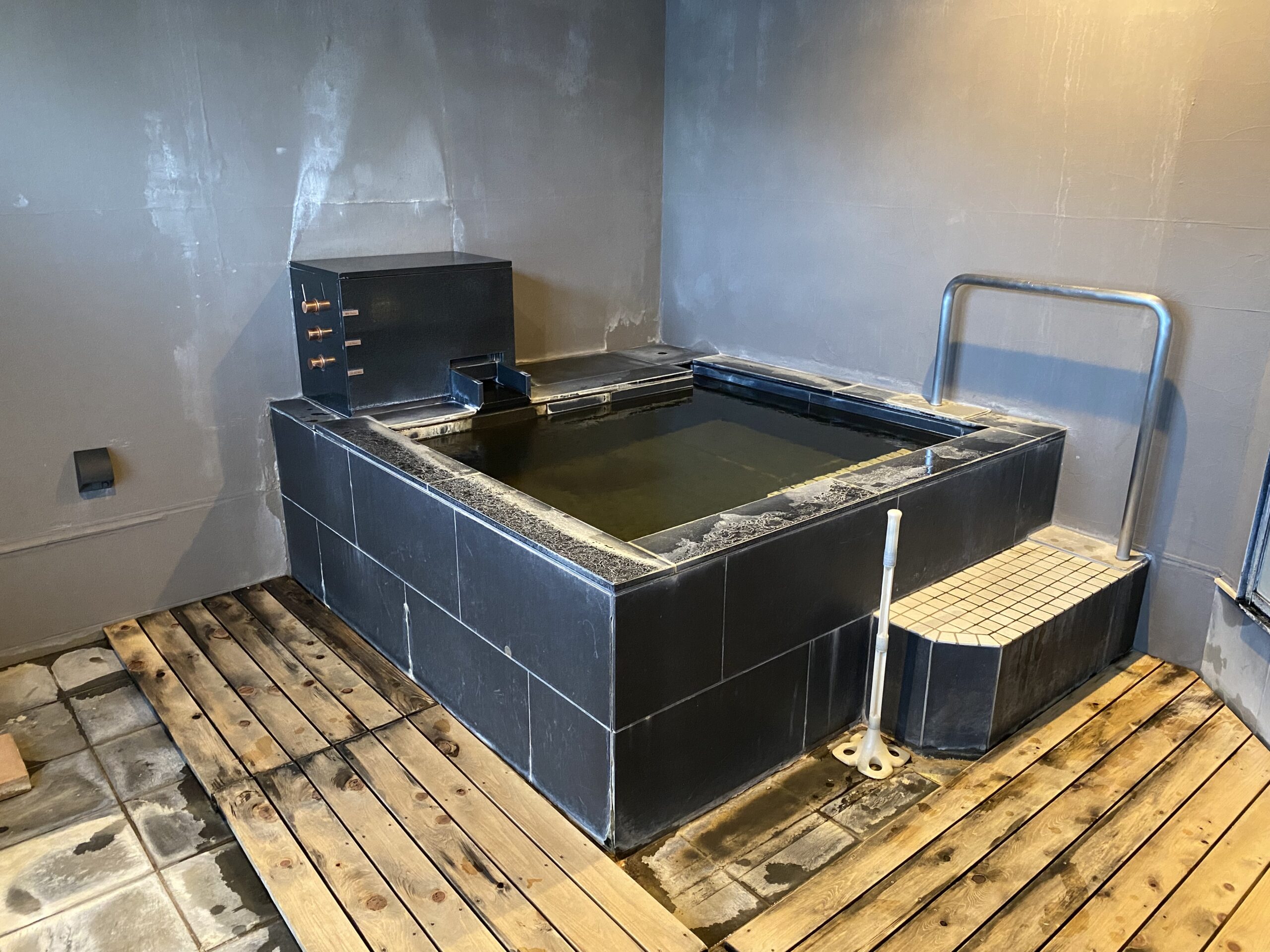 湯口は57.5度、湯船は40.5度とぬるめだった。1組終わるごとにばーっと加水するのかなと思いきや、湯口の横にカランがあり自由に加水できるしくみ。誰がどこで加水したかは分からない。