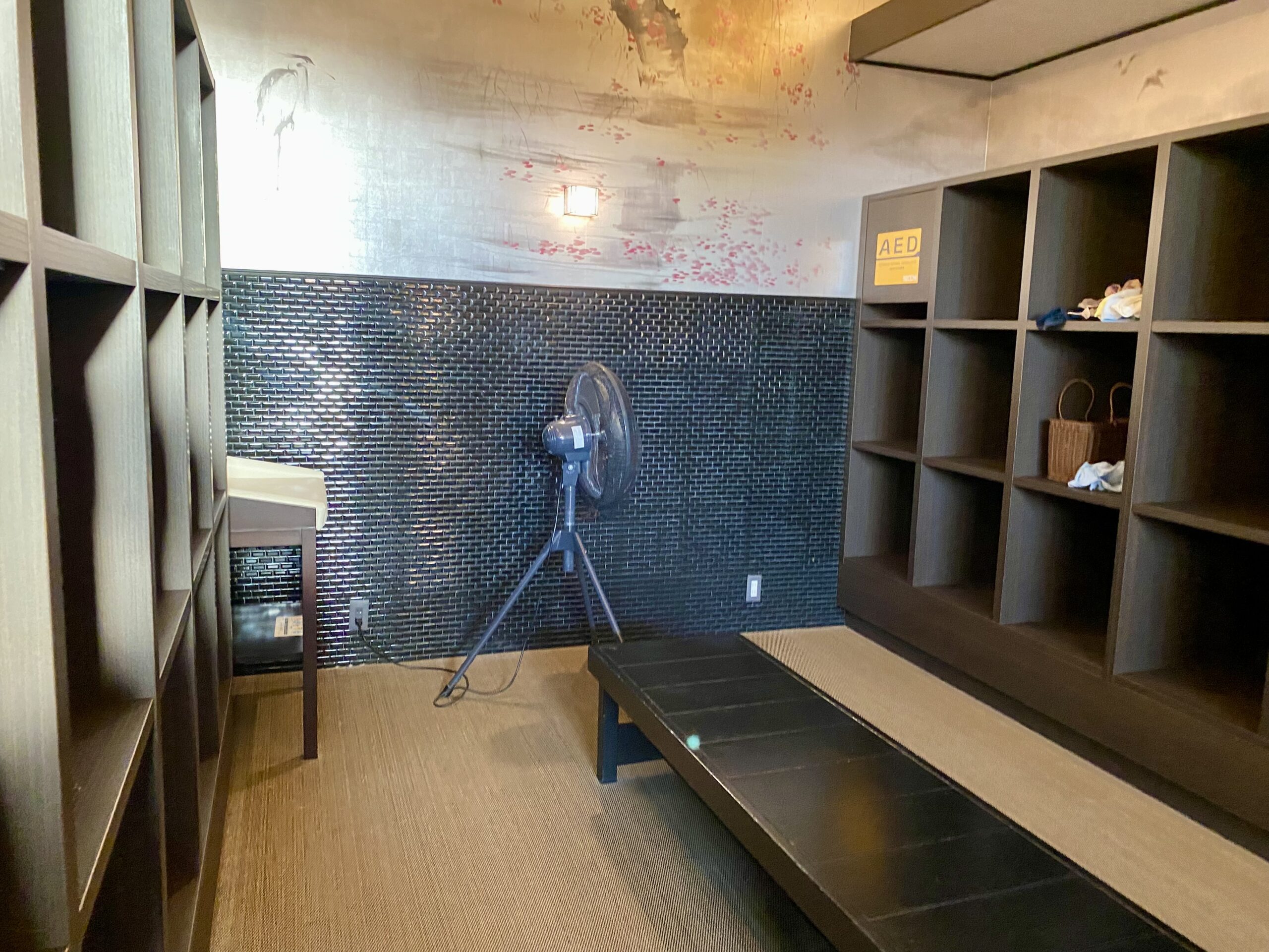 脱衣棚はこんな風で、着替えエリア以外のスペースが特に広い。