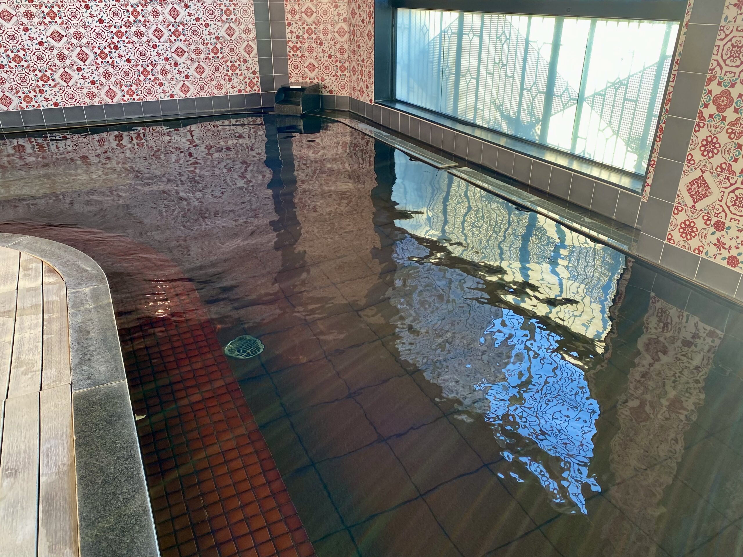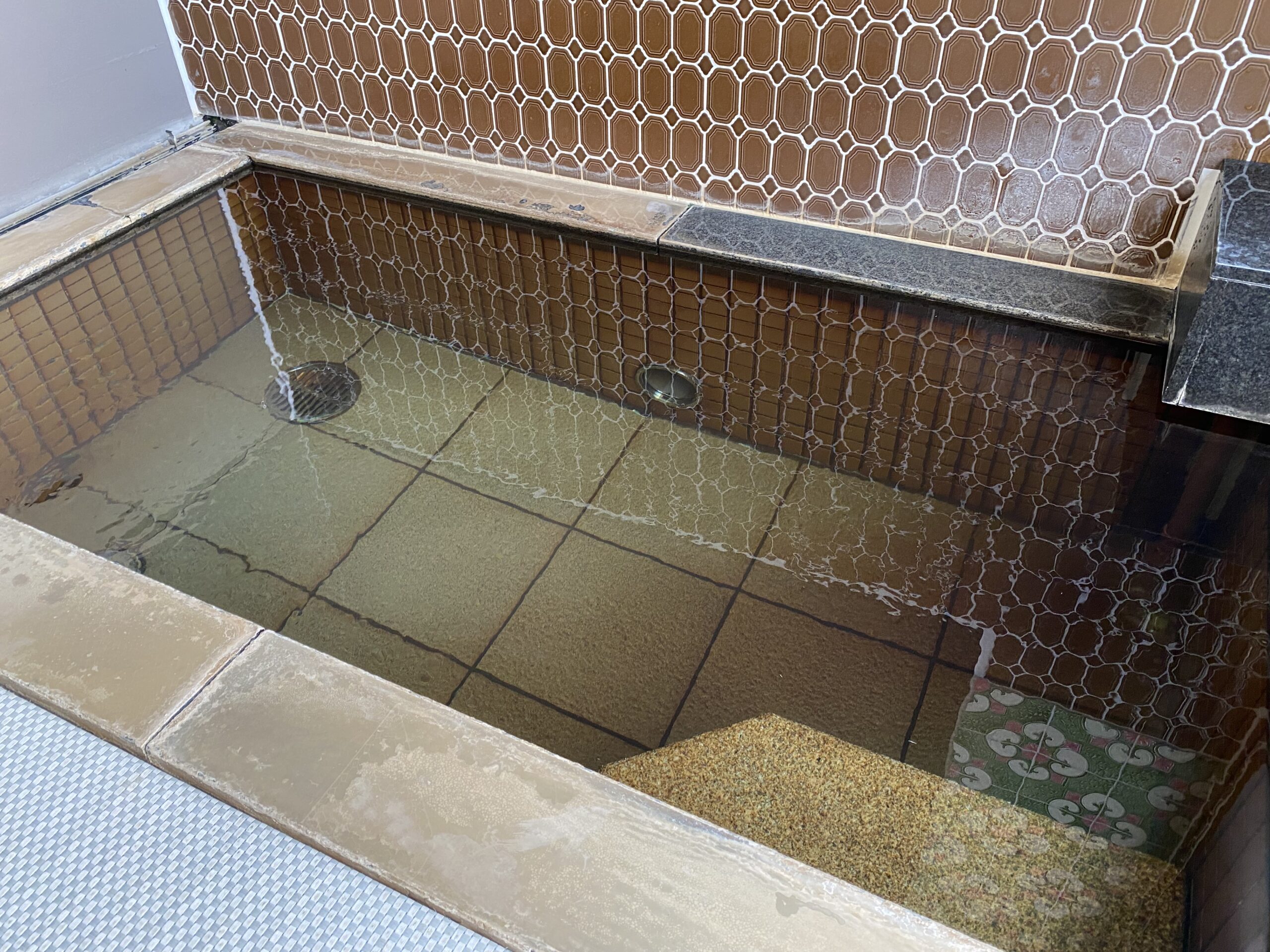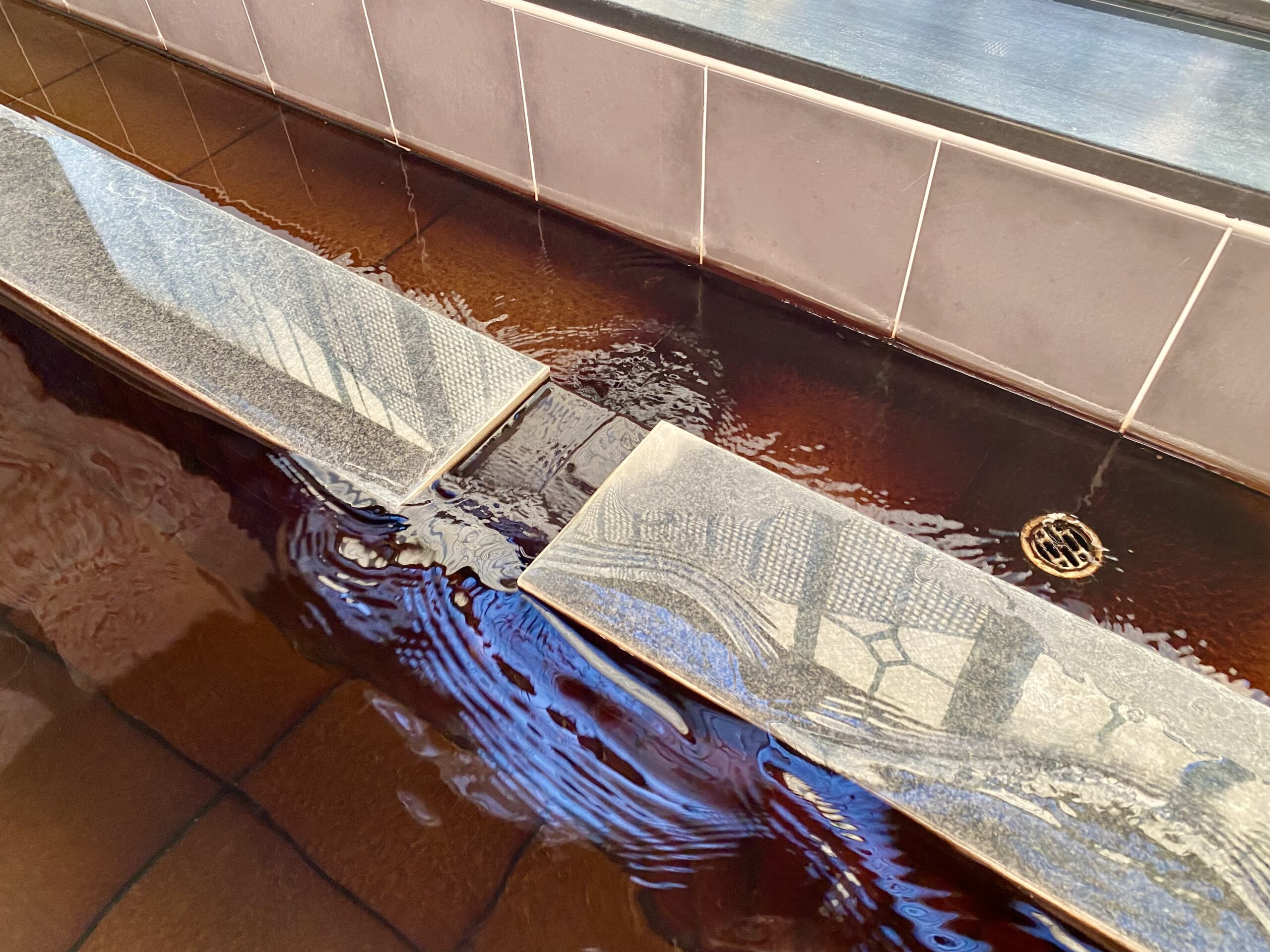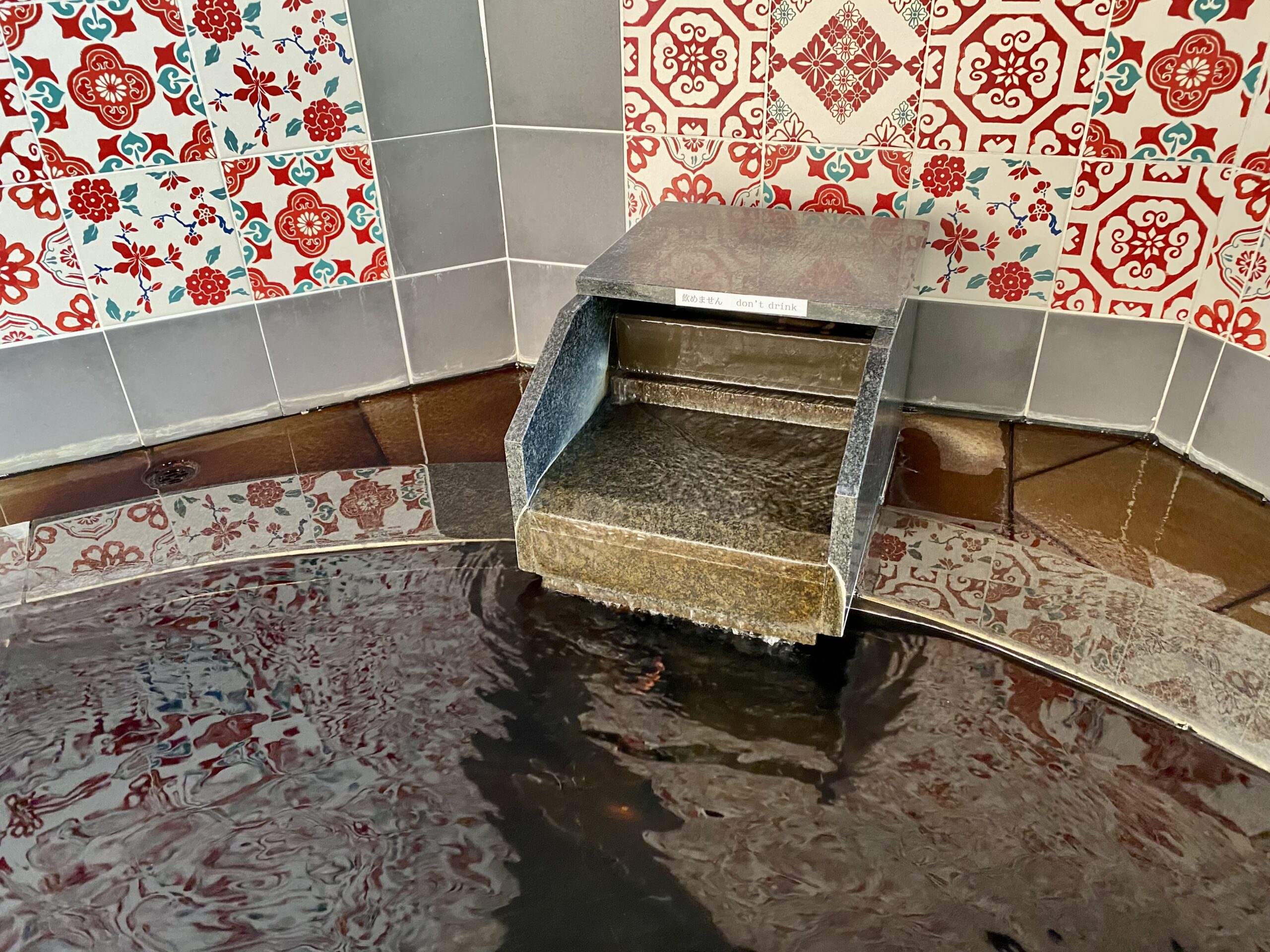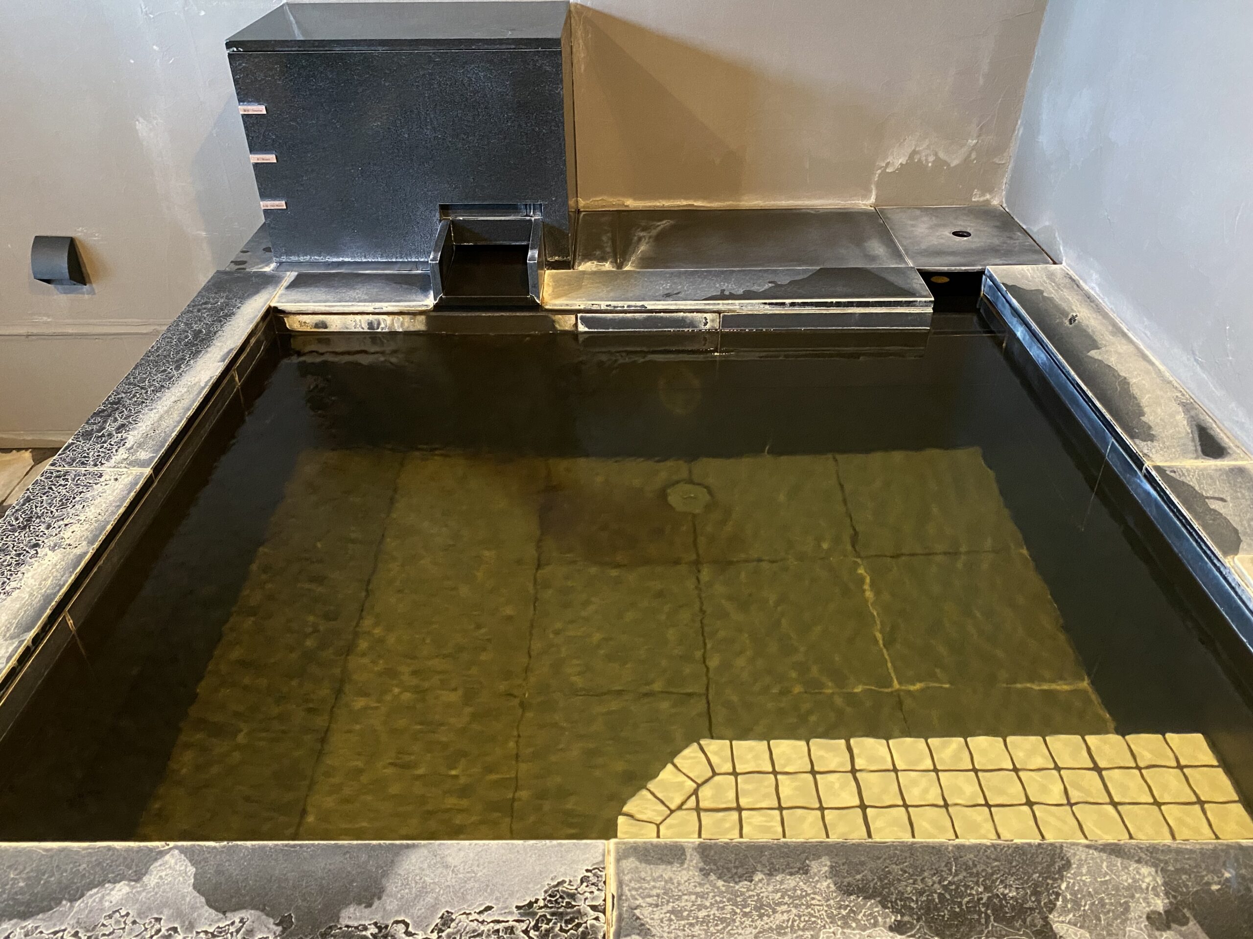 緑色ではなく琥珀色に見えるお湯。タイルが反射してるのもあるのかな。緑色だと思いってたから、少し驚く。