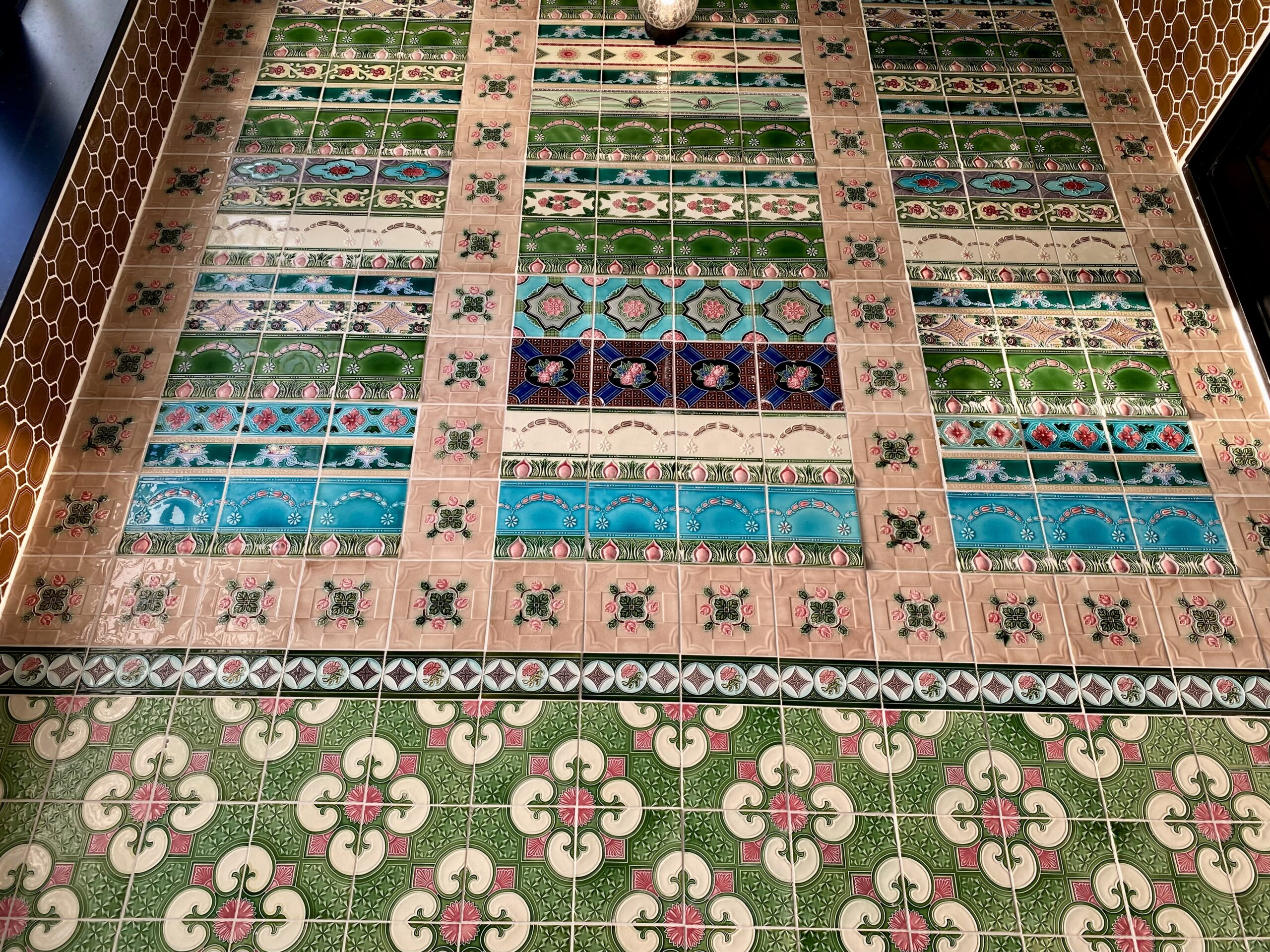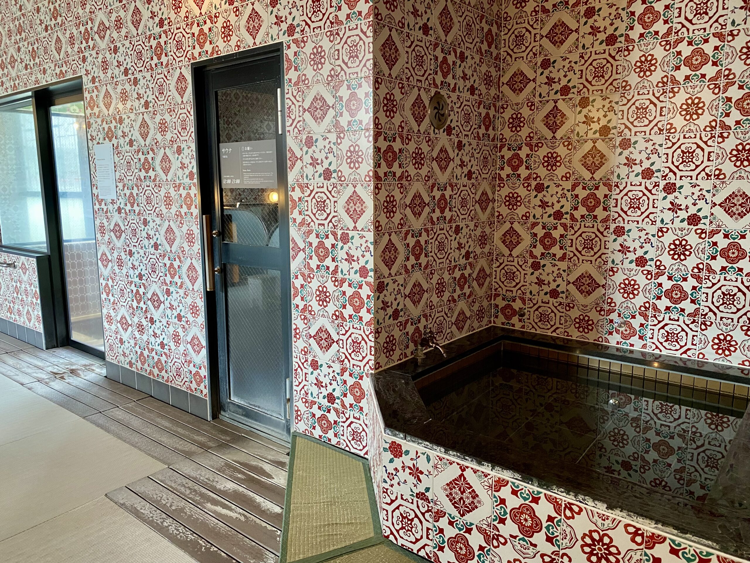 圧巻のアンティークタイルを眺めながら入る。内風呂とほぼ同じ40.5度強。