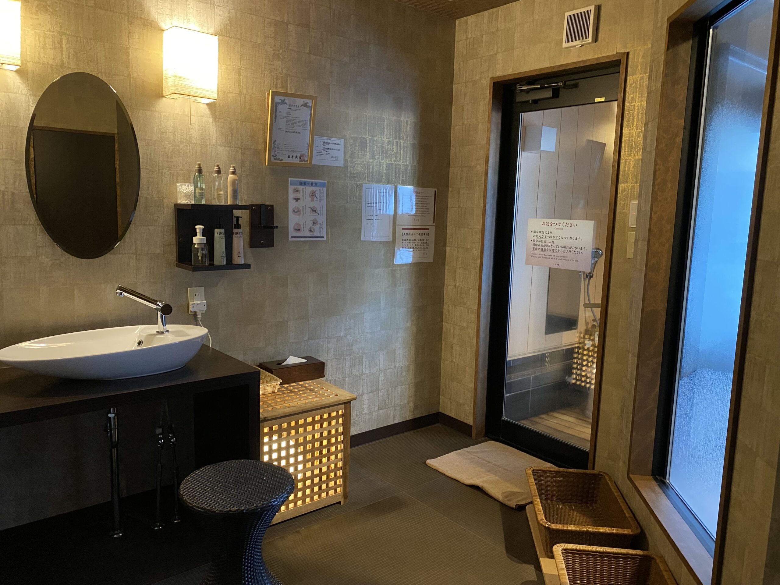 広い脱衣所。下足箱にはスリッパ入れたい人用にナイロン袋がある。お水以外にかりんジュースがあり、つい飲んでしまう。