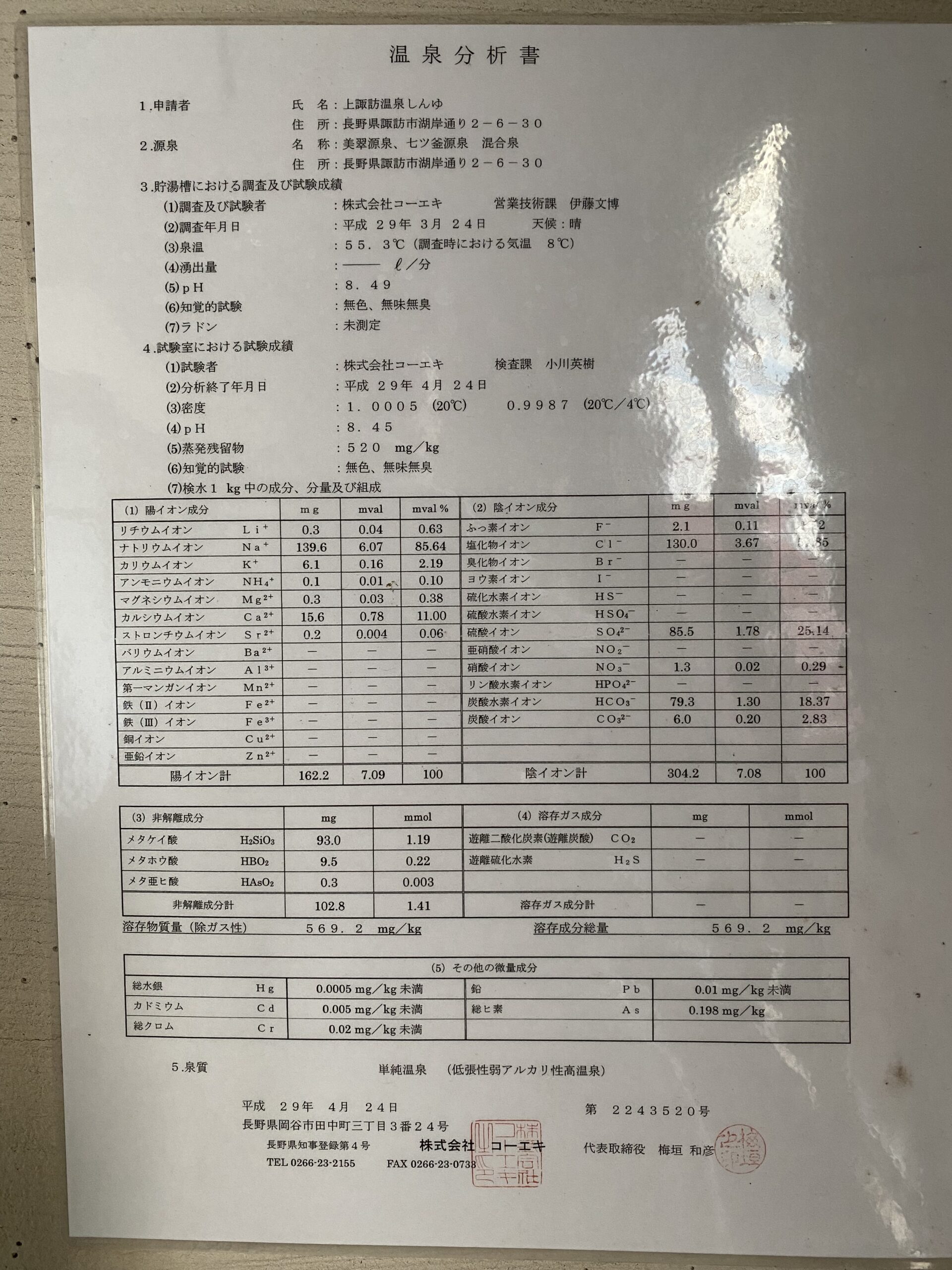 pH8.49の弱アルカリ性の単純温泉。1日50tの豊富な湯量は上諏訪温泉で唯一、とHPにあるので、毎分34ℓくらいか。それでは足りなくて、5%でも七ツ釜源泉を混ぜるしかないのかな。