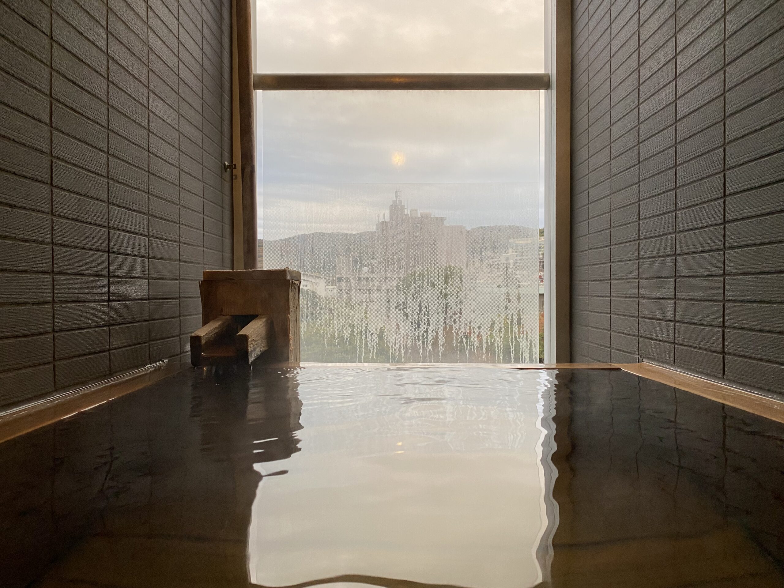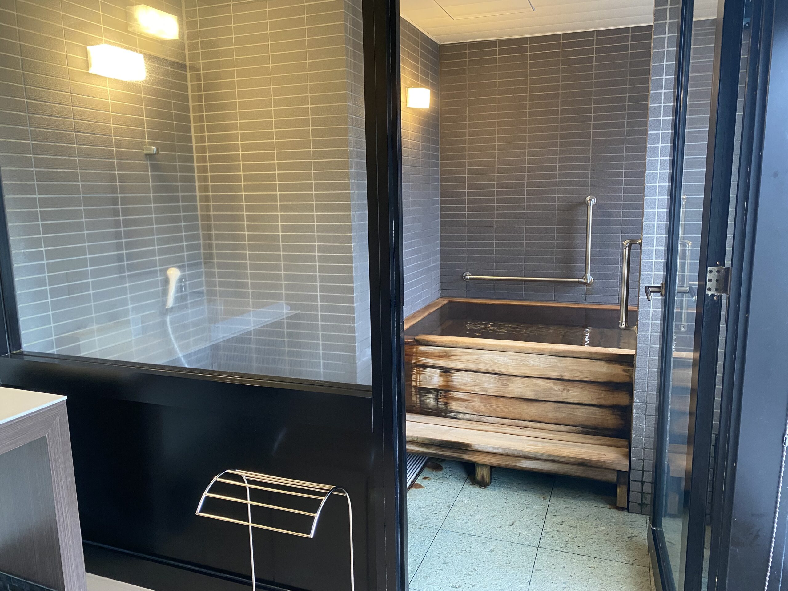 4~6階のプレミアムルーム(5室)には、源泉かけ流しのオープンエア檜風呂がついてる。
