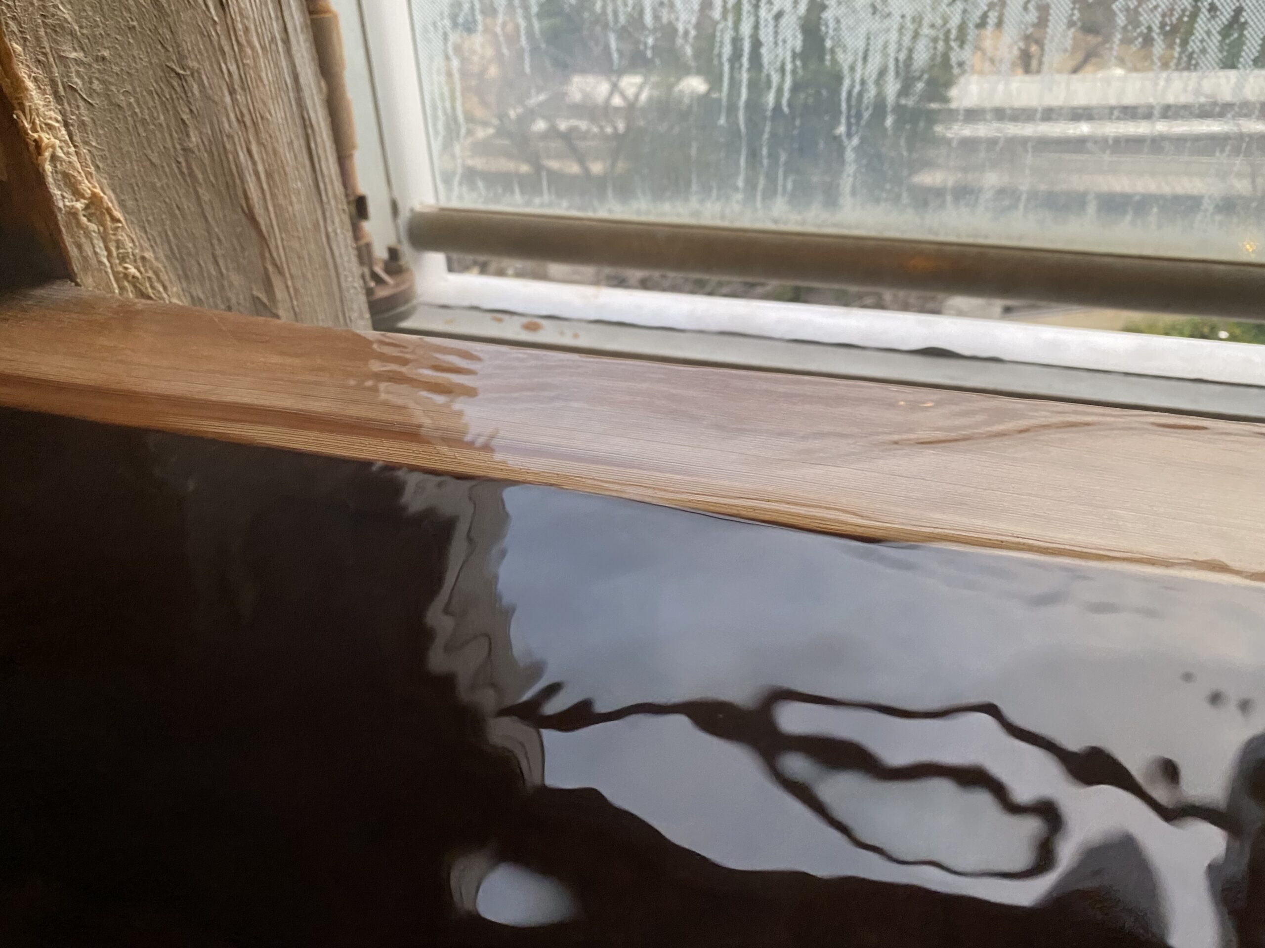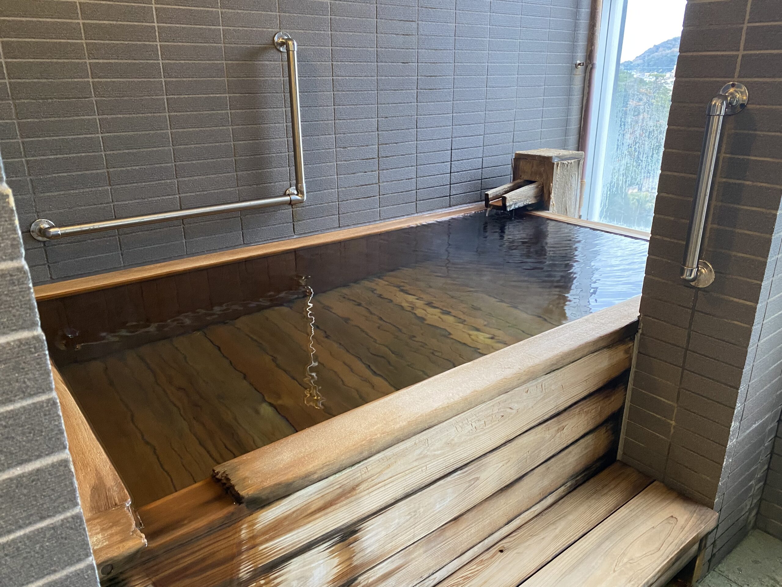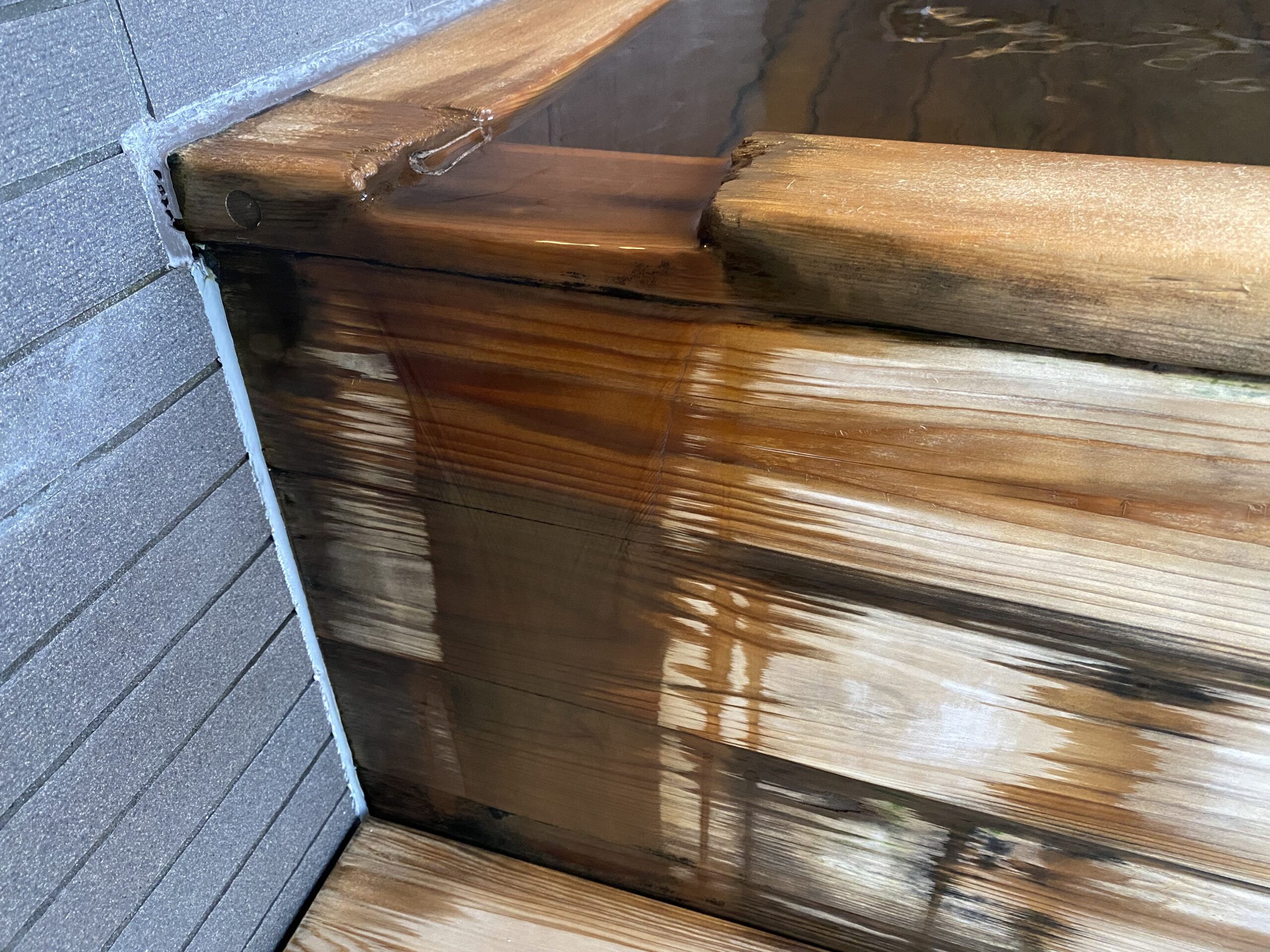 とろりとした濃いお湯で肌はねっとり。檜だからかふわり感がある。塩化物泉らしい茶色の湯の花が少し。