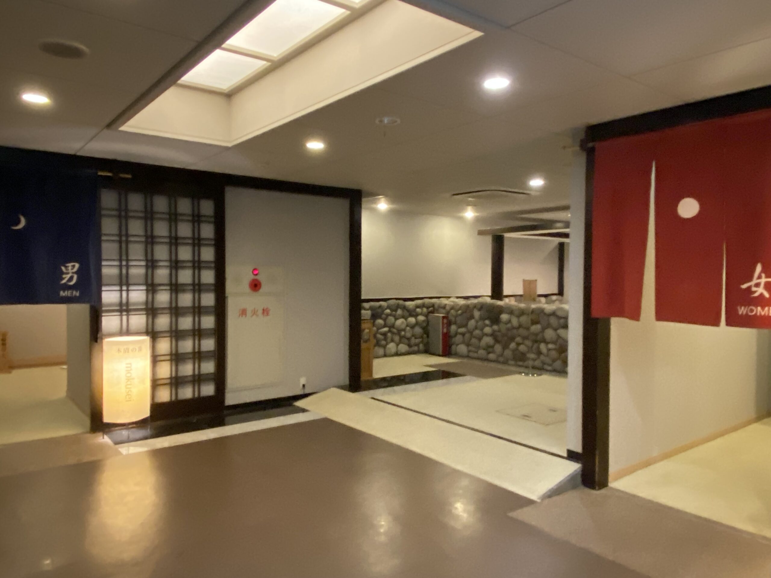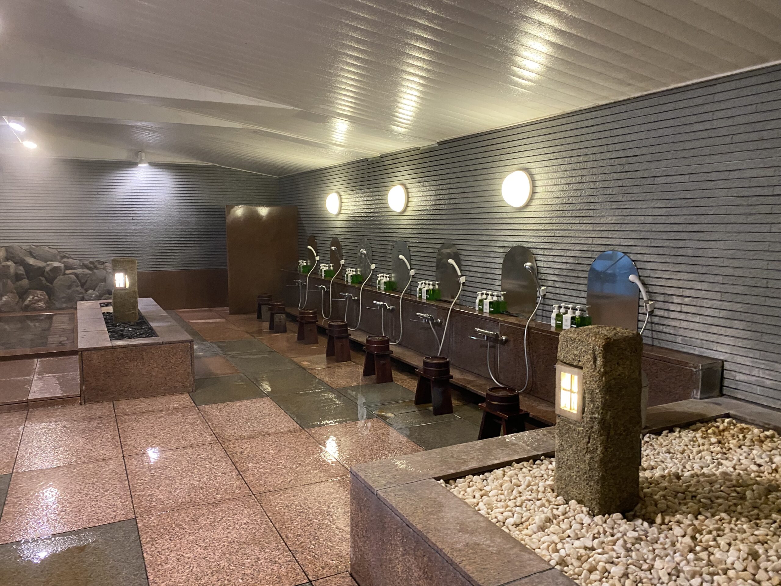 地下1階の大浴場。利用時間は翌朝11時まで。早朝4時から5時まで男女入れ替えで入れない時間。手前が「石華の湯」。