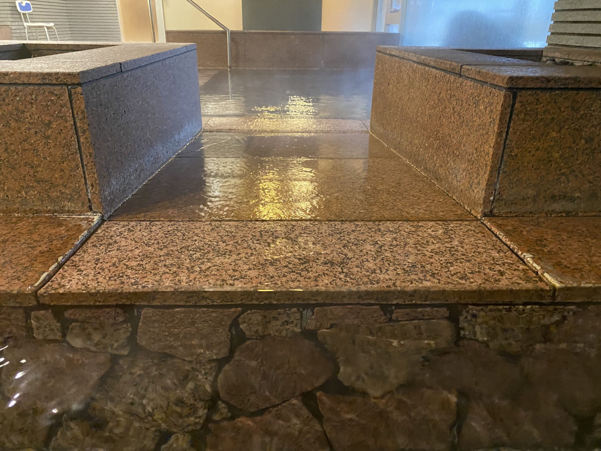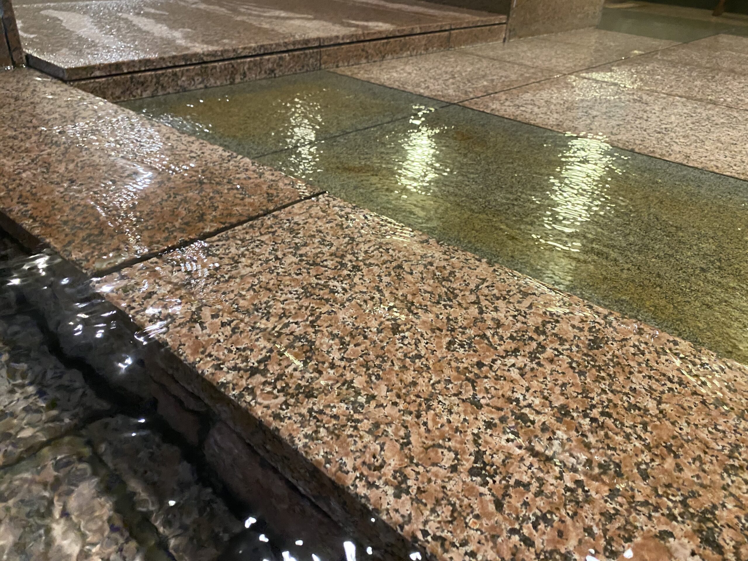 湯船から溢れたお湯が洗い場へ流れてる。やはり清潔な気持ちのいい浴室。こちらも2つの湯船に分かれてる。