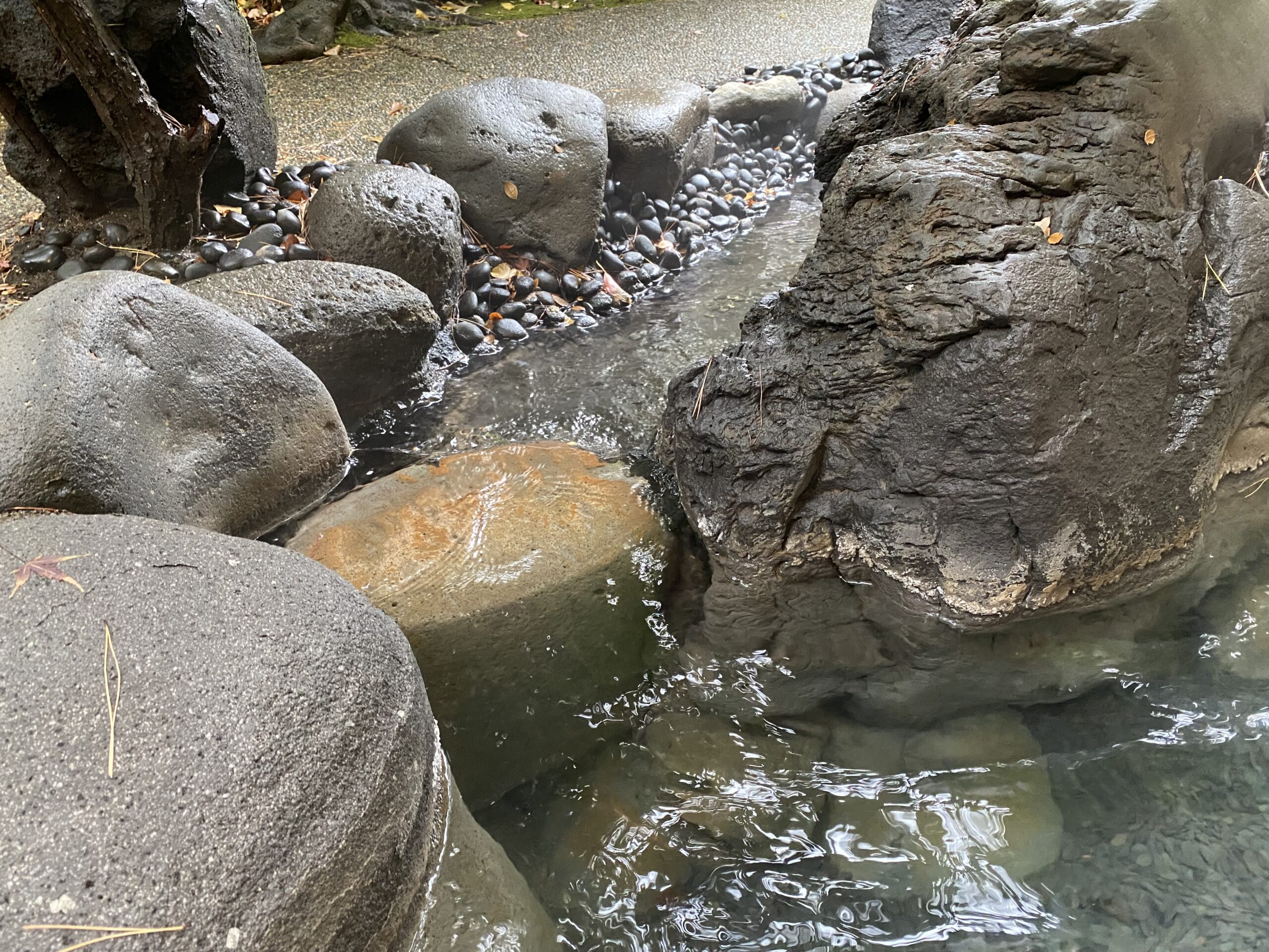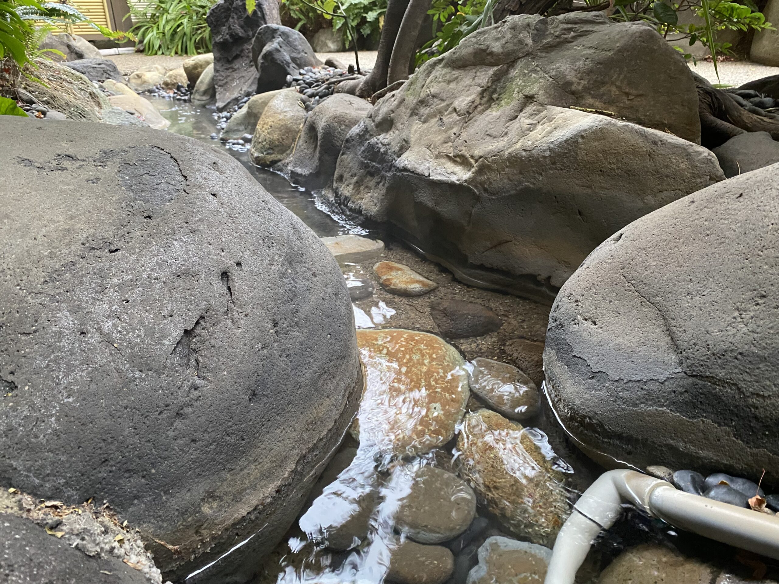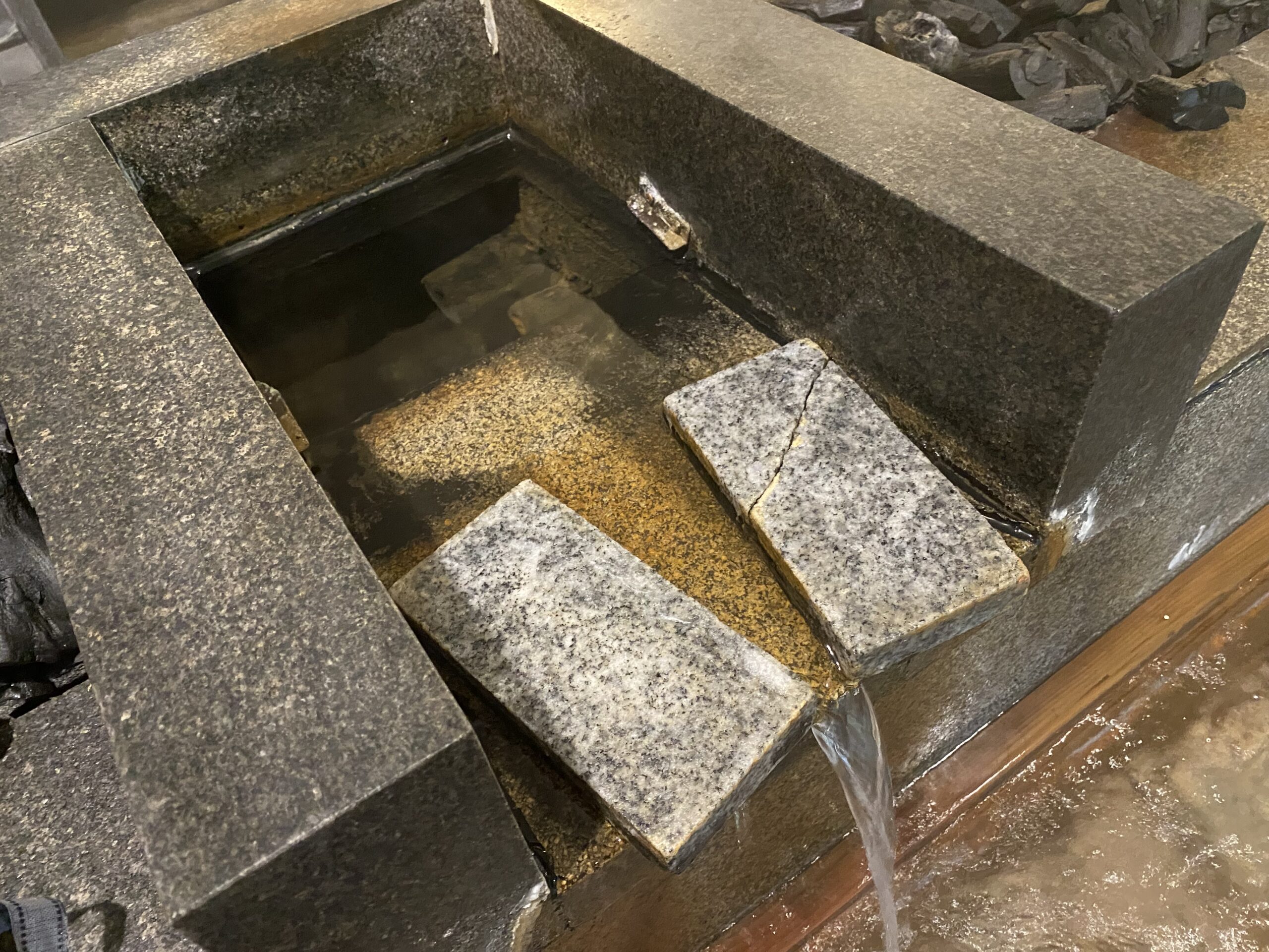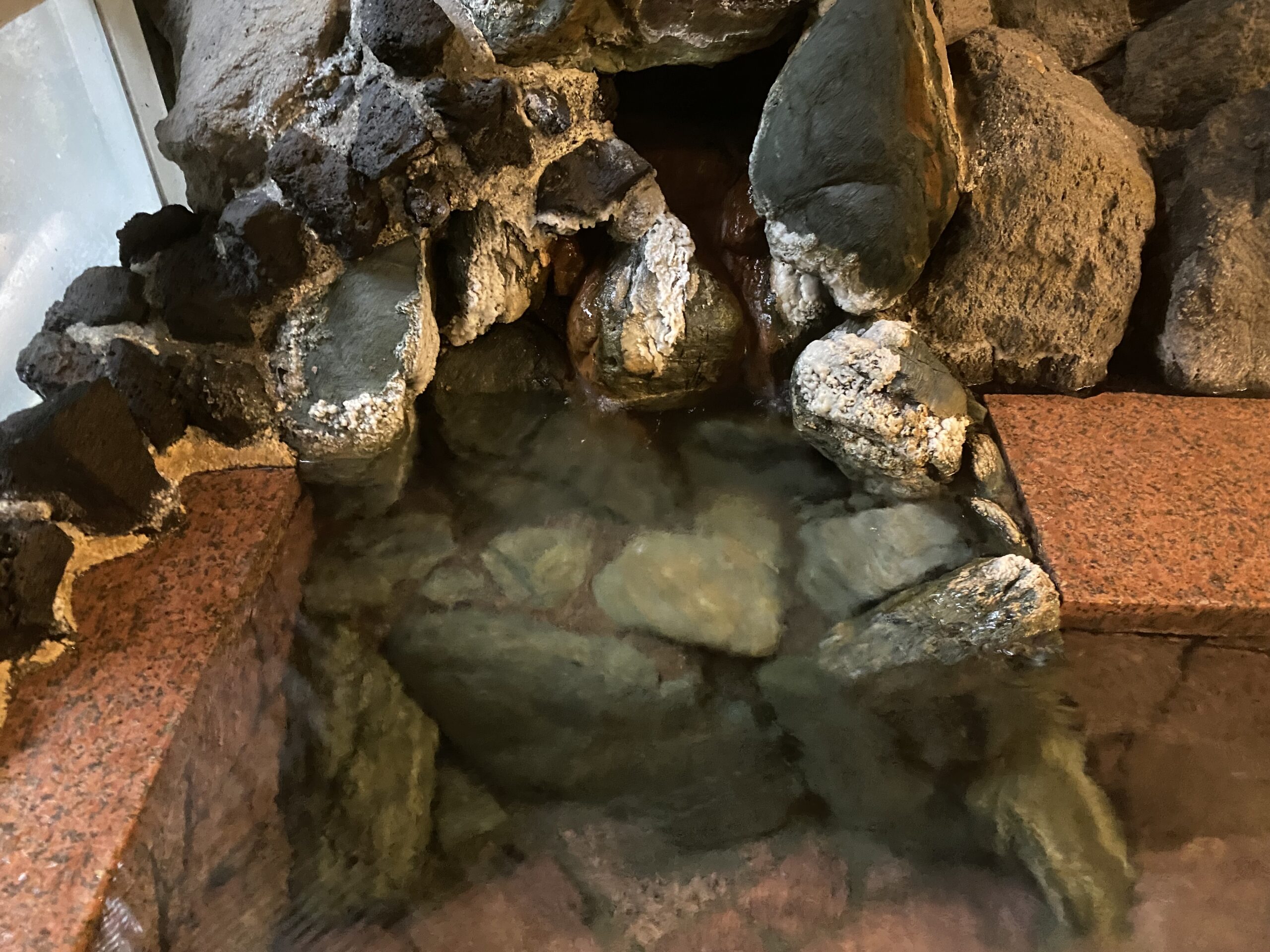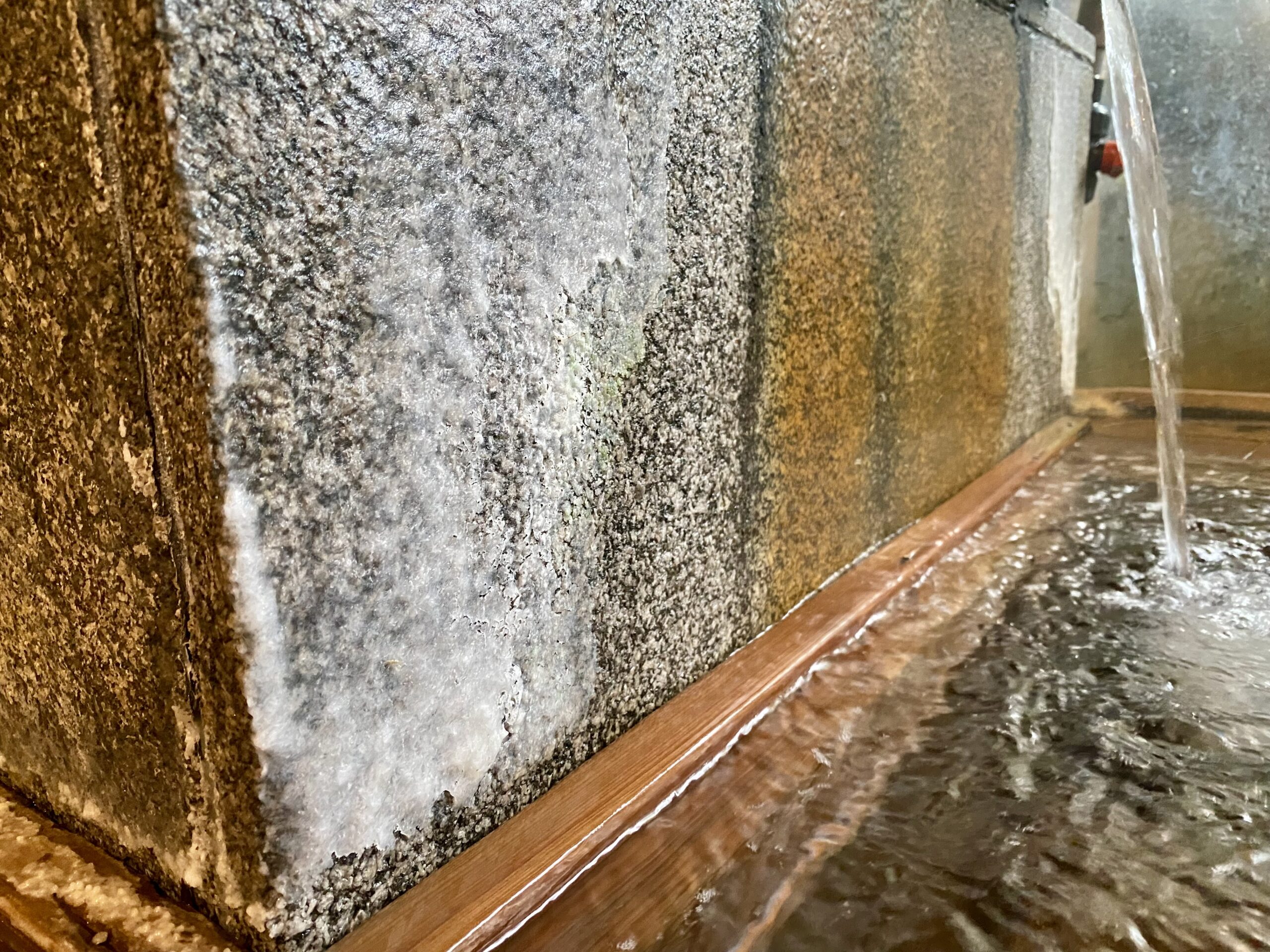 奥の湯船に石で囲まれた湯口があり、49.5度の加温源泉が注がれてる。かなりしょっぱくて、苦みもある。石に出来てる白い析出はカルシウムだけじゃなく塩由来なのかな。