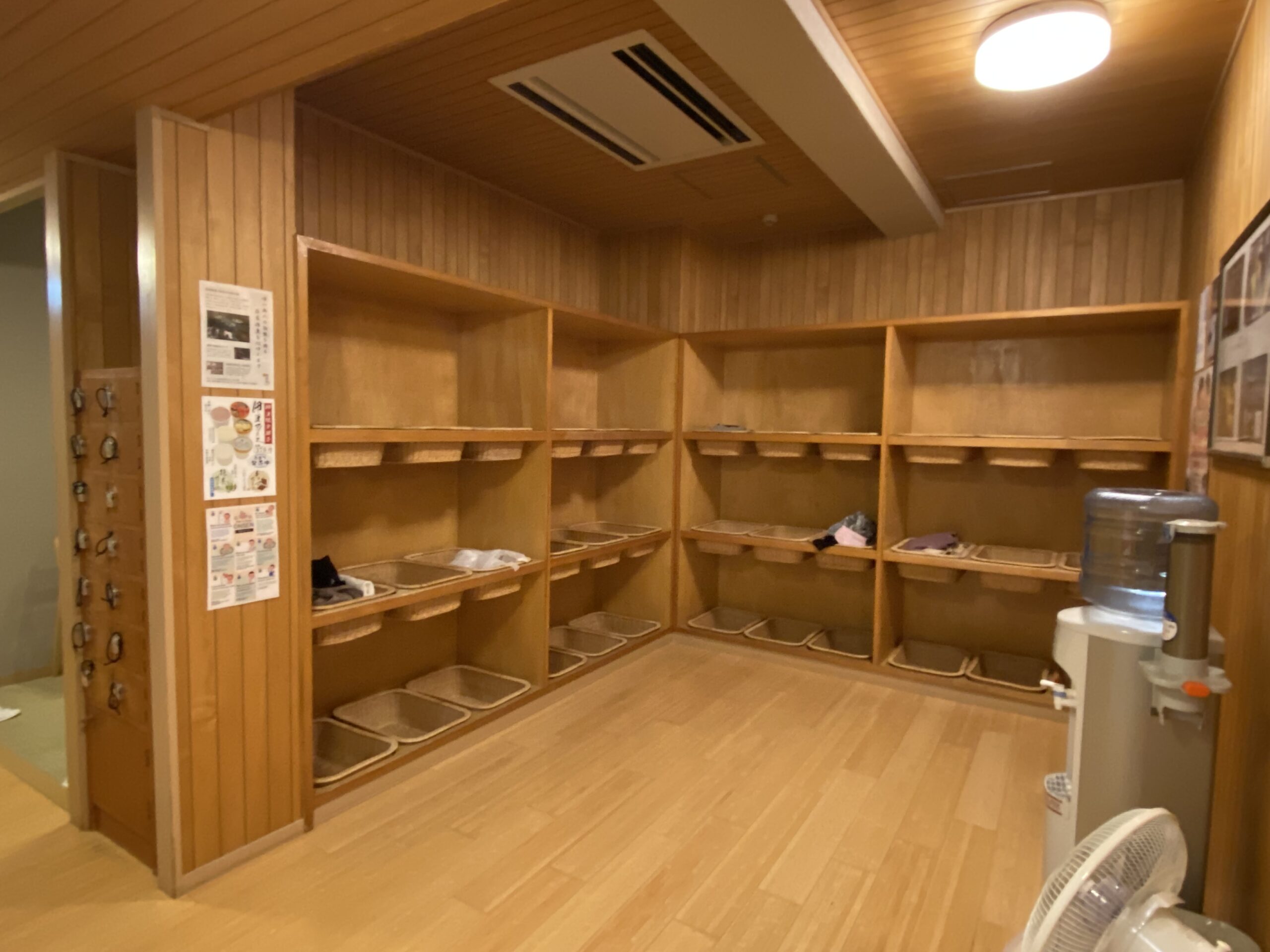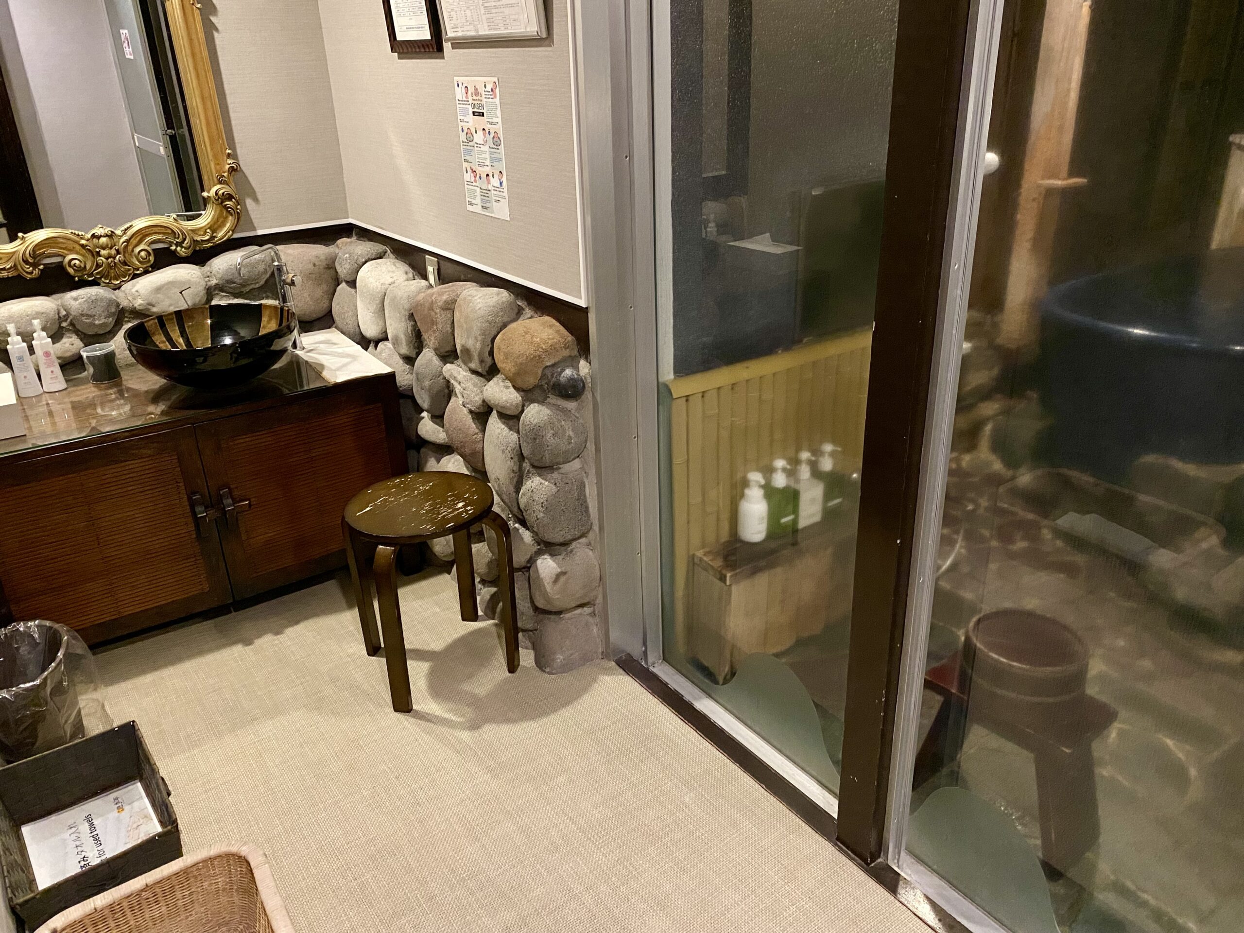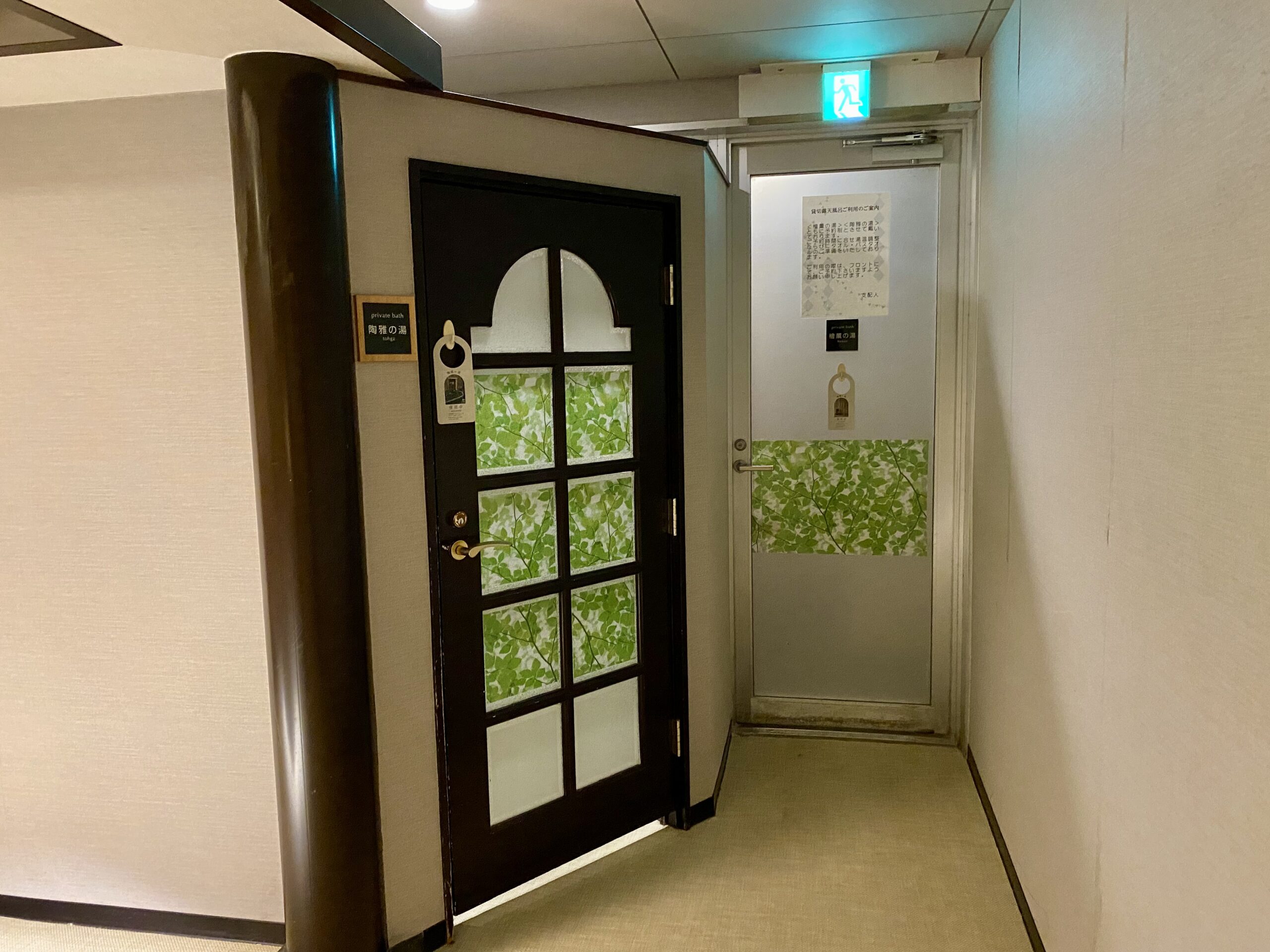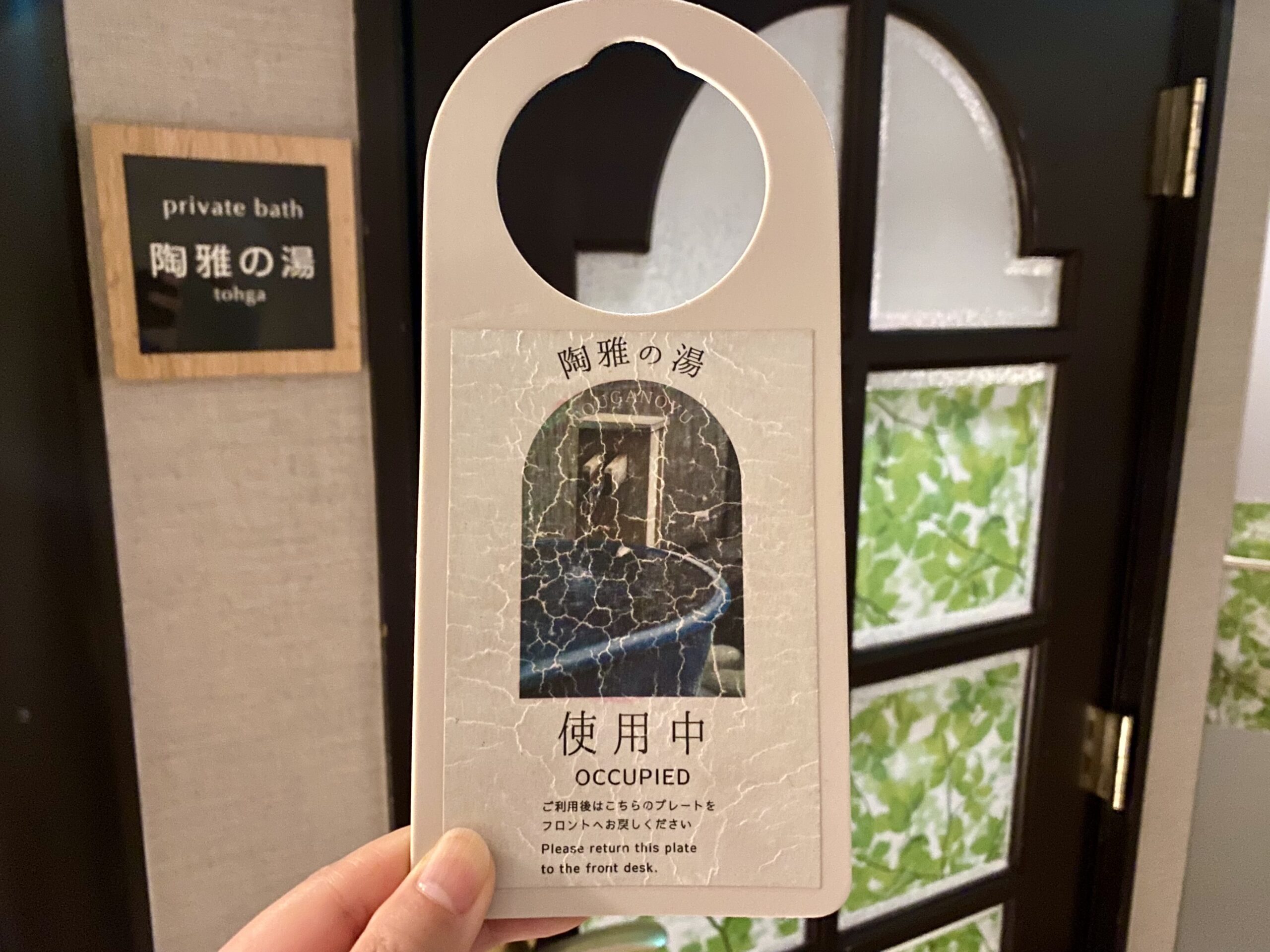 予約時間にフロントに行くと、2つの大浴場の間にあるここまで案内してくれる。中から鍵をかけて入り、この札を返しに行くしくみ。