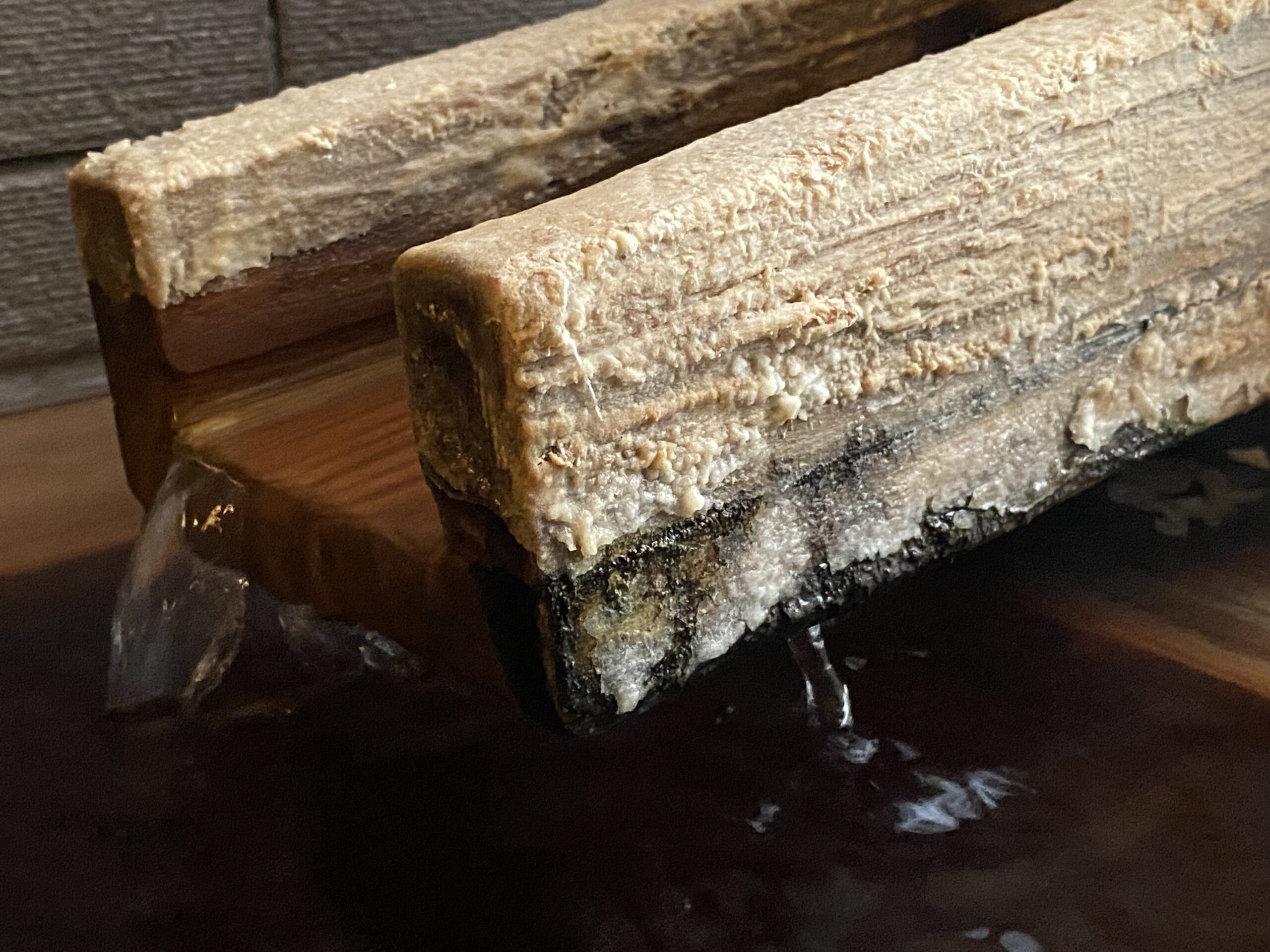 もう一方の湯口の析出物。湯が流れ落ちる部分は塩化物泉っぽい茶色に、湯が飛び散るあたりは白い砂糖がまぶれたみたいに。塩なのかな。