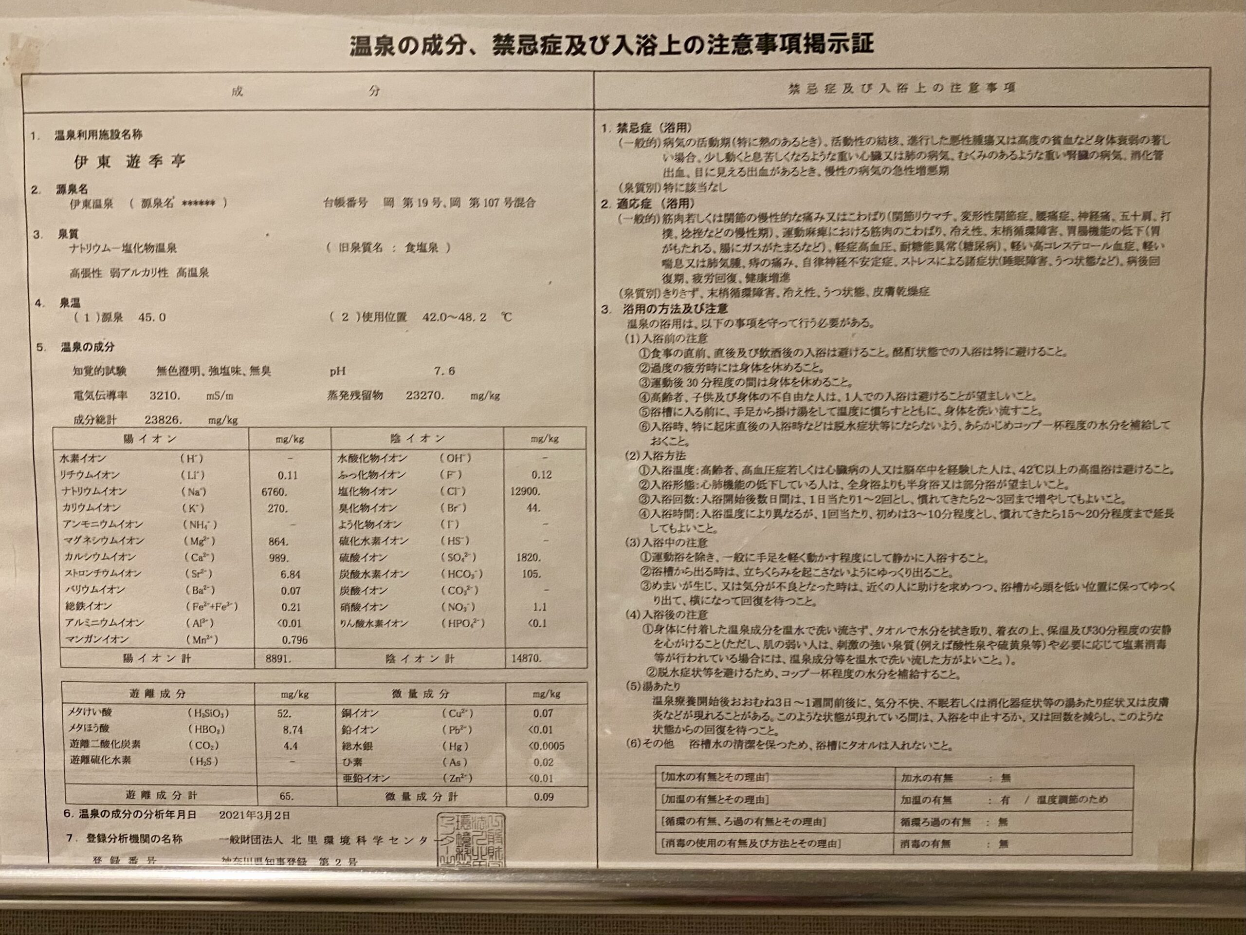 伊東のイメージ通りのナトリウム-塩化物泉。塩化物イオンを12,900mgも含み、23,000mg以上成分総計がある濃い源泉。