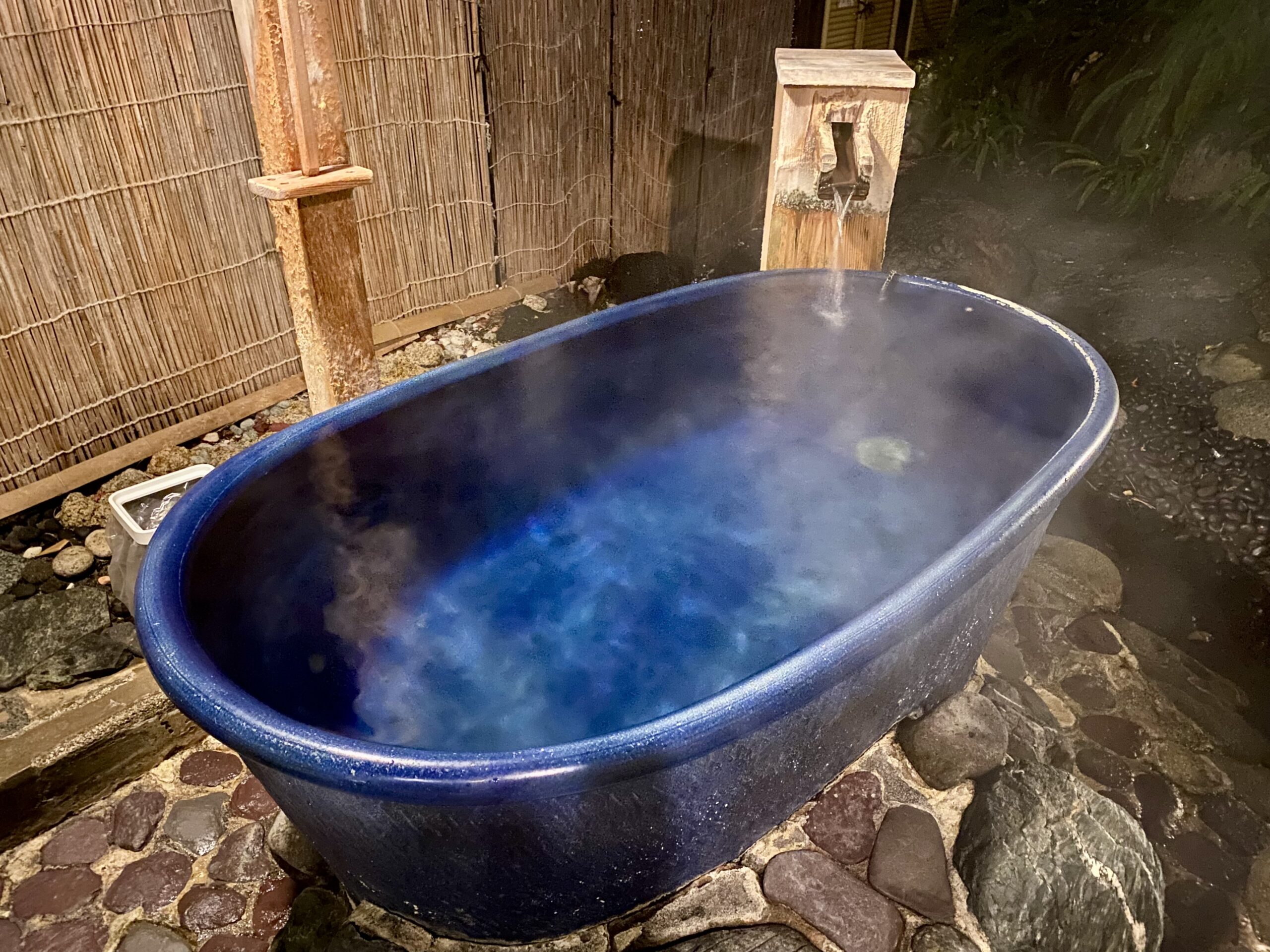 45分無料の貸切露天風呂が2つあるけど、時間が夜22時45分までで、朝は10時からの一枠だけ。檜風呂「檜薫の湯」は予約が埋まっていて、「陶雅の湯」を夕食後に。