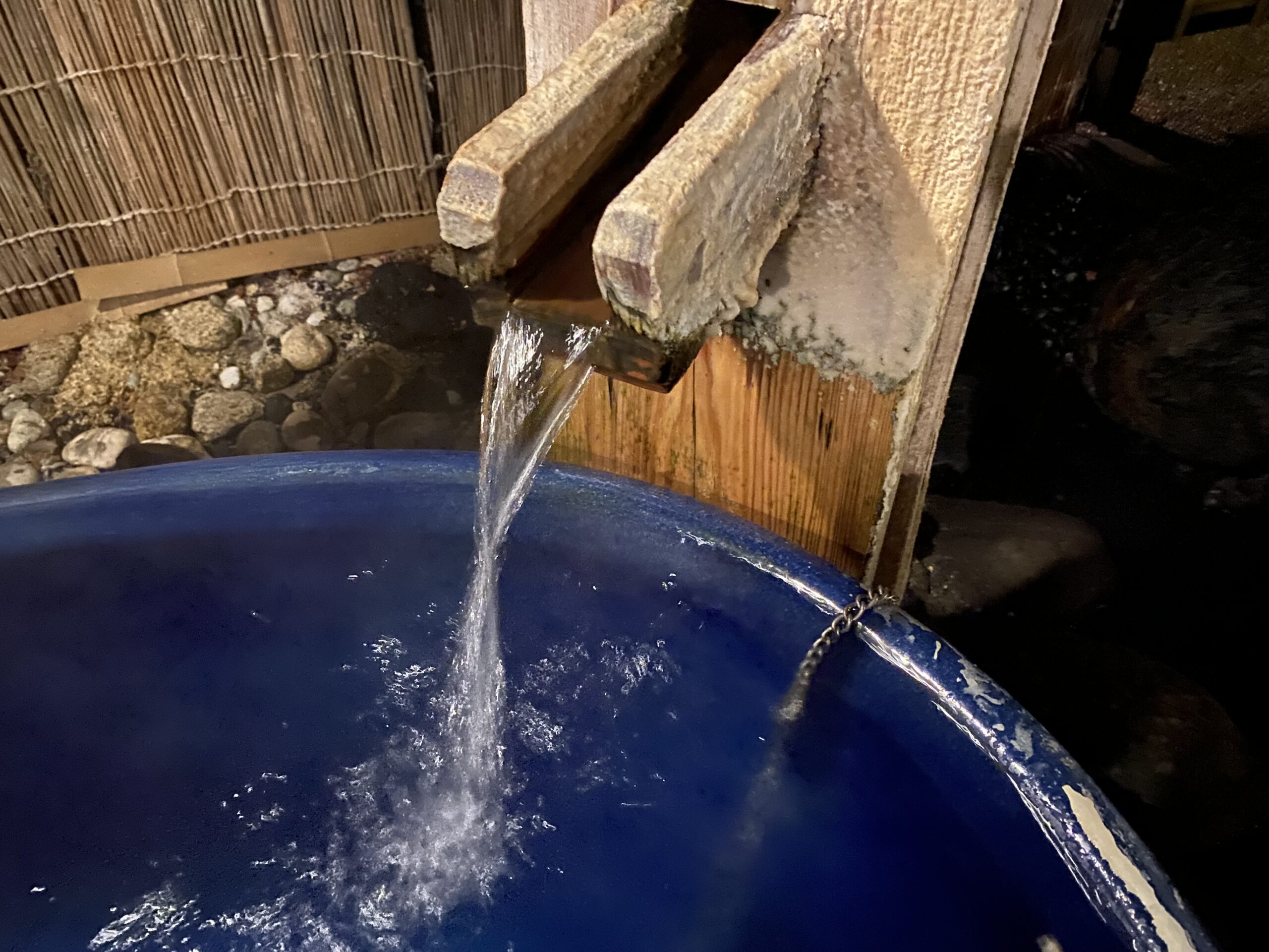 湯口は47度前後で、湯船は41度から41.5度。冷たい空気が漂うオープンエア半露天風呂なので、ちょうどいい湯温。
