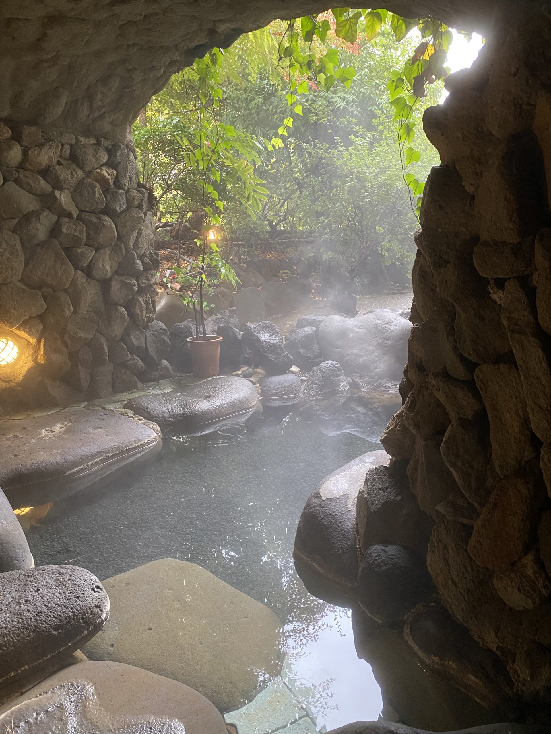 こちらの浴室は独特で、岩が積み上げられた洞窟みたいな入り口から、数段下ったところに。