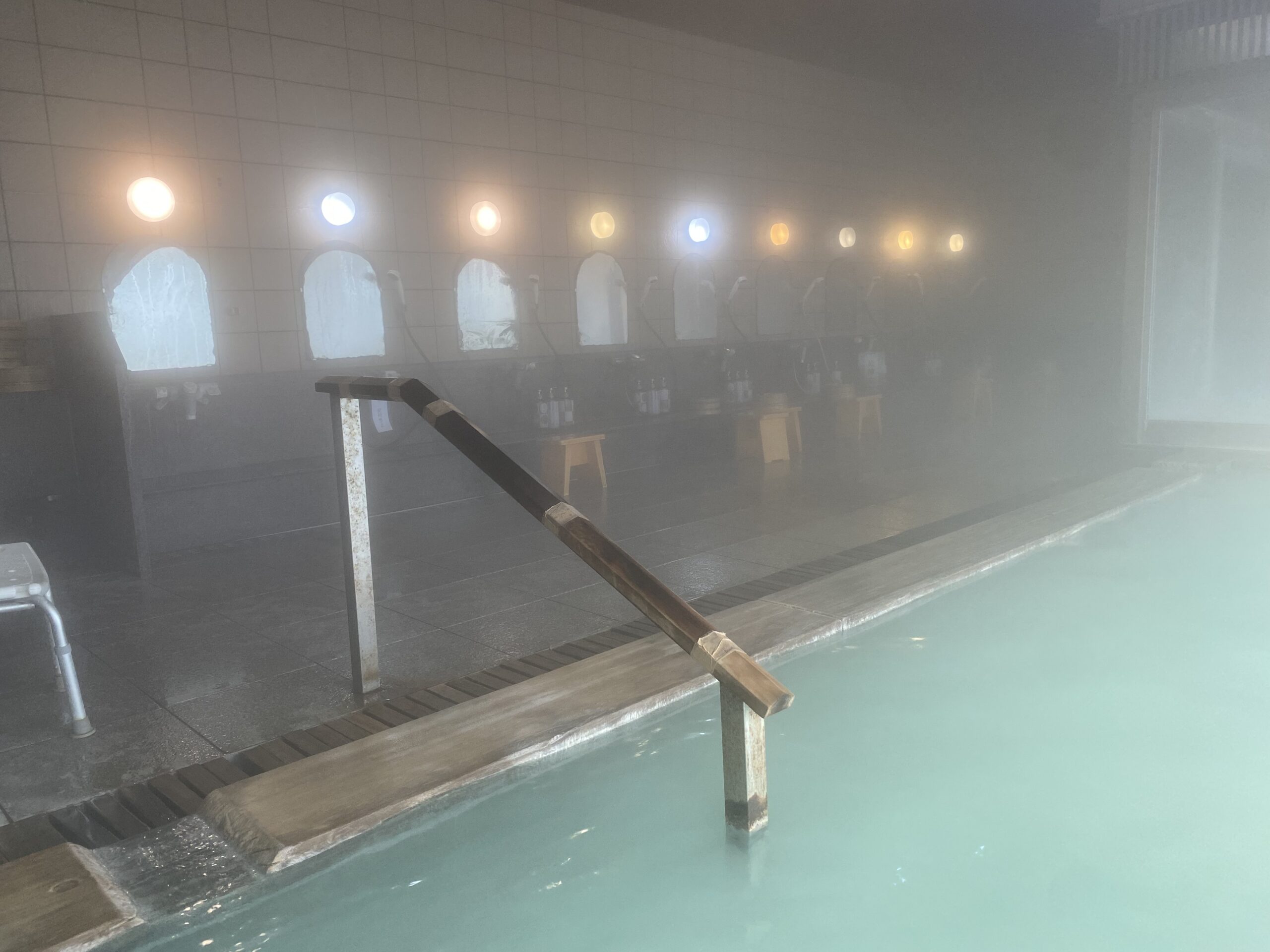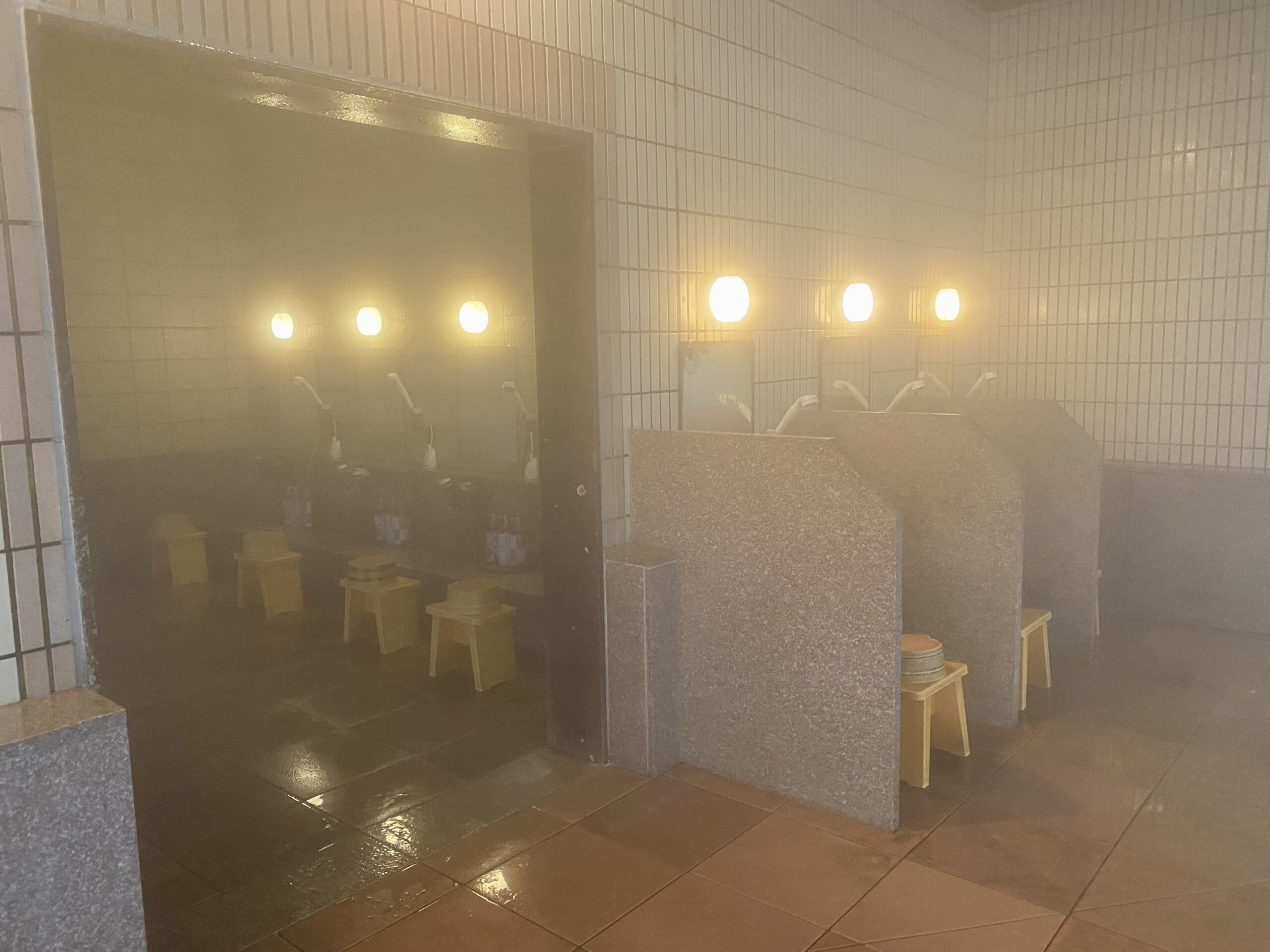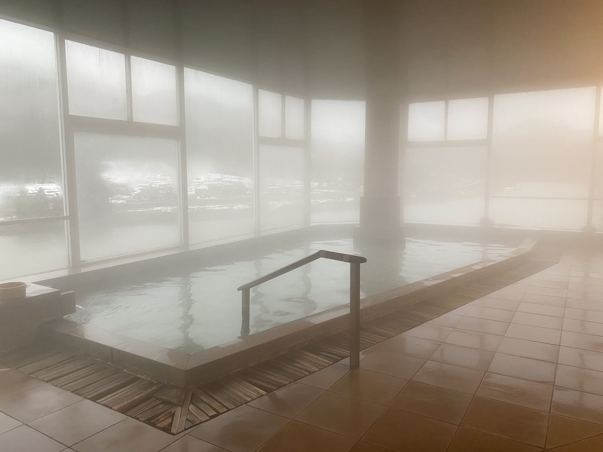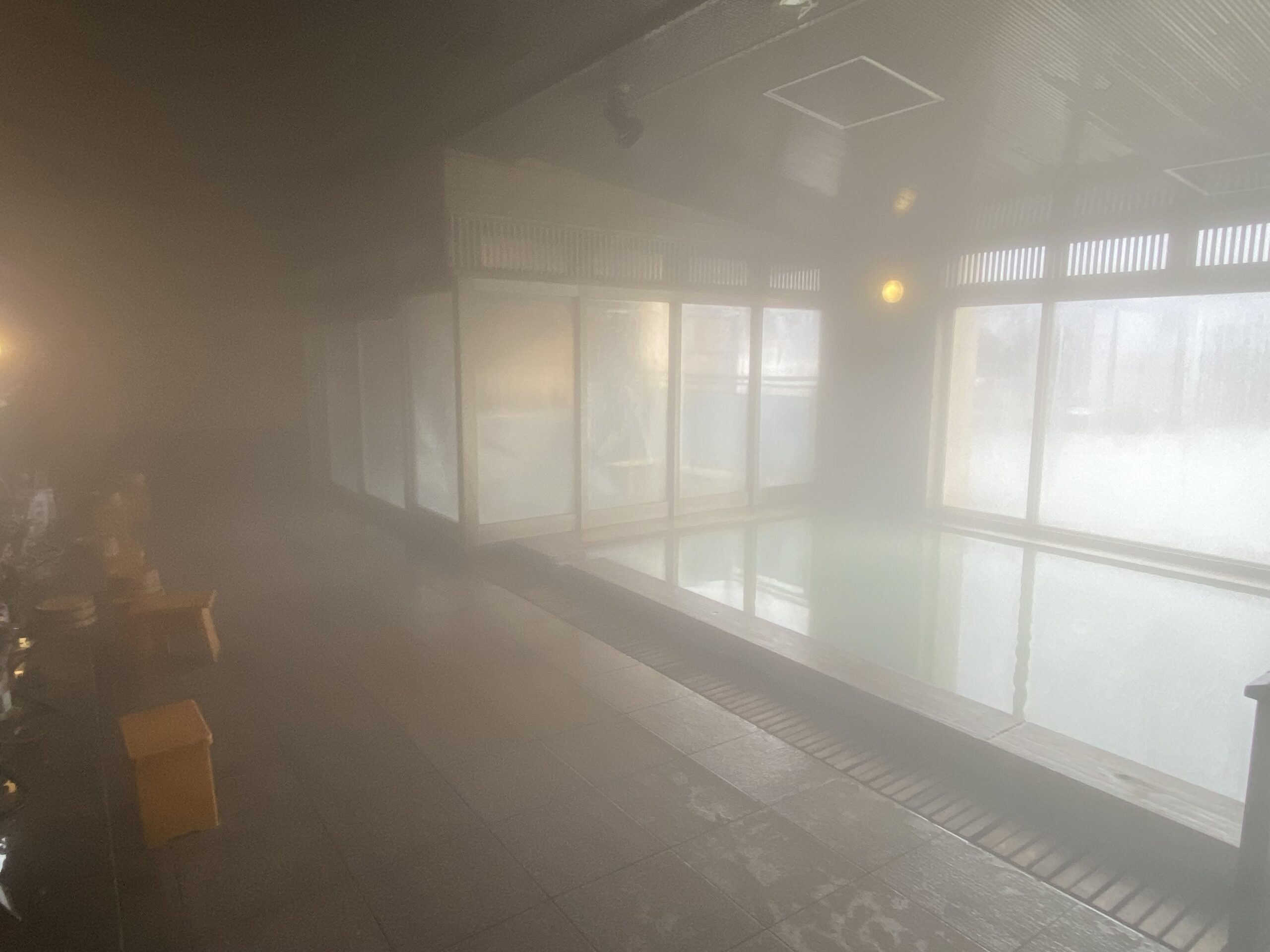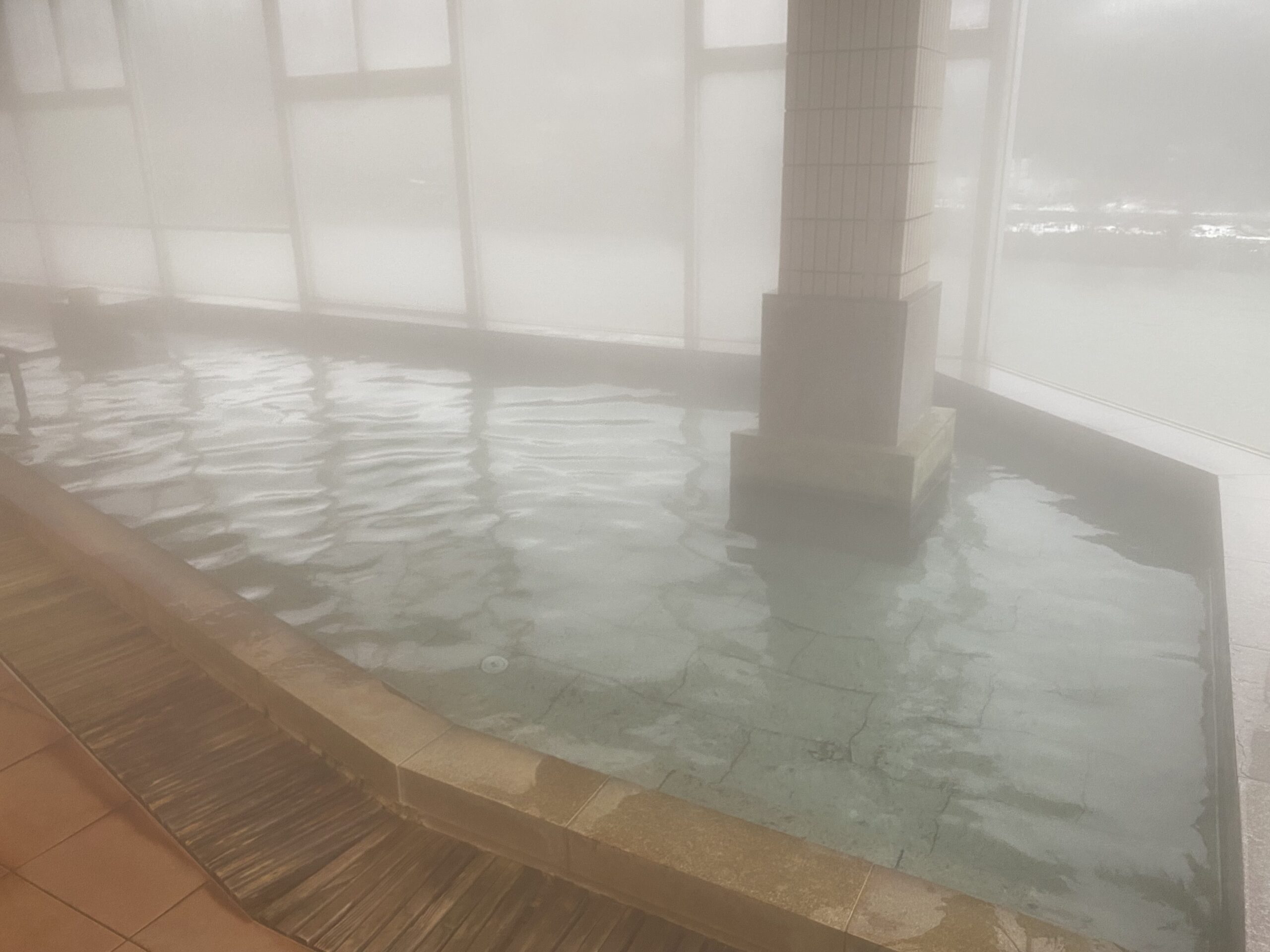 広い浴室はもわっとこもっていて、ガラス張りだけどもやっと。細長い大きな内風呂の奥に露天風呂もぼんやり見える。