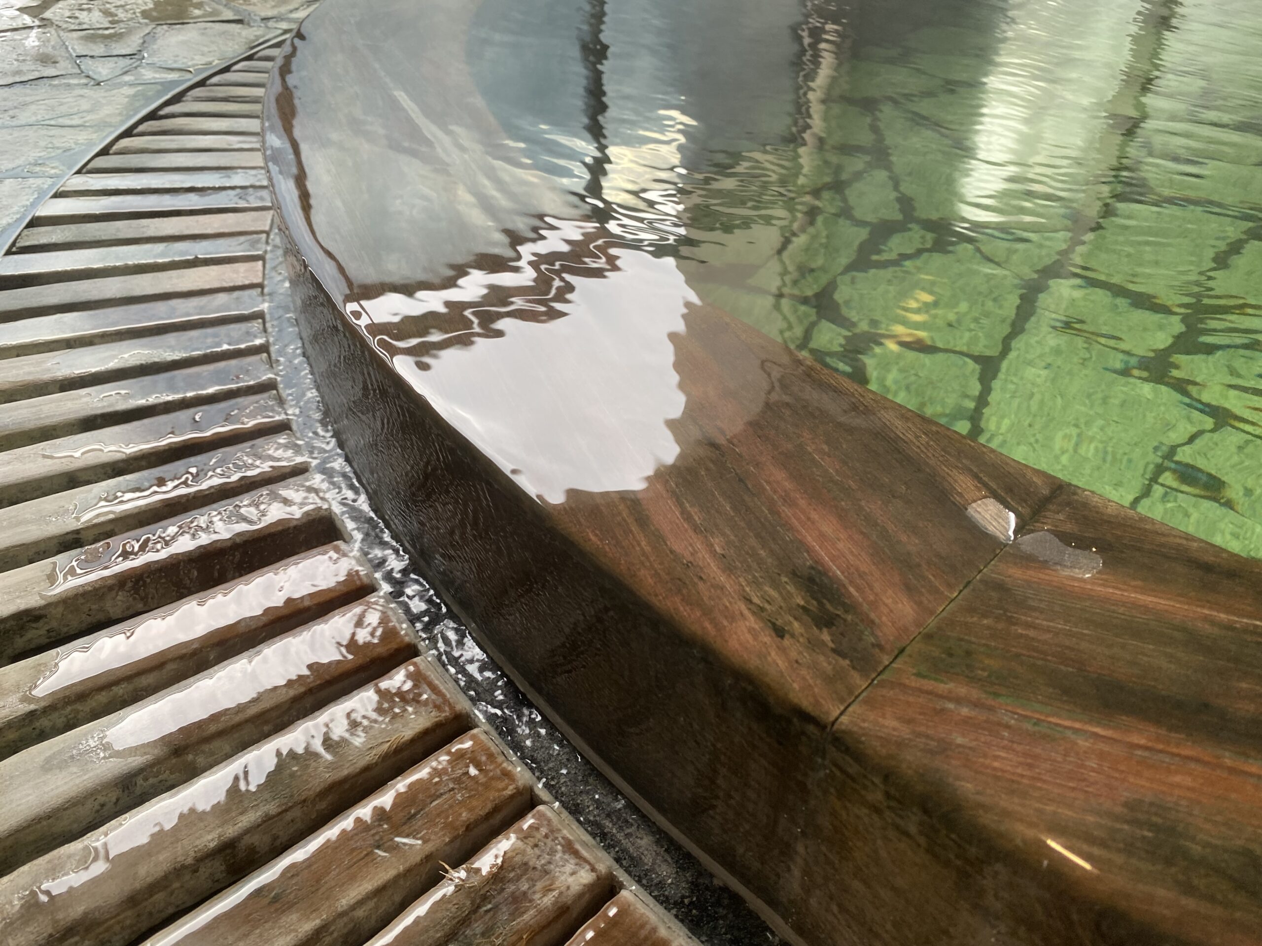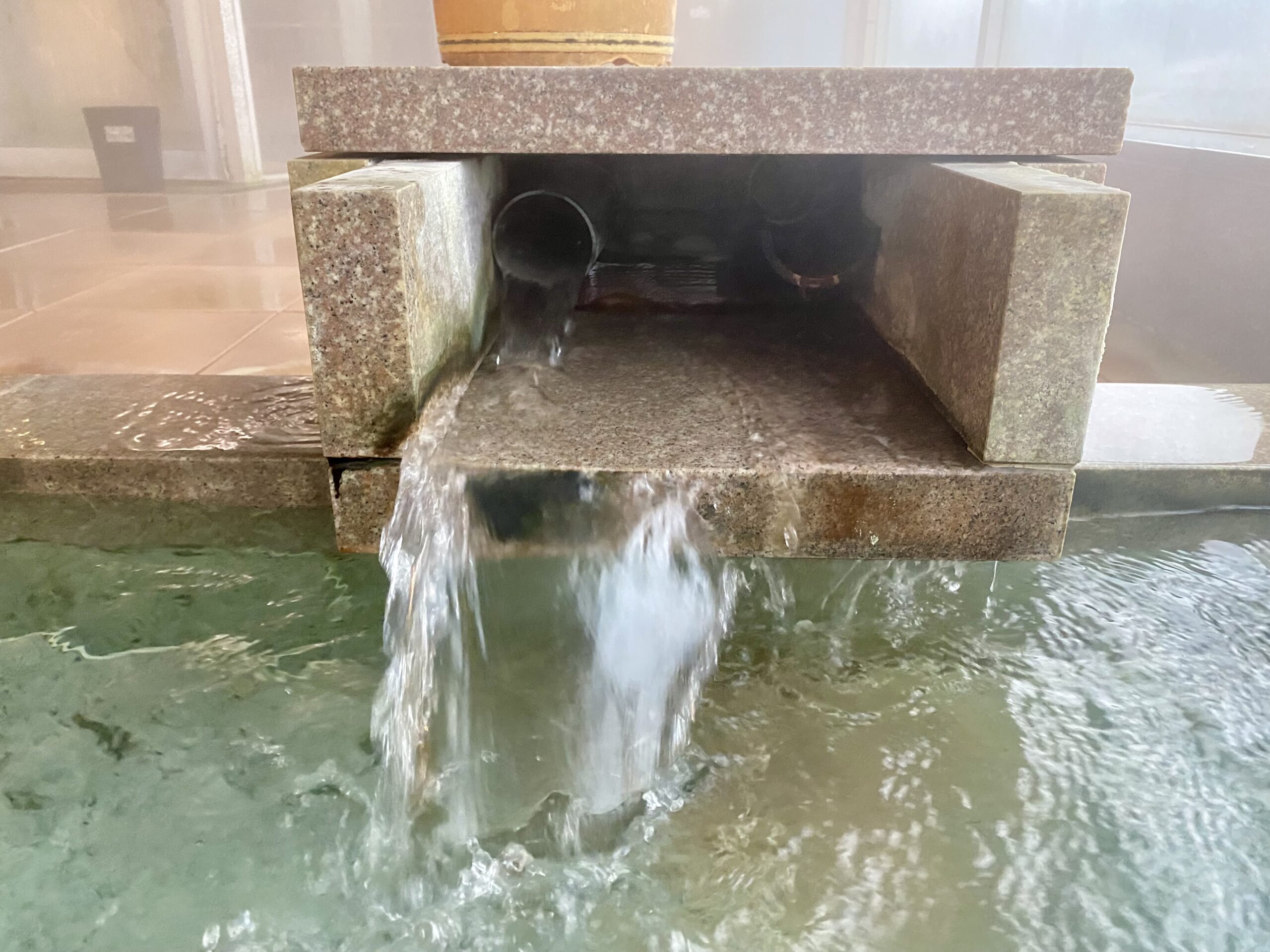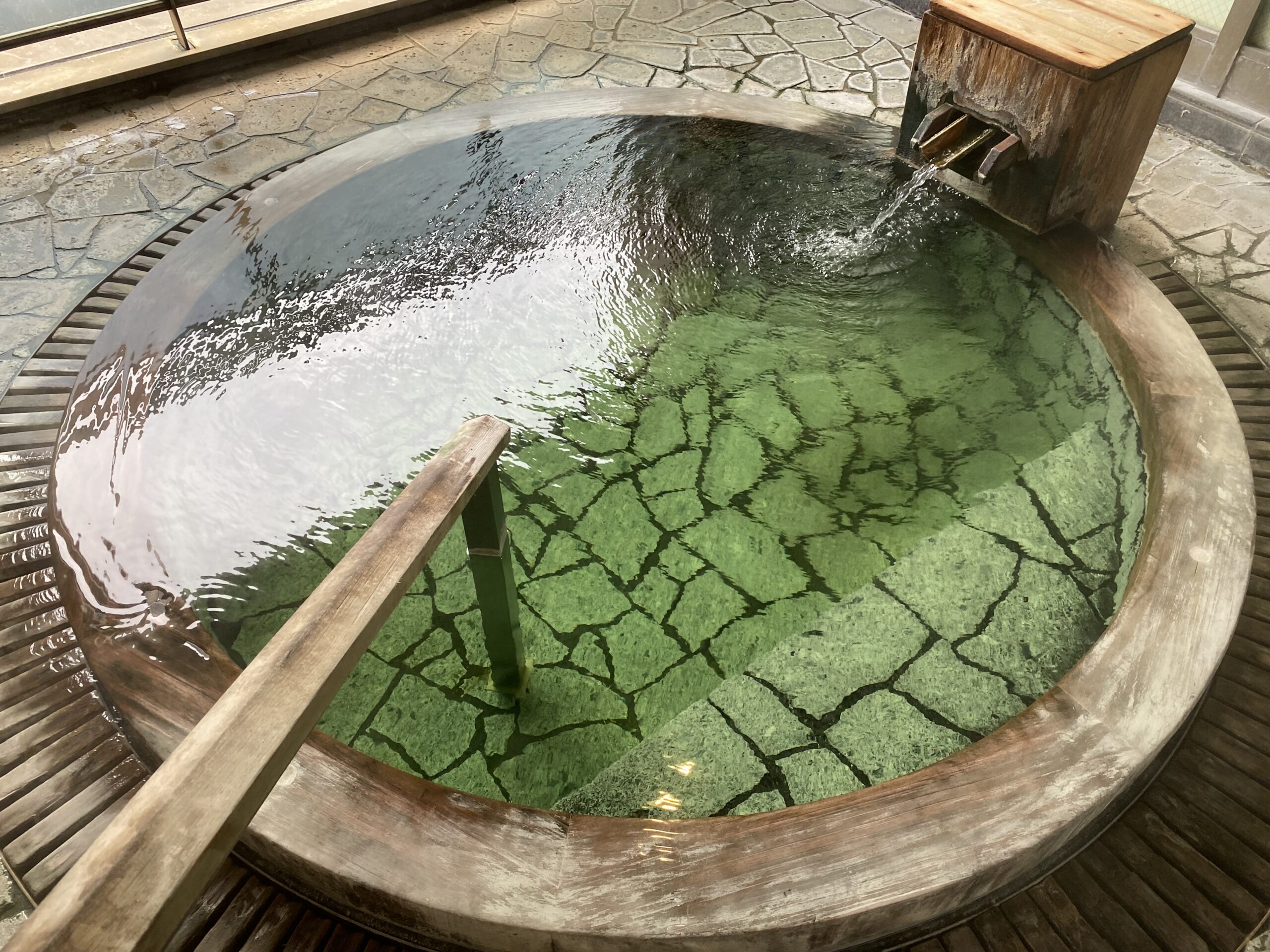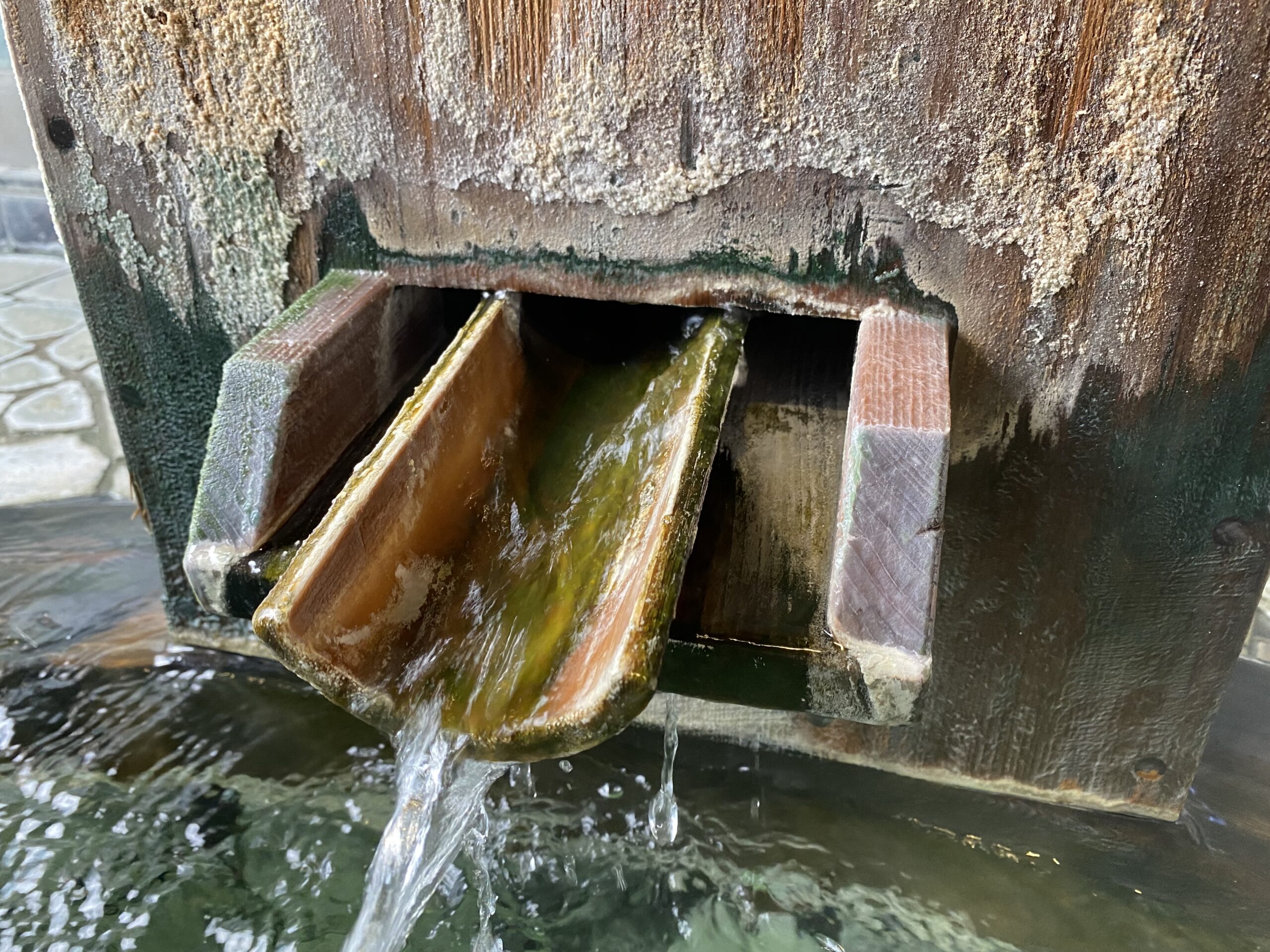 木で囲まれた湯口の中の割った竹を滑るように注がれ、竹を抹茶色に染めてる。もう少しぬるめだったらと思うけど、この湯量ゆえの新鮮さもある。