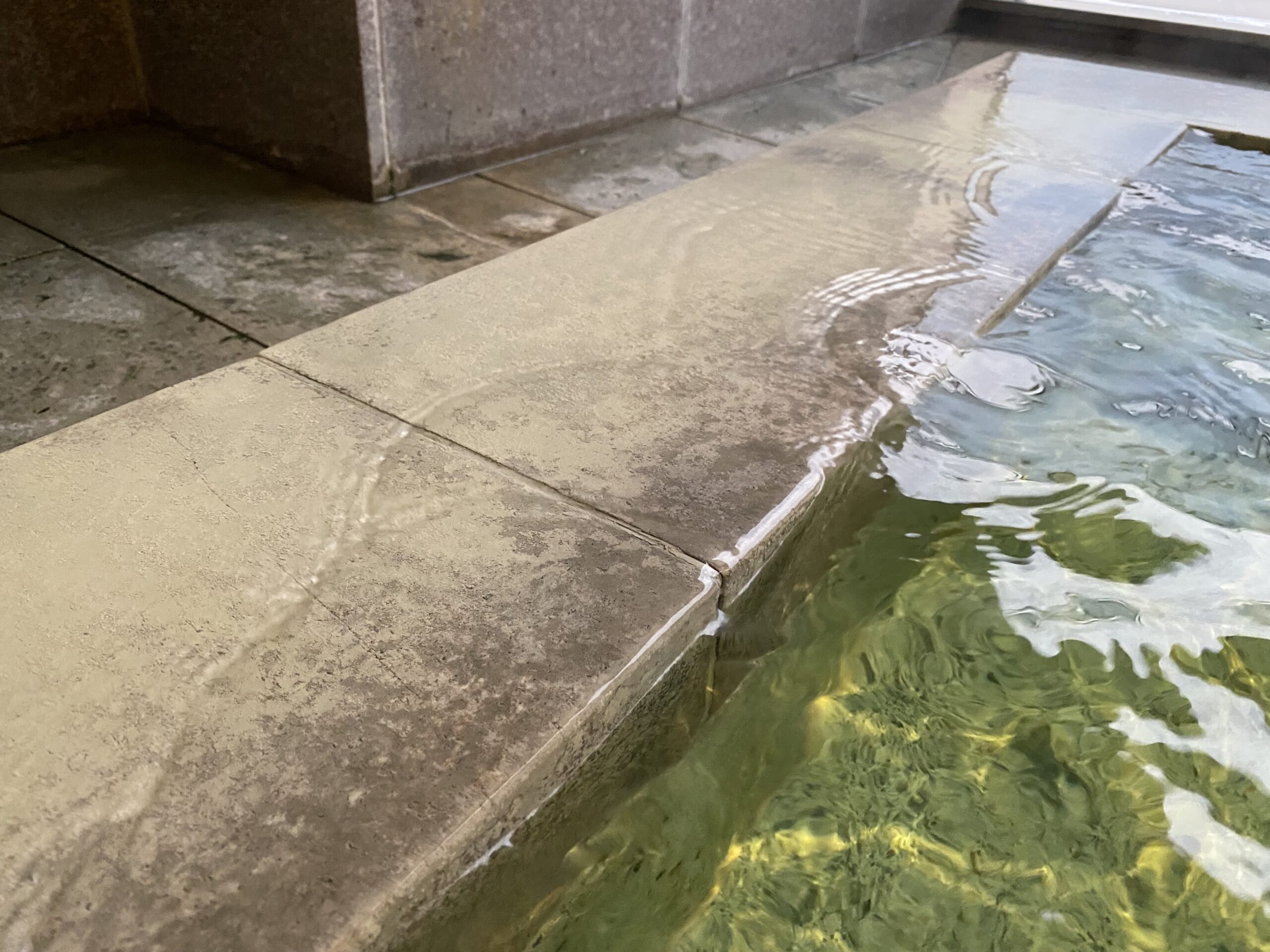 4人くらいだと嫌悪感なく入れるサイズ。縁から湯が溢れ出ていて、