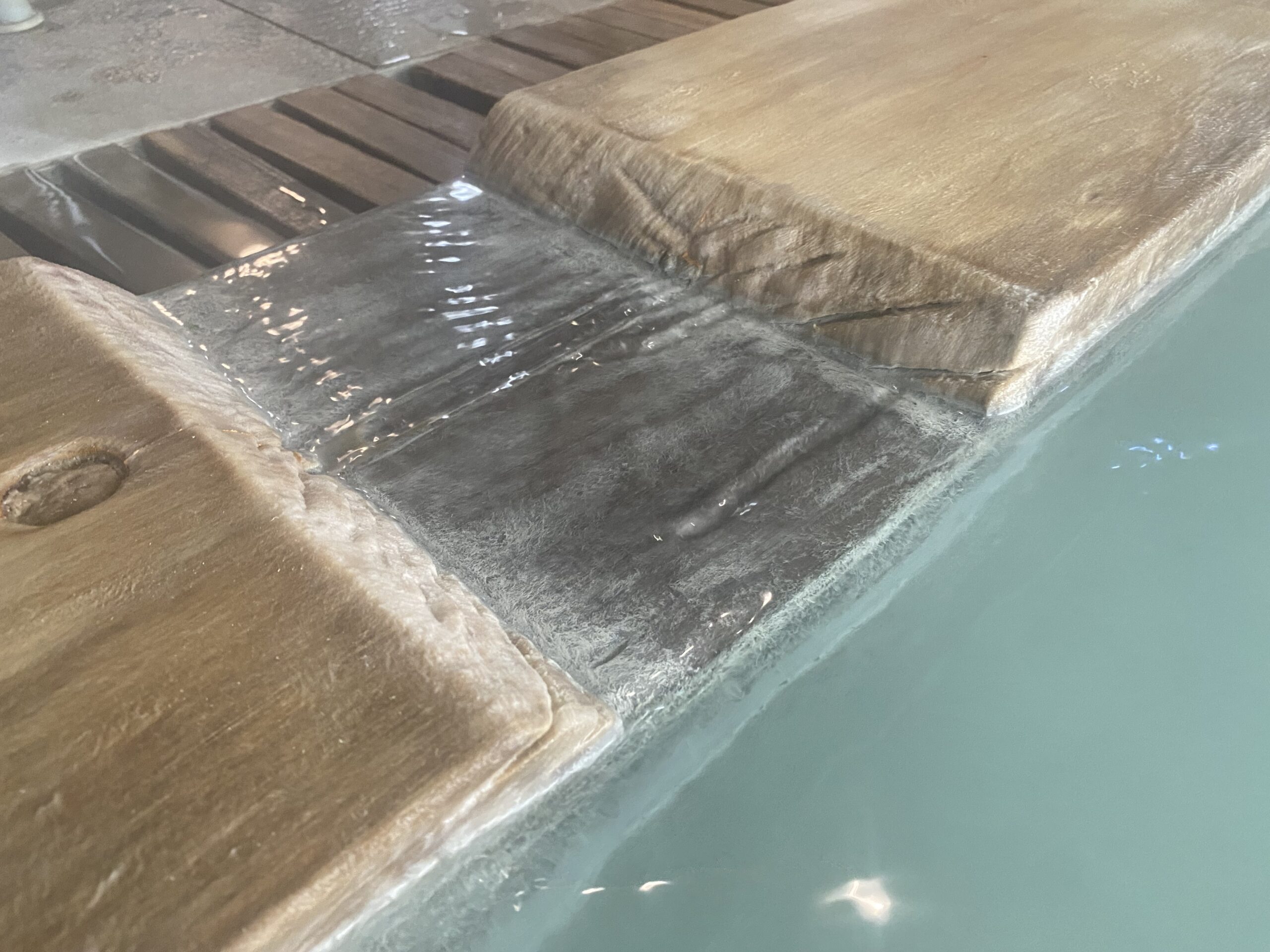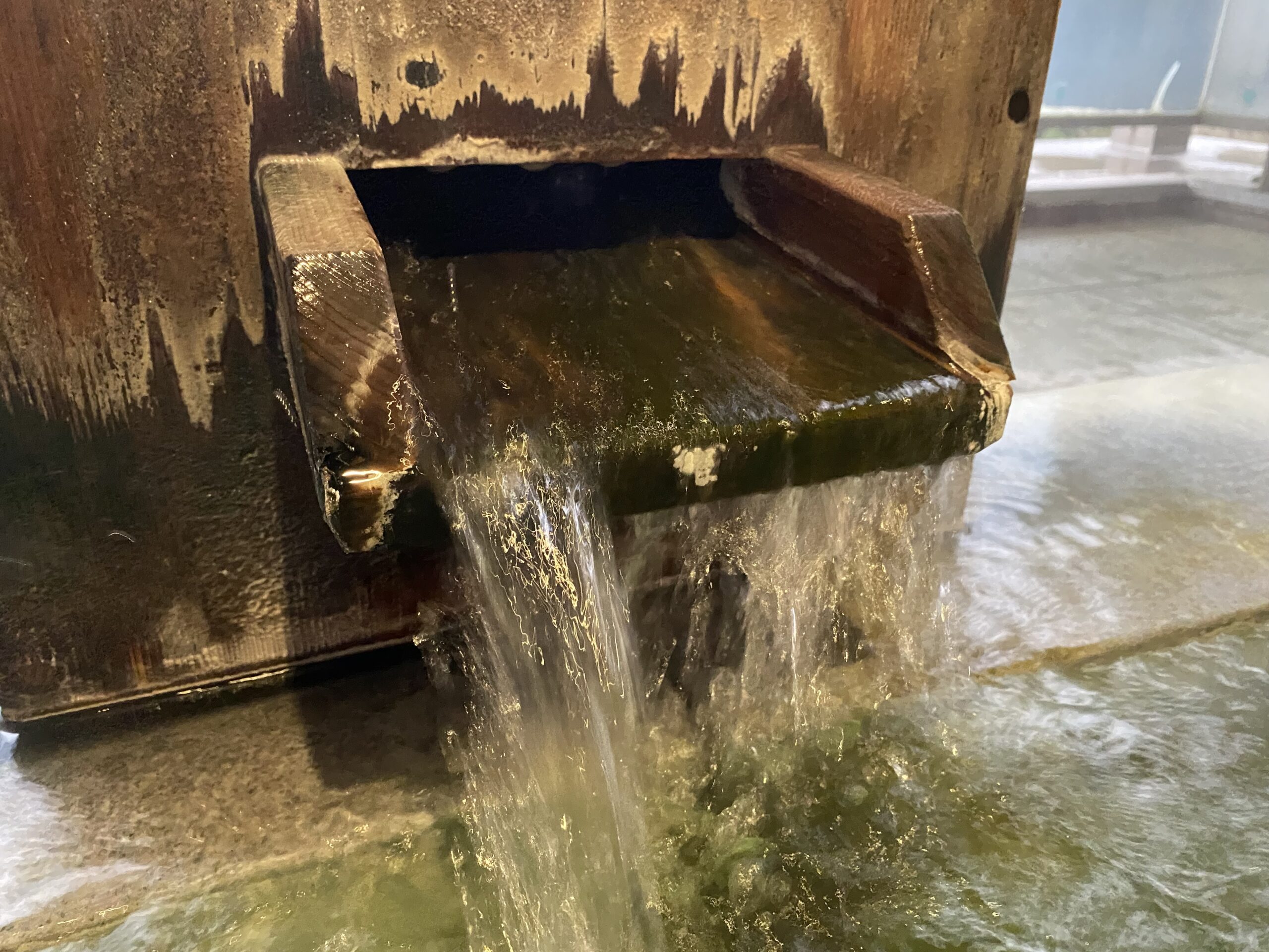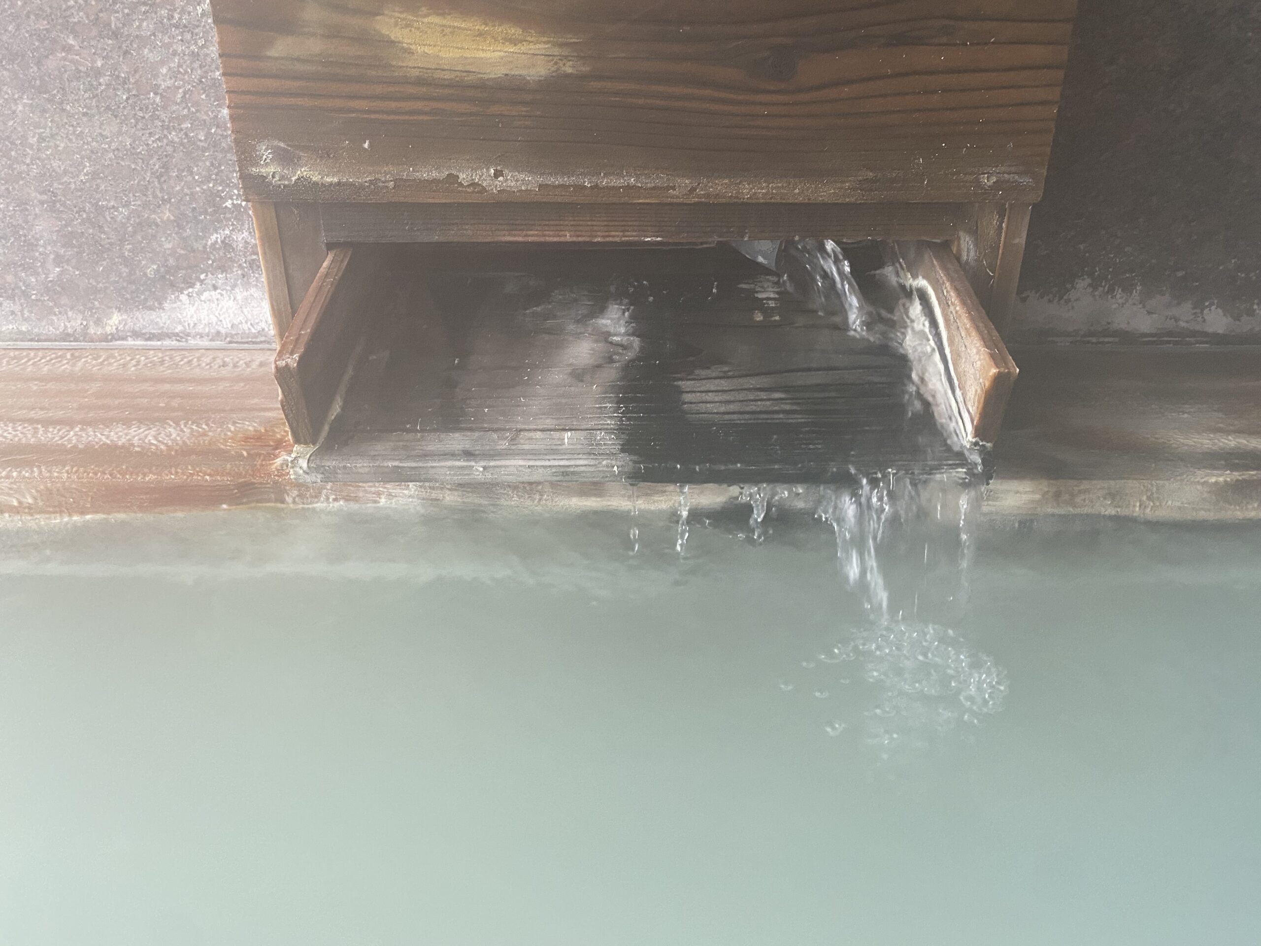 木の湯口はところどころ深緑色に染まっていて、角には白い湯の花が溜まってる。白く見えるけど手に取ると半透明の湯の花と、黒いシナプスみたいなやつがちらほら舞ってる。