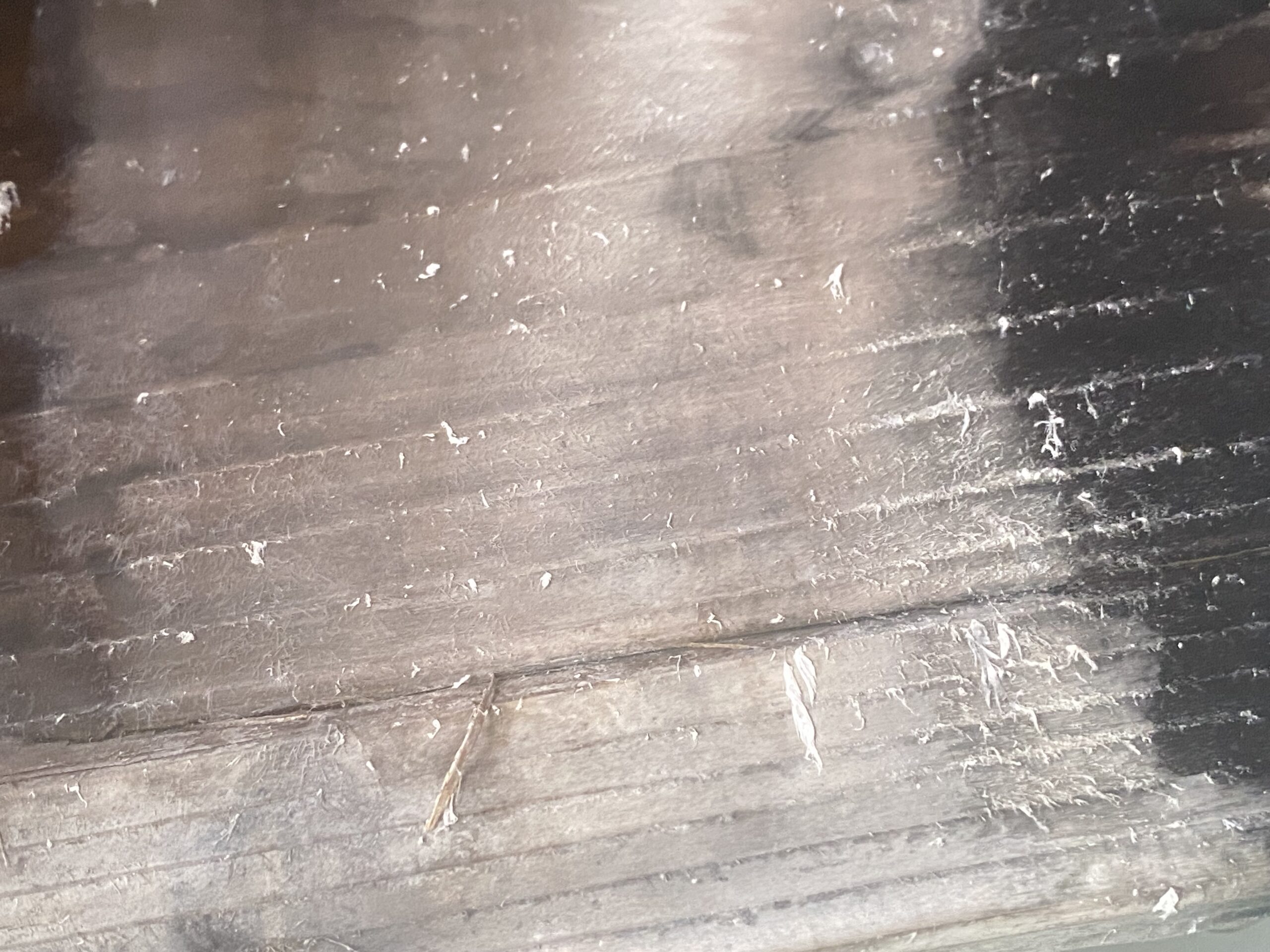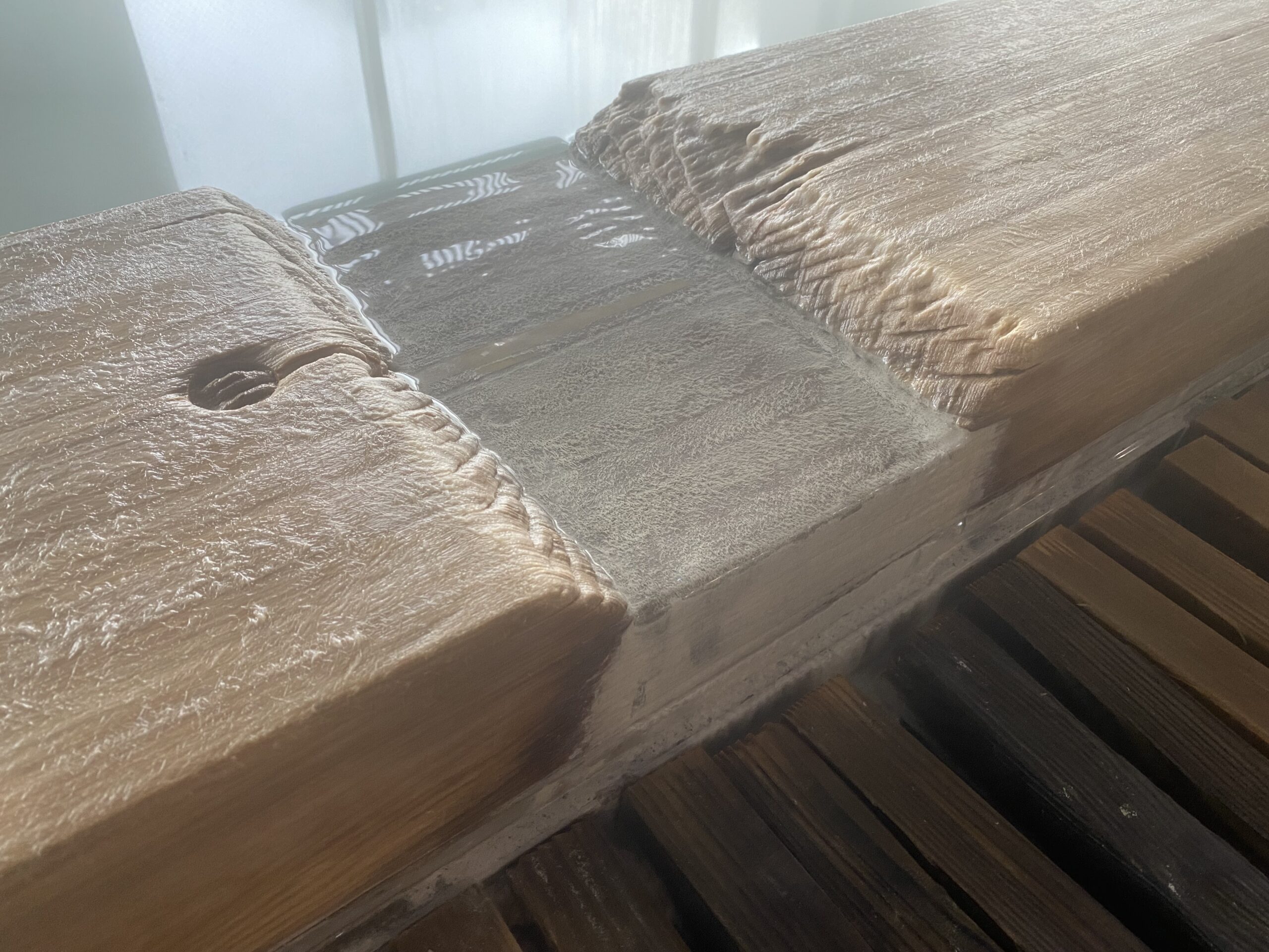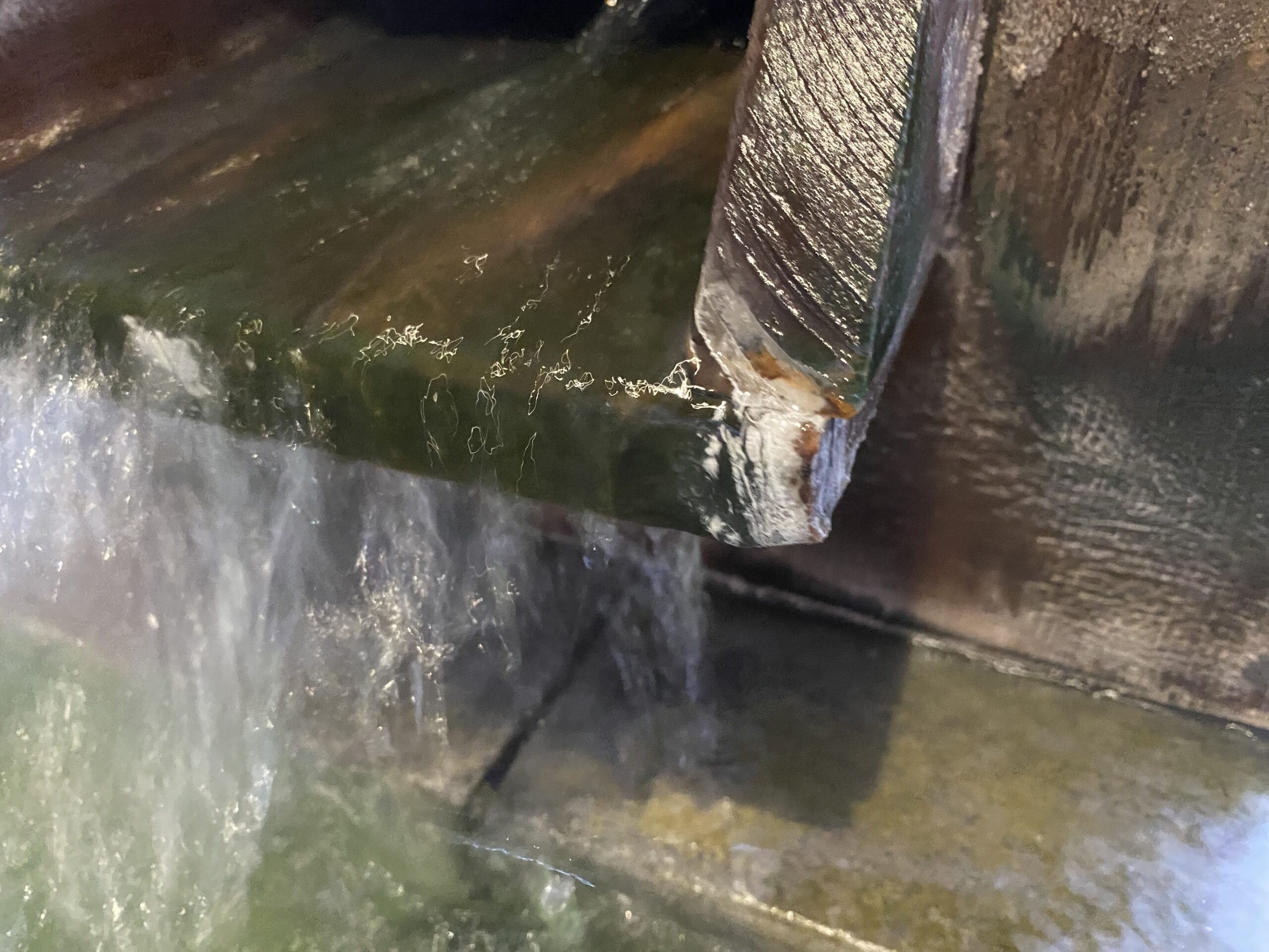 木の湯口はところどころ深緑色に染まっていて、角には白い湯の花が溜まってる。白く見えるけど手に取ると半透明の湯の花と、黒いシナプスみたいなやつがちらほら舞ってる。
