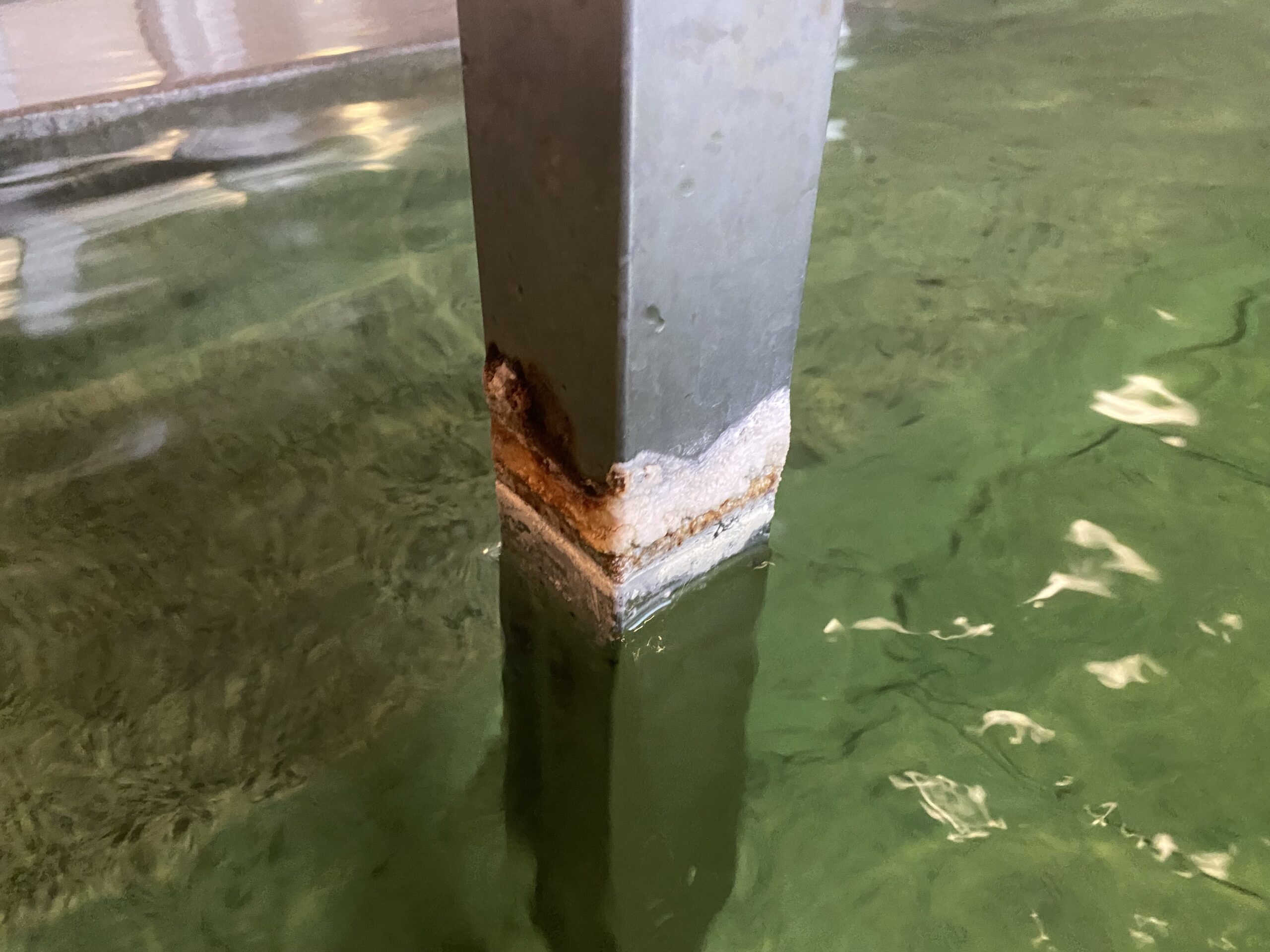 金属の手すりには白い析出物が出来てる。