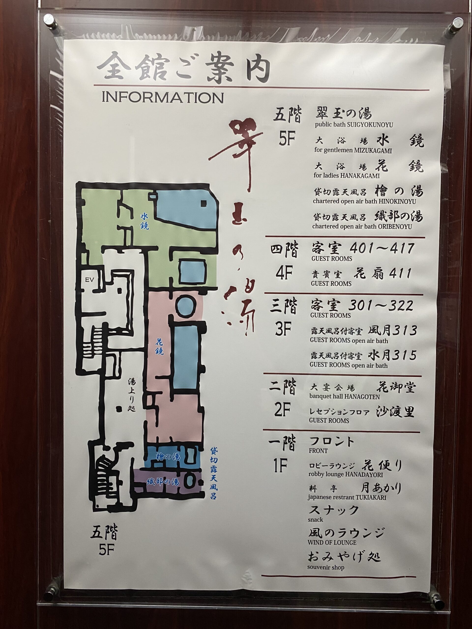 阿賀野川の流れを最上階から眺めることができる展望大浴場、翠玉の湯。エレベーターで5階へ。