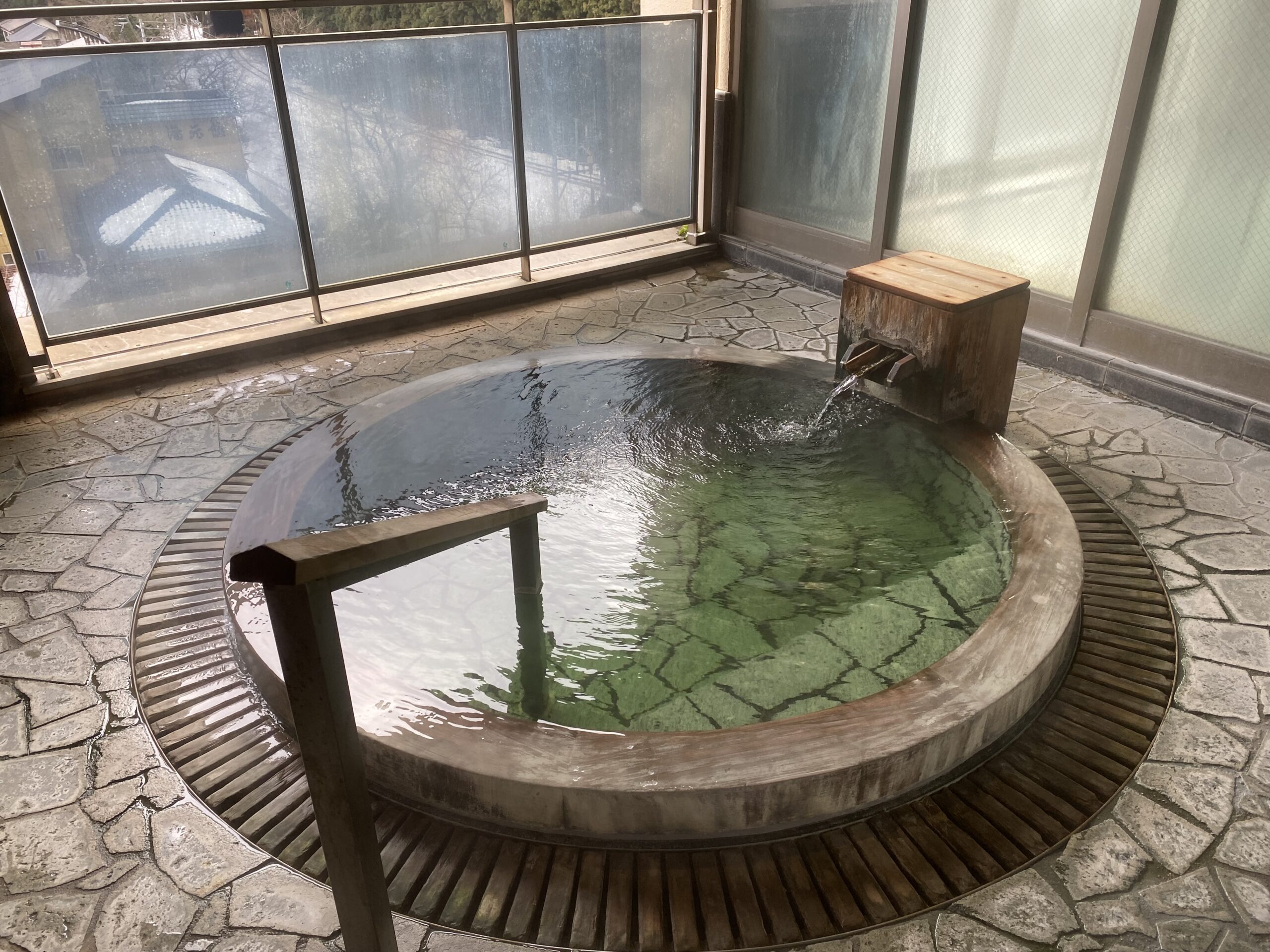 石板に囲まれたパイプの湯口からは42度のお湯が出ていて、湯船は41度に設定されてた。真冬なのに熱すぎない湯温がいいけど、循環感強い。
