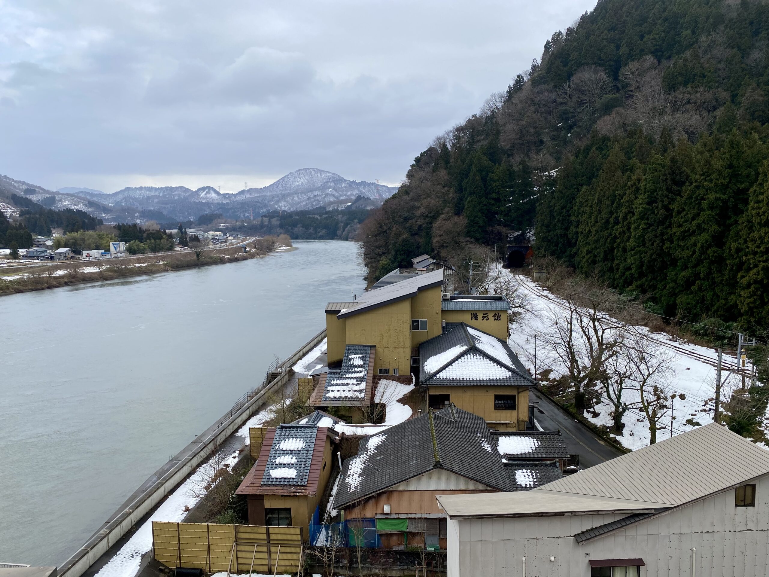 目隠し的な囲いで見づらいけど、阿賀野川とトンネルの眺望。