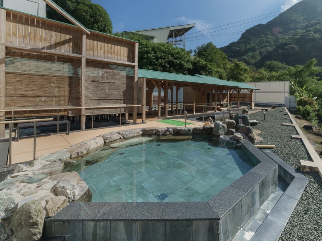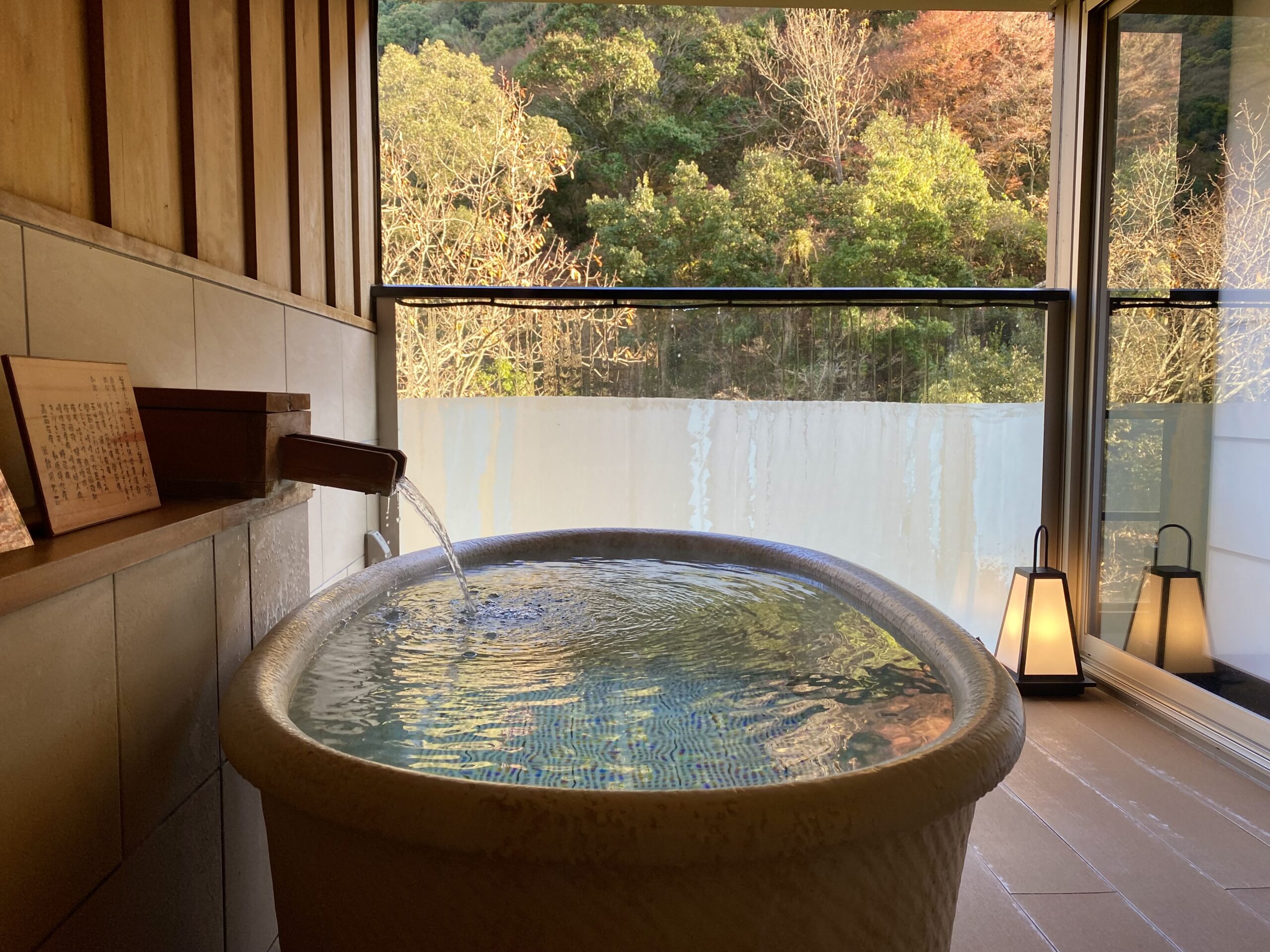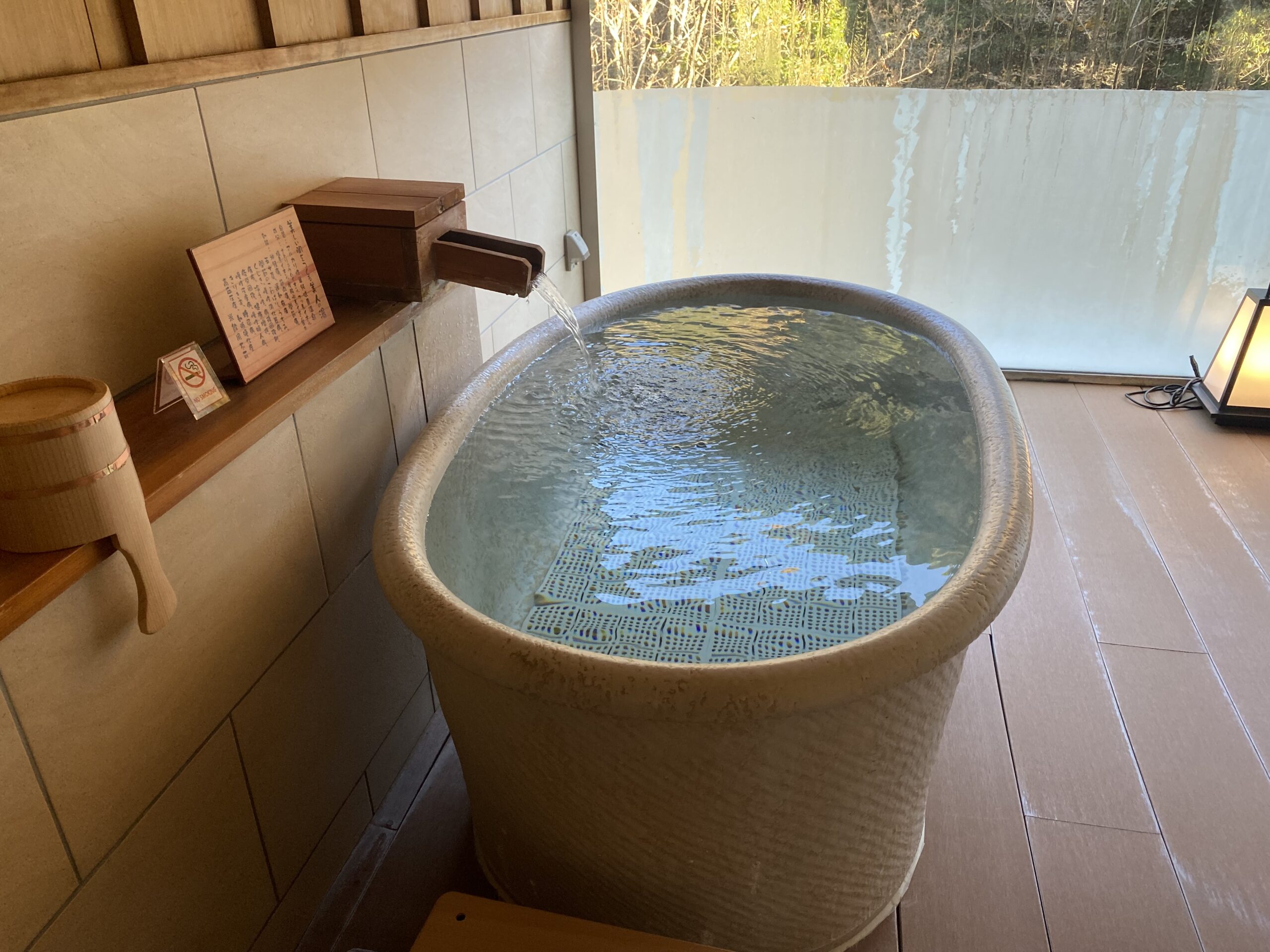 こちらが大浴場と同じ名前の「翠明の湯」。加温だけしたかけ流し。夜の湯船は37.5度割れだった。湯船自体はプールっぽさがあるけど、ふわつるの肌触りが気持ちいいぬる湯。秋も終わりそうな時期だったので、さすがに寒かったけど、暖かい時期は最高だろうな。