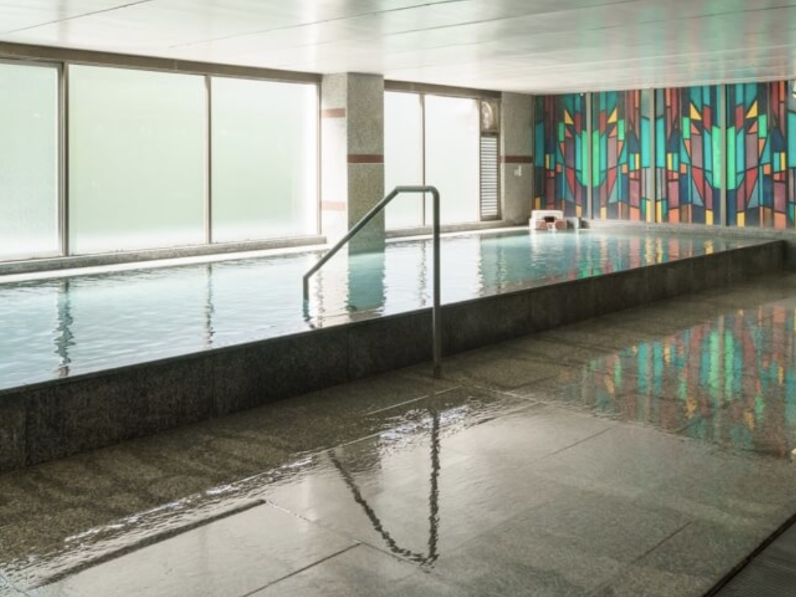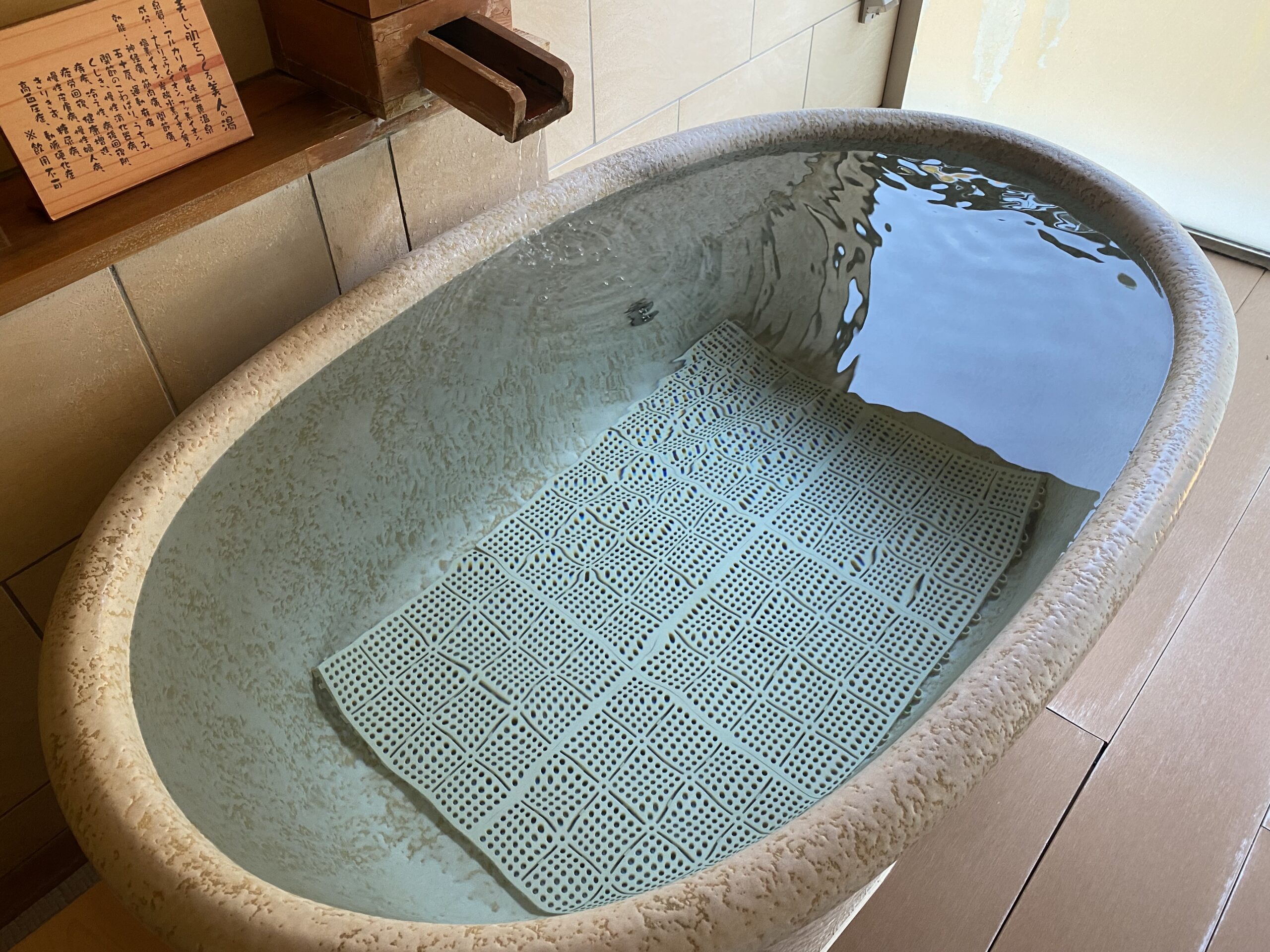 内風呂「玉肌の湯」は、大きな湯船の縁からさらさらかけ流されている。湯口からは52度の加温源泉が出ていて、湯船は40.5度ちょいと、適温で心地いい。硫黄の匂いはかすかだけど、塩素臭もない。じっとりした肌触りで、手がきゅうっと吸いつく。pH 9.4のアルカリ性だけど、ぬるぬるではない。