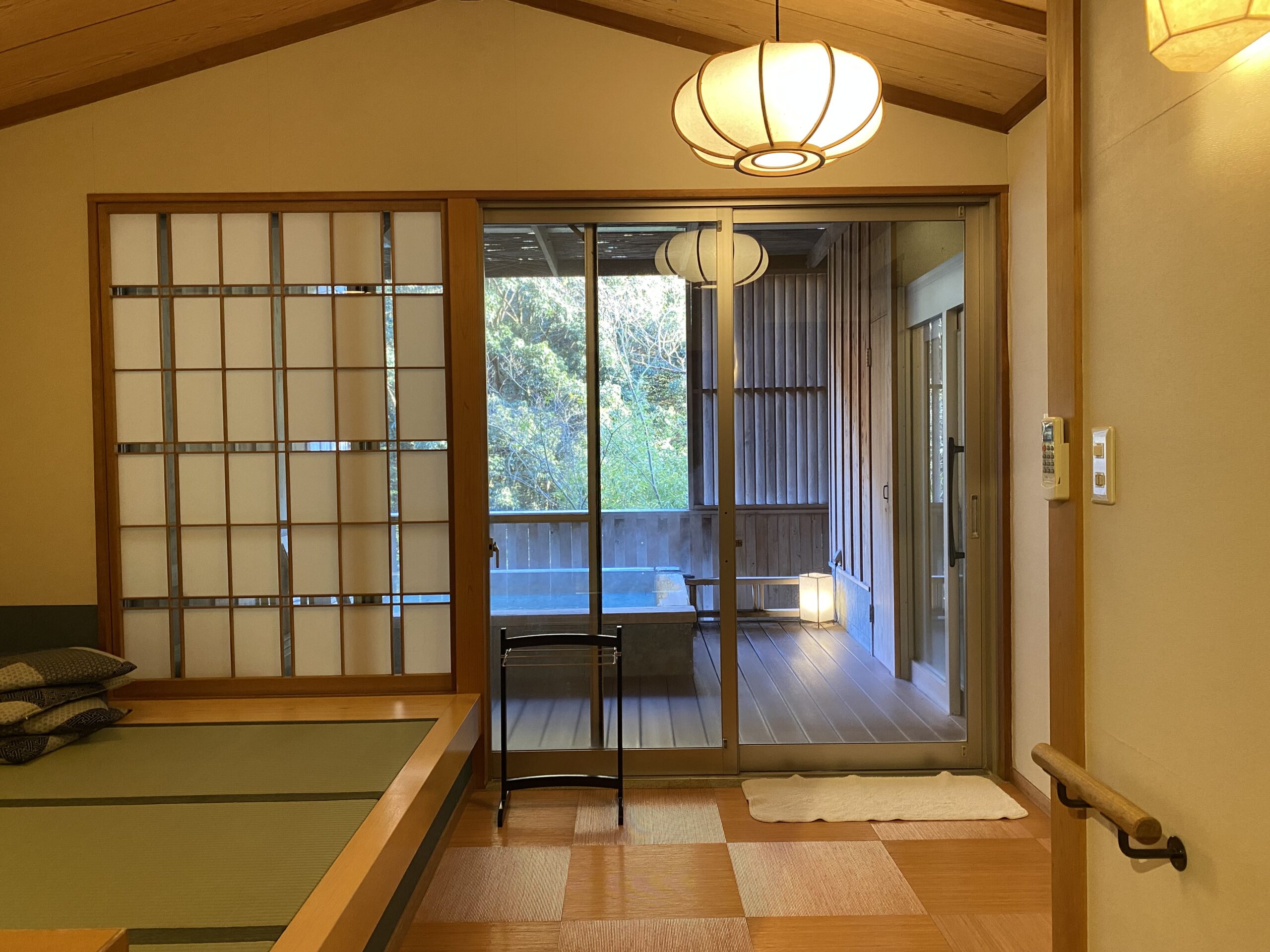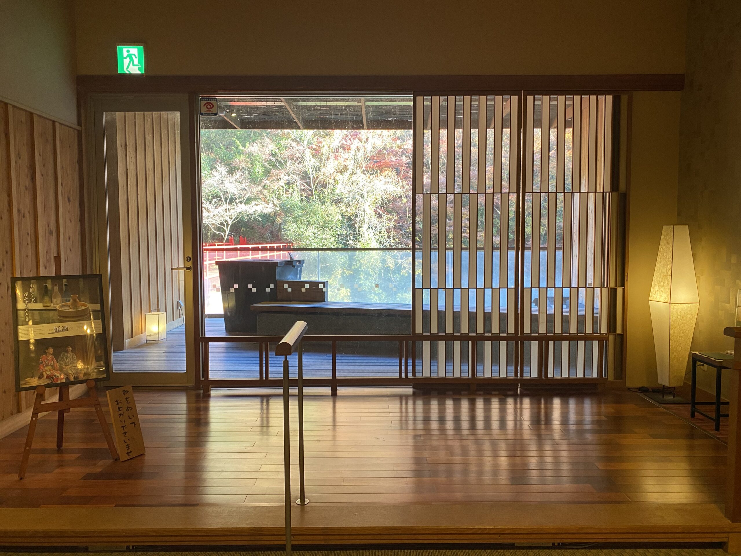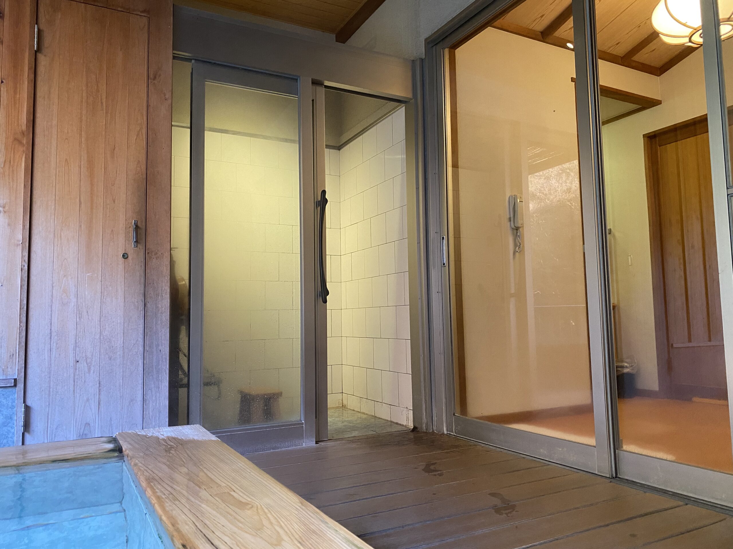 出てすぐのところにシャワールーム。上が開いてはいるけど、ガラス戸で囲われてる。5つのうちこの檜風呂と石風呂の2つはバリアフリー仕様。