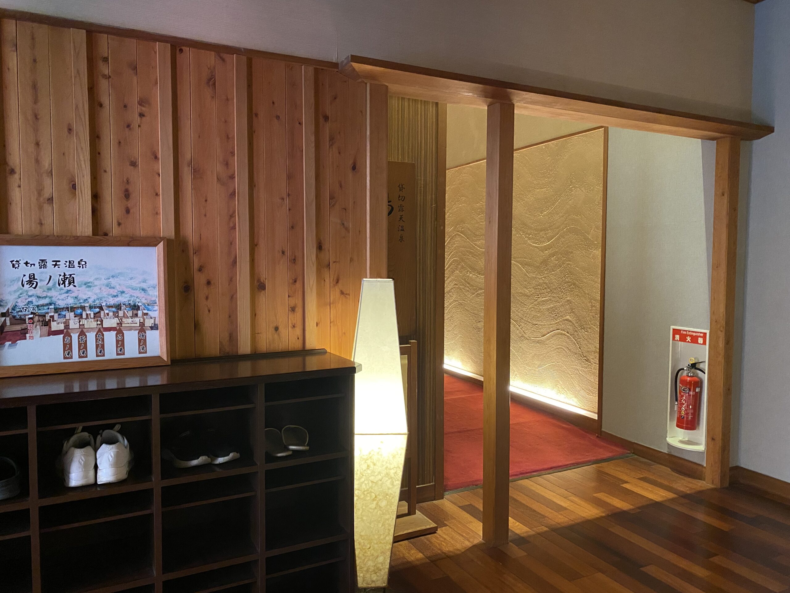貸切露天風呂「湯ノ瀬」は23時まで、45分4,400円の有料。予約時間にフロントで鍵を受け取ってから向かう。