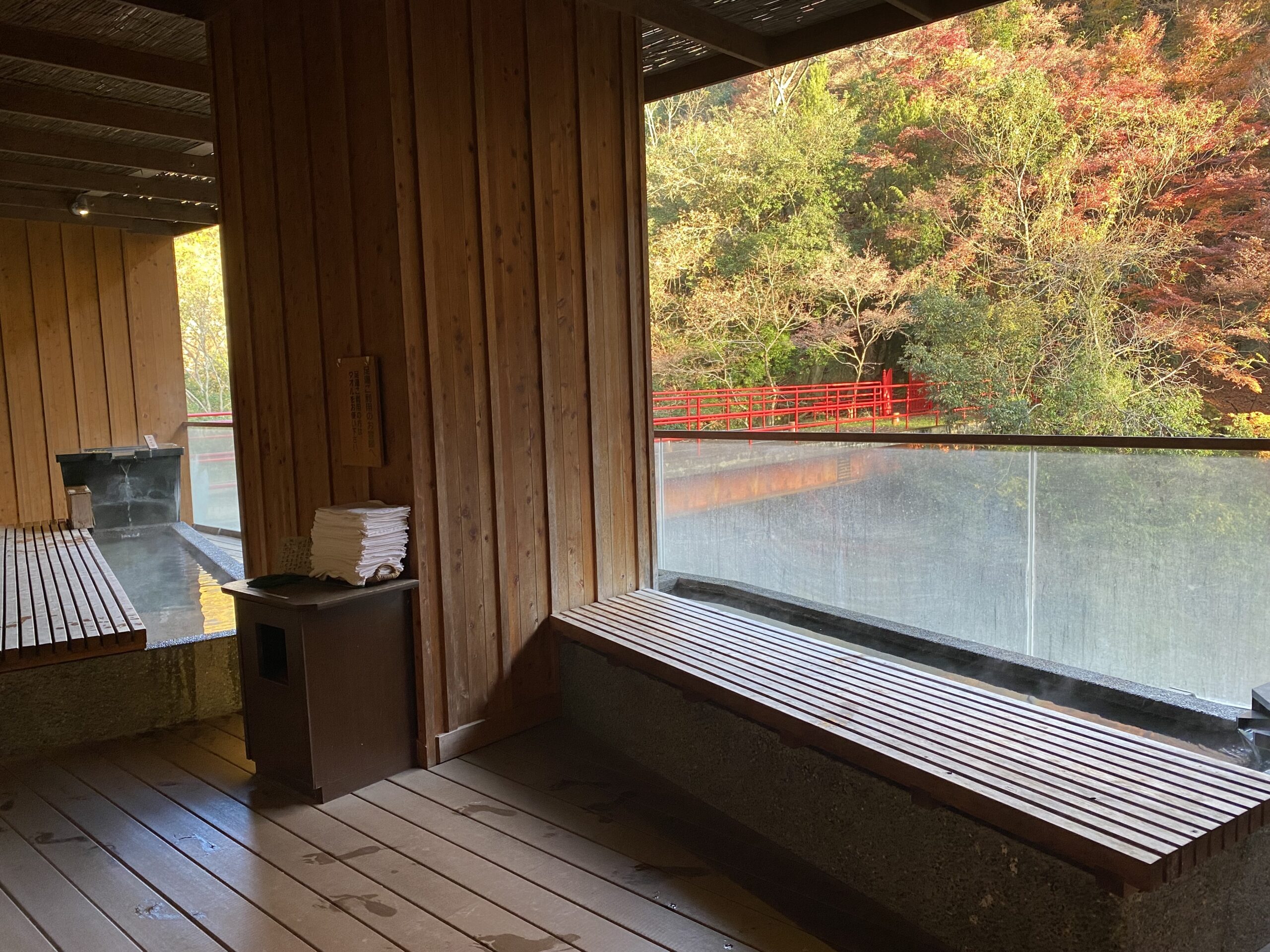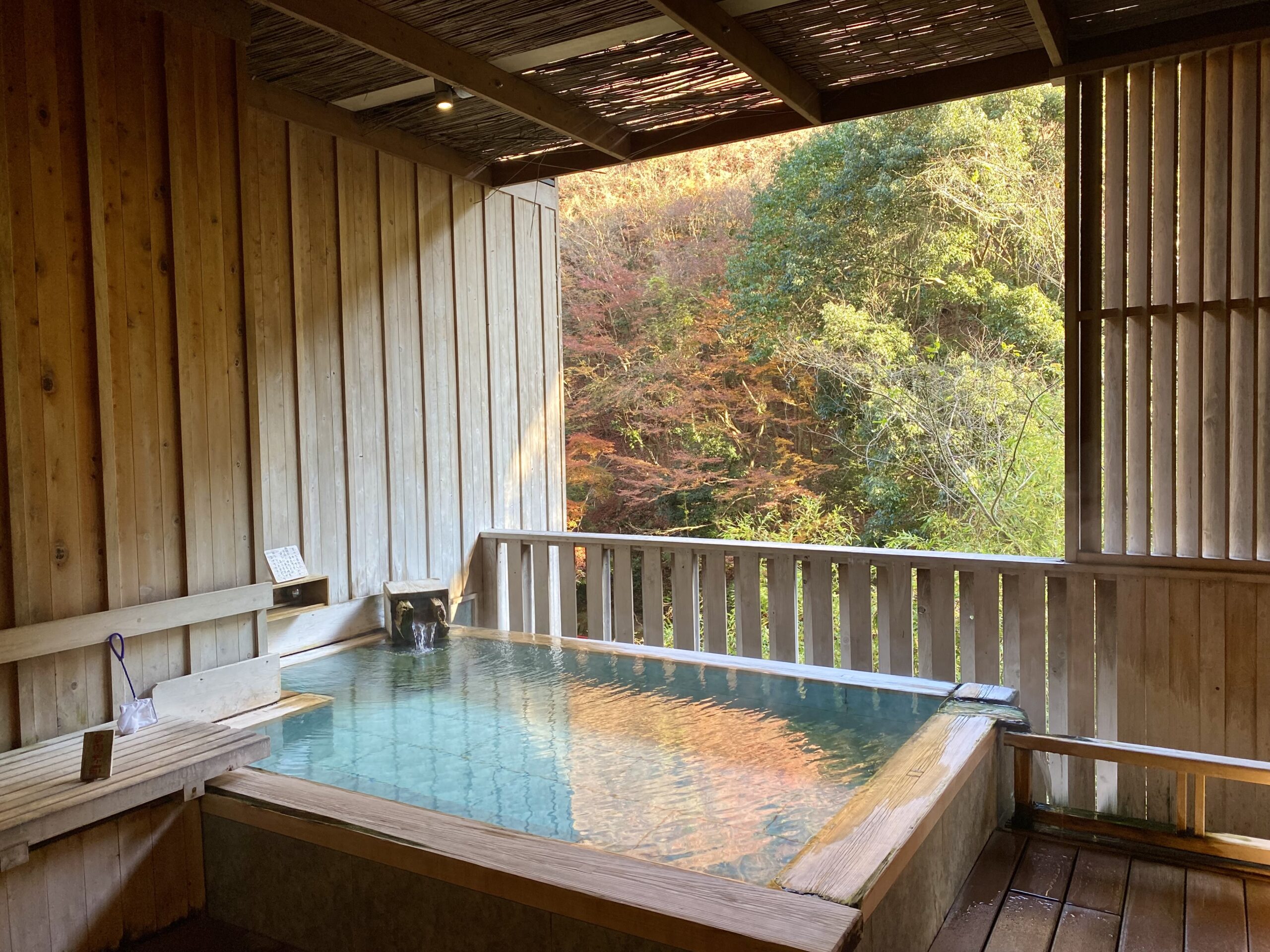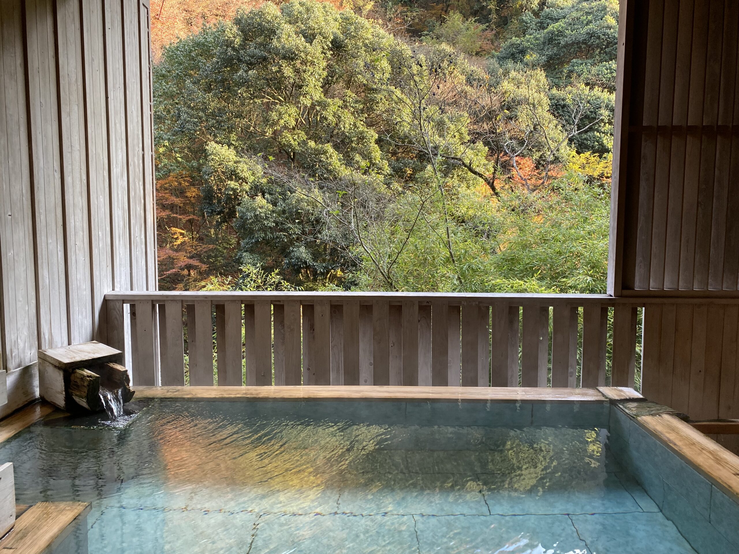 湯面に紅葉した樹々が映ってる。渓谷が目の前に迫るロケーション。