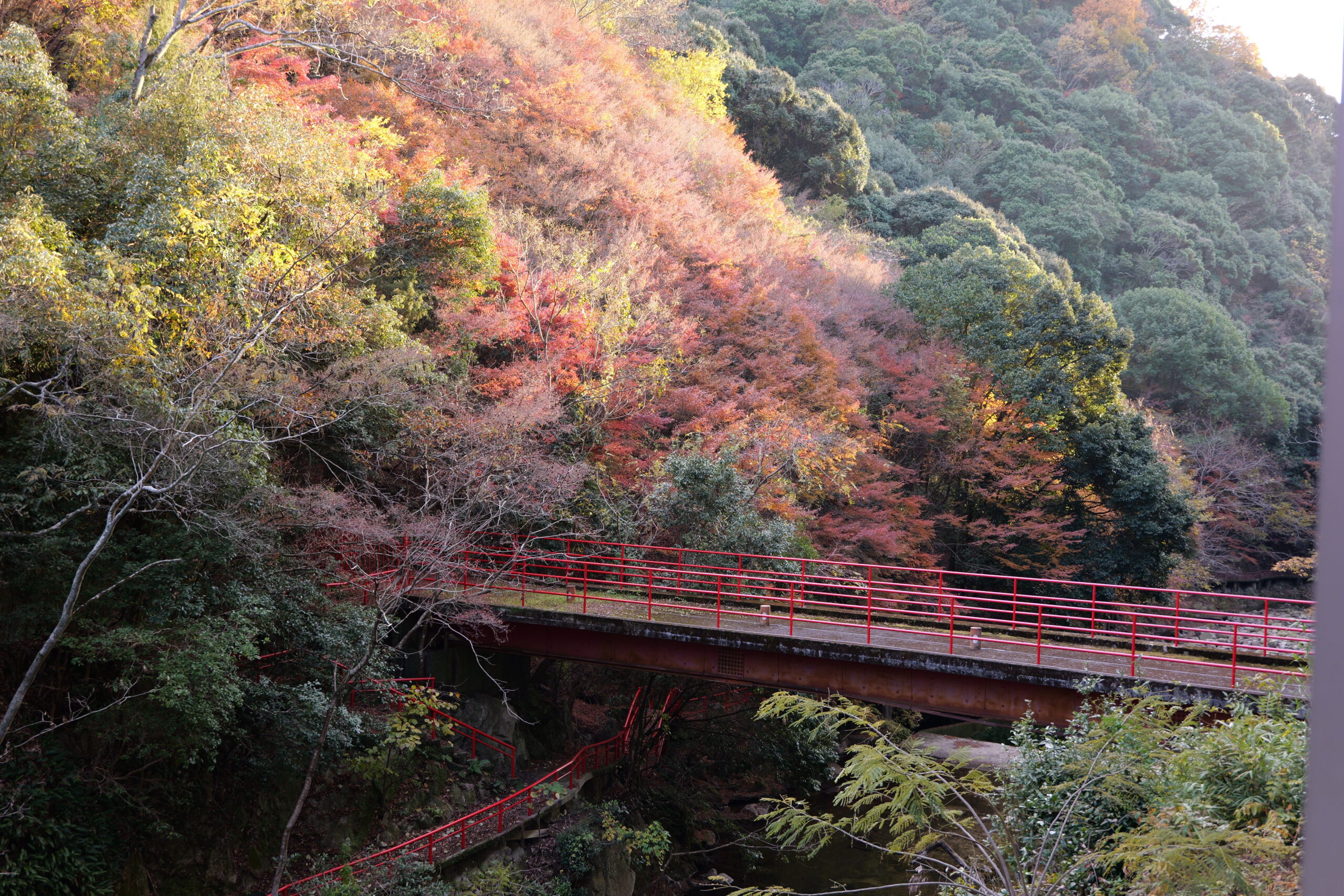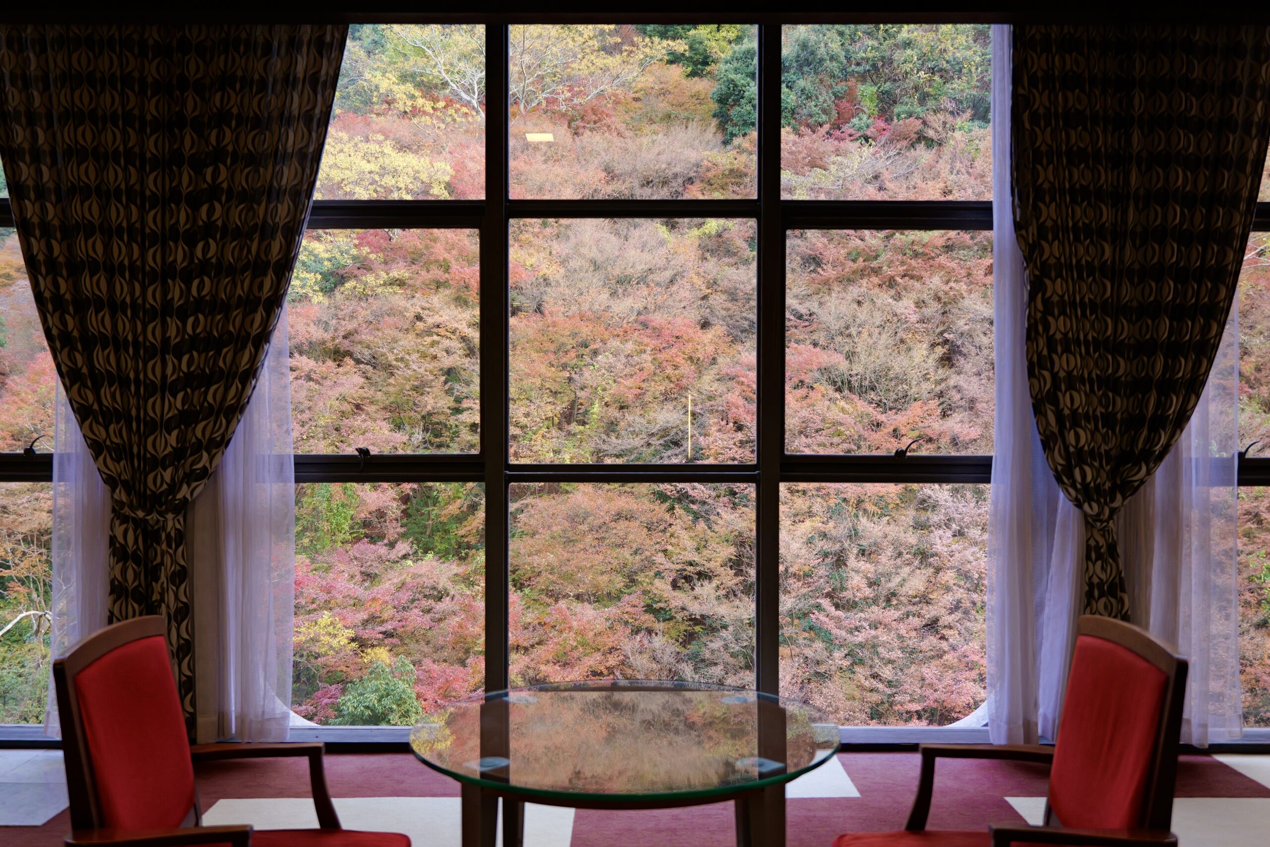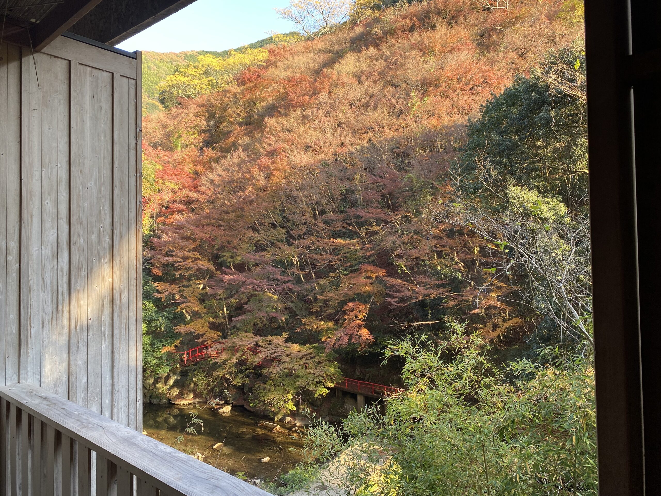 湯面に紅葉した樹々が映ってる。渓谷が目の前に迫るロケーション。