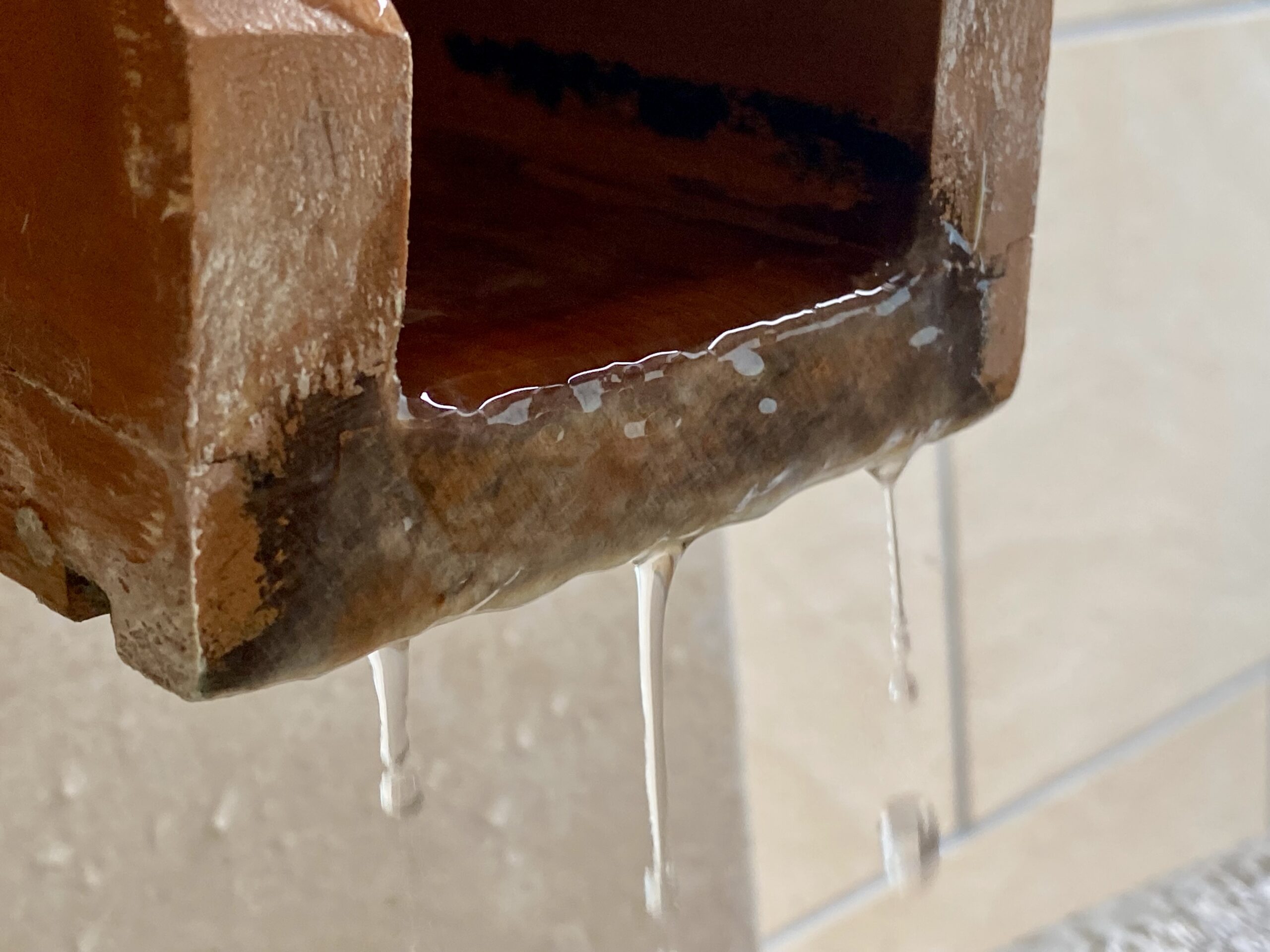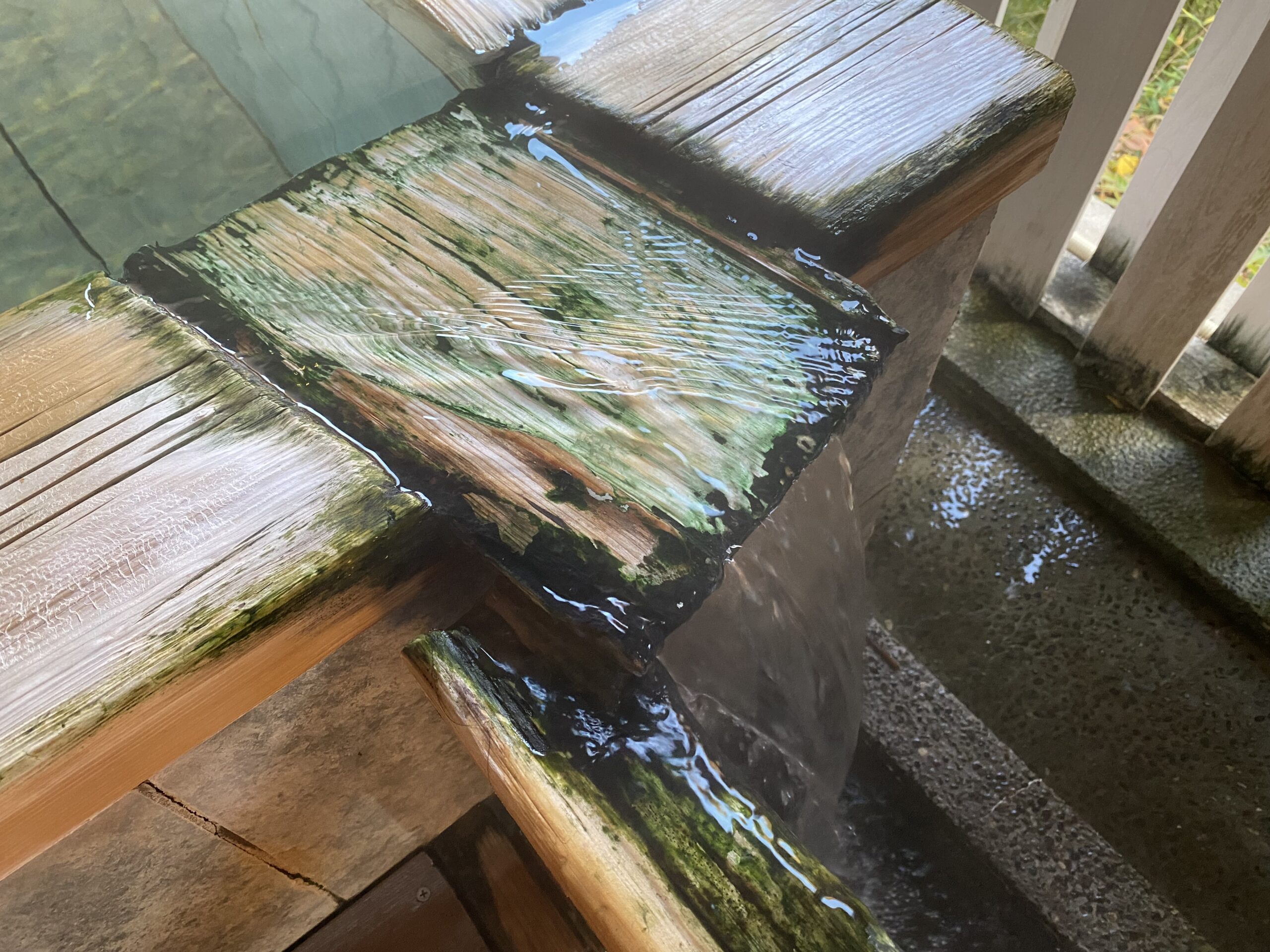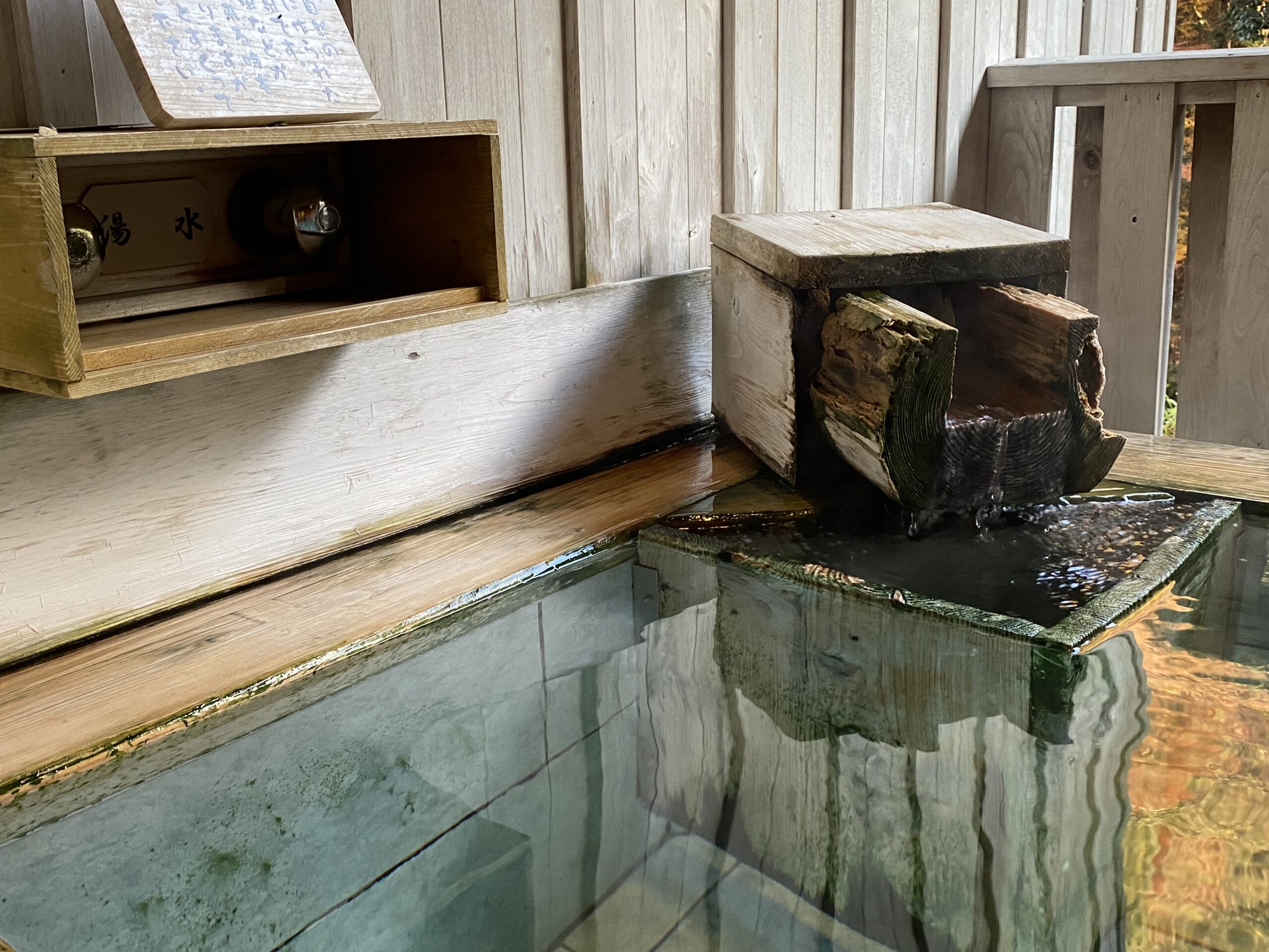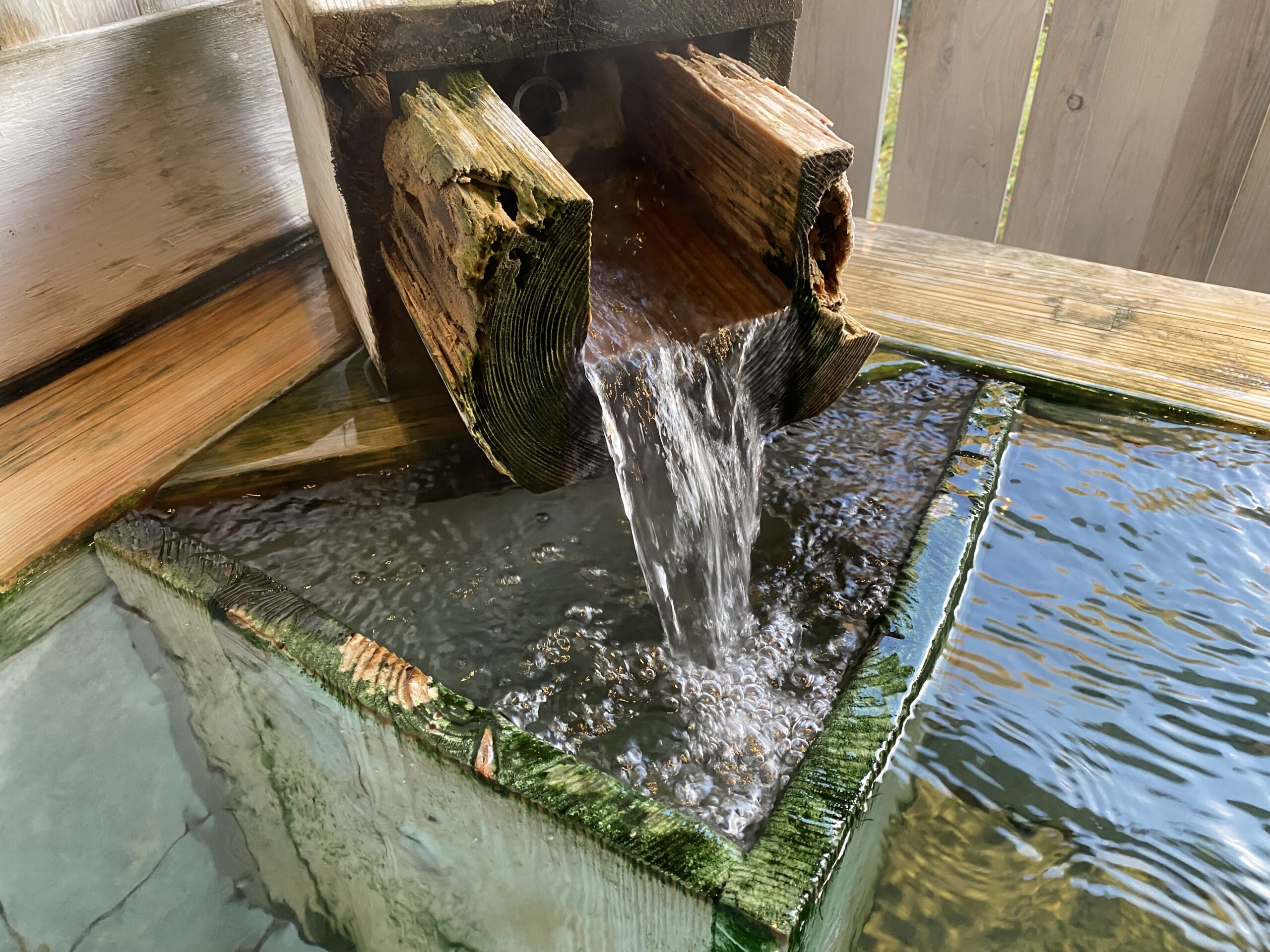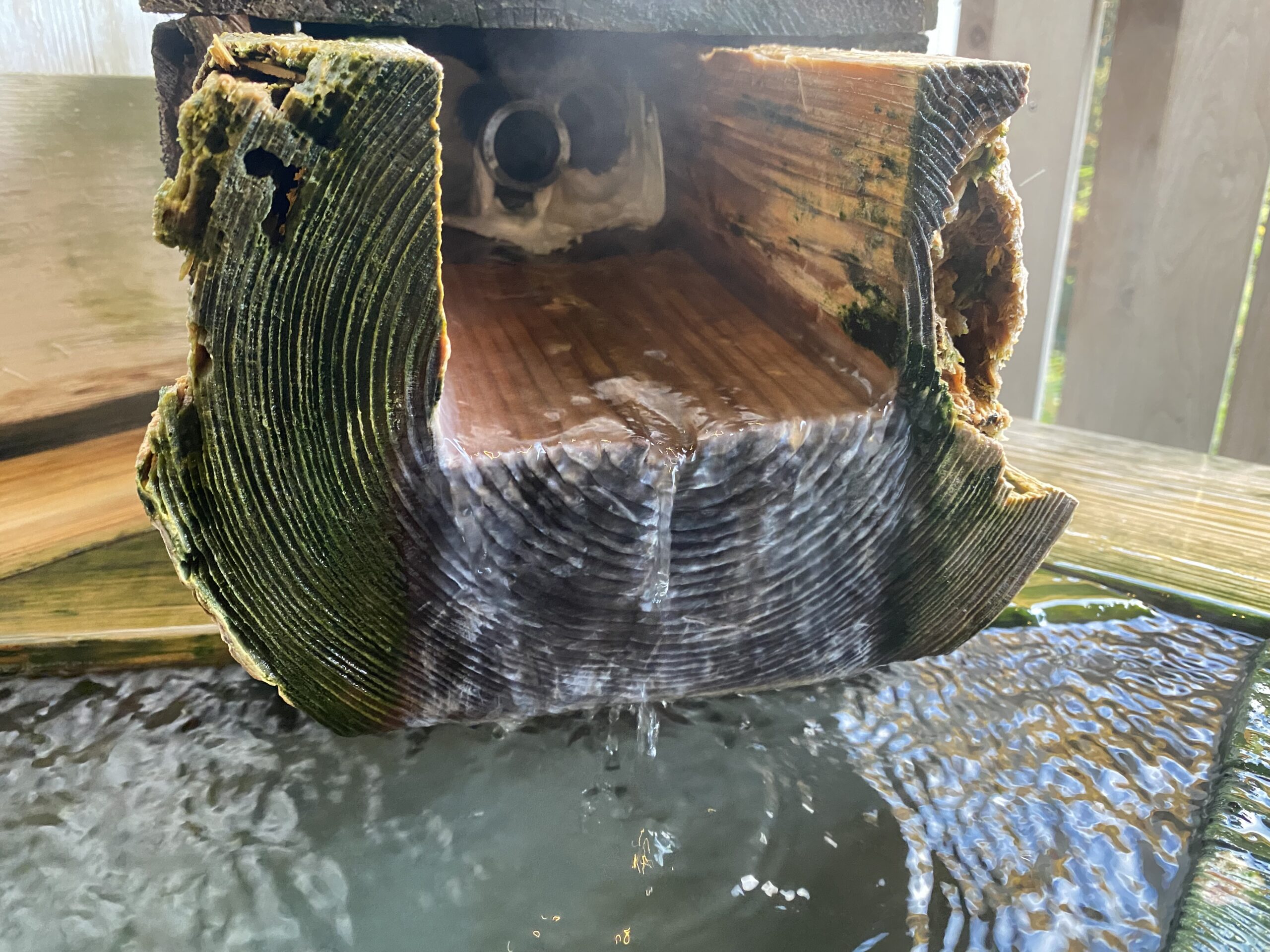 丸太の切り抜き湯口。湯口のある角は木で囲った仕切りがあり、上下からじわじわと湯が広がるようになってる。
