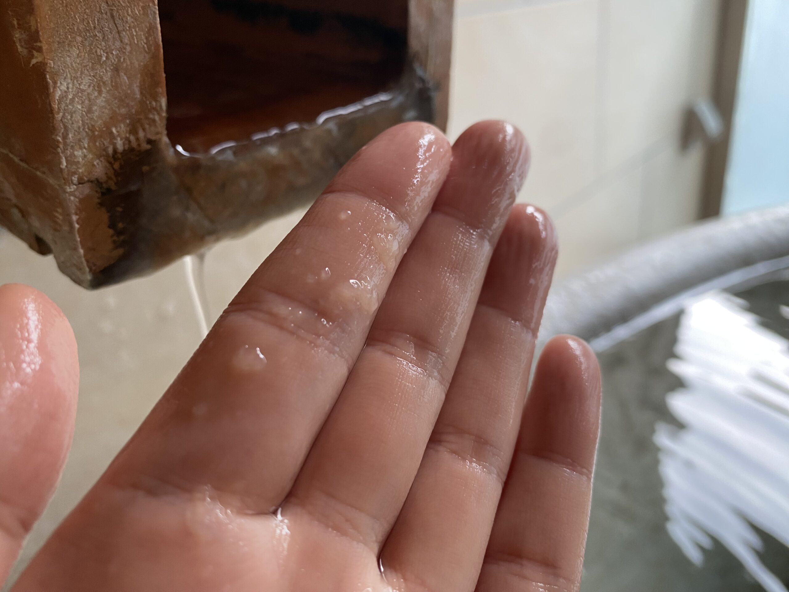 湯口は触っても指に湯の花が付くわけではないけど、ぬるりとする。湯口周りの湯底はぬるぬる。ほんのりなんだけどしっかり硫黄臭。