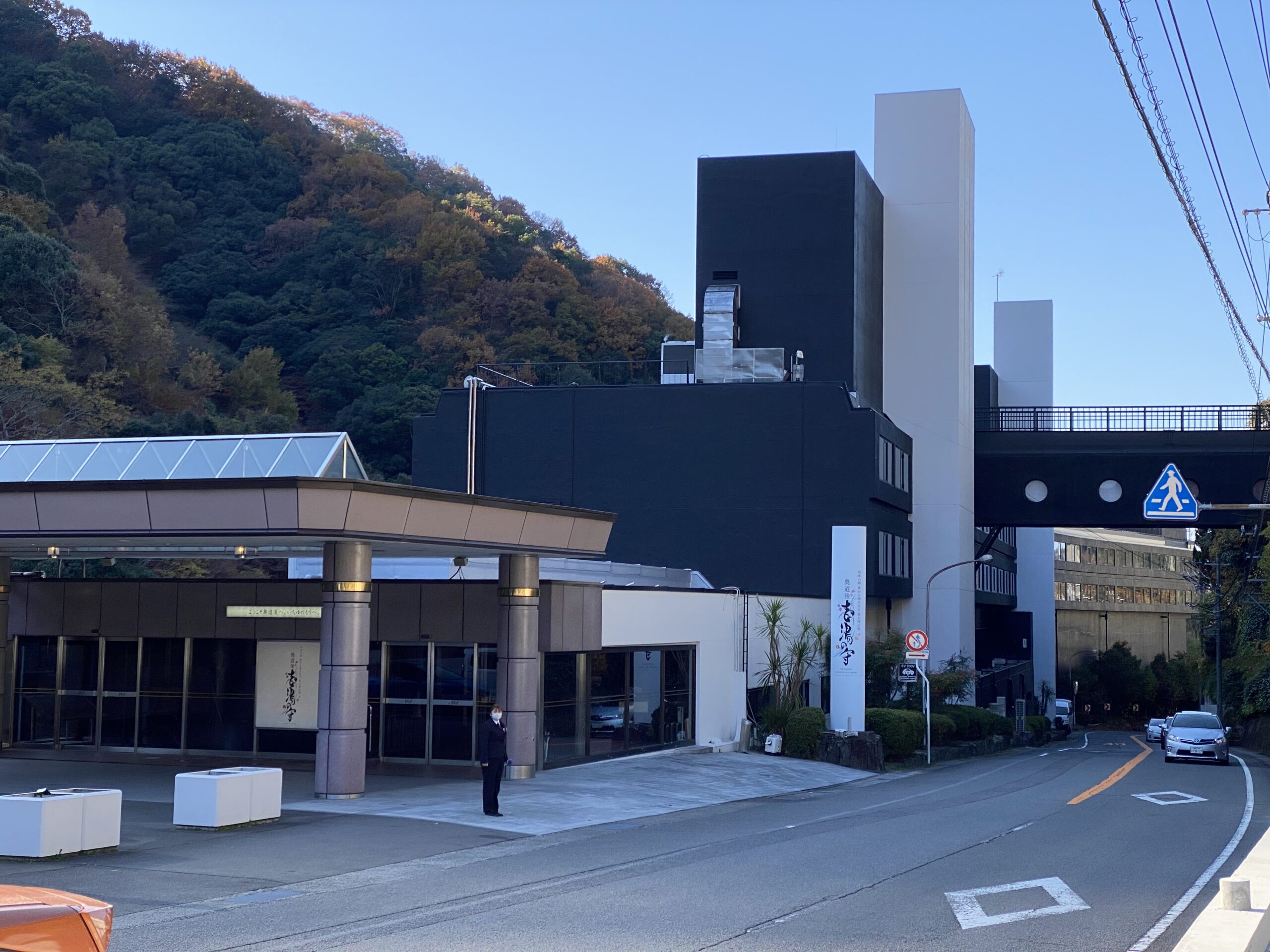 石手川の渓谷に沿って建てられた奥道後 壱湯の守へ。