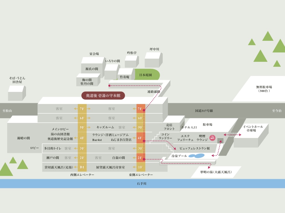 元は今治の来島どっくグループが開業したホテル奥道後。平成不況などで民事再生法申請、愛知県の海栄館が買収し、2014年に奥道後 壱湯の守としてリニューアルオープンした宿。