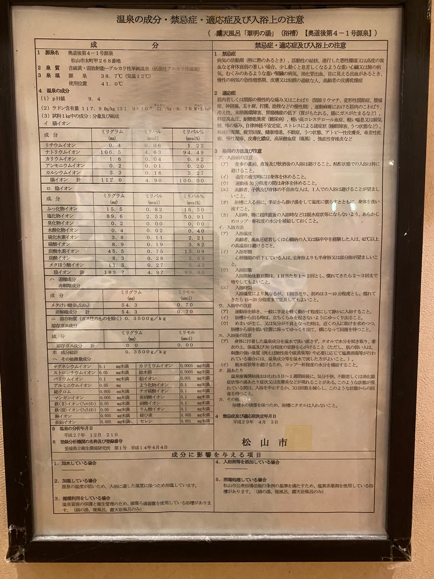 湯に入ると縁からも溢れ出る。ぬるつるの肌触りで、硫黄の香りがほんのり。泉質は含硫黄-弱放射能-アルカリ性単純温泉。