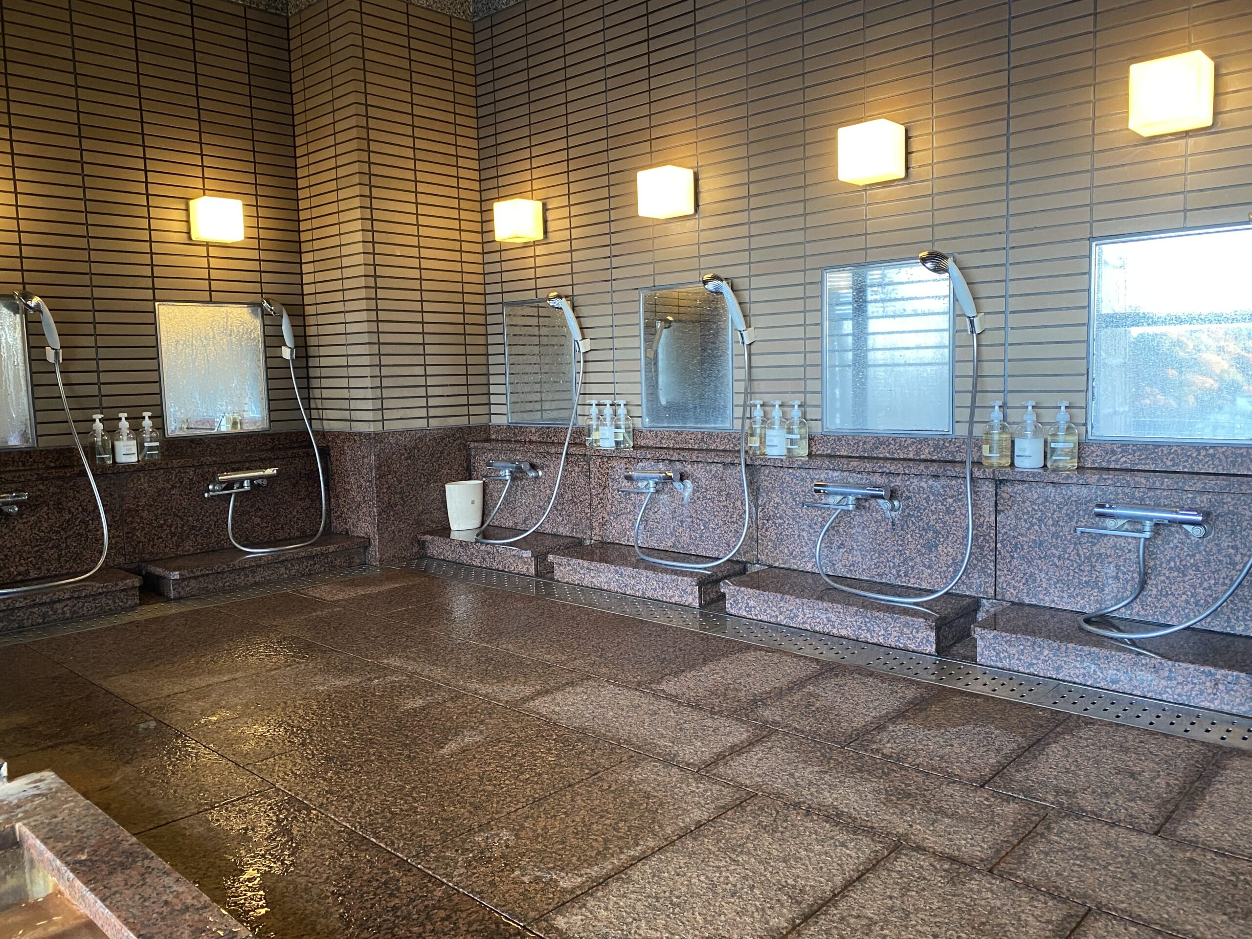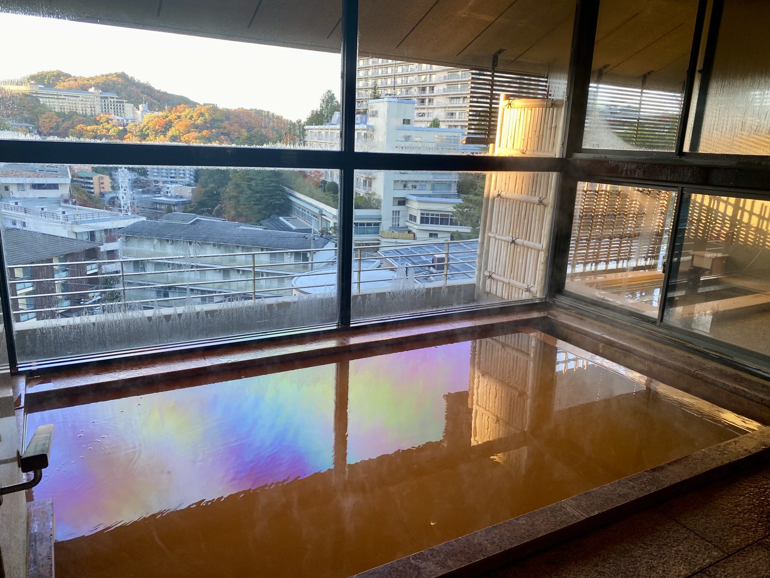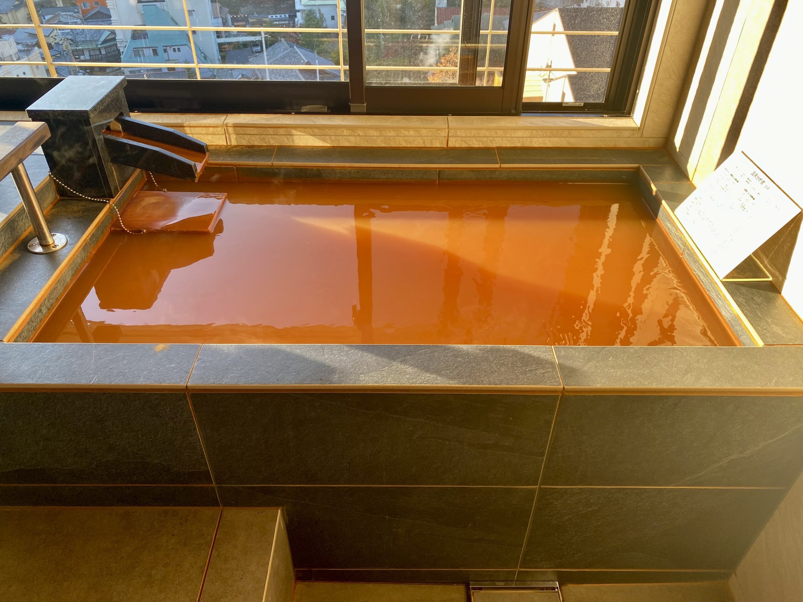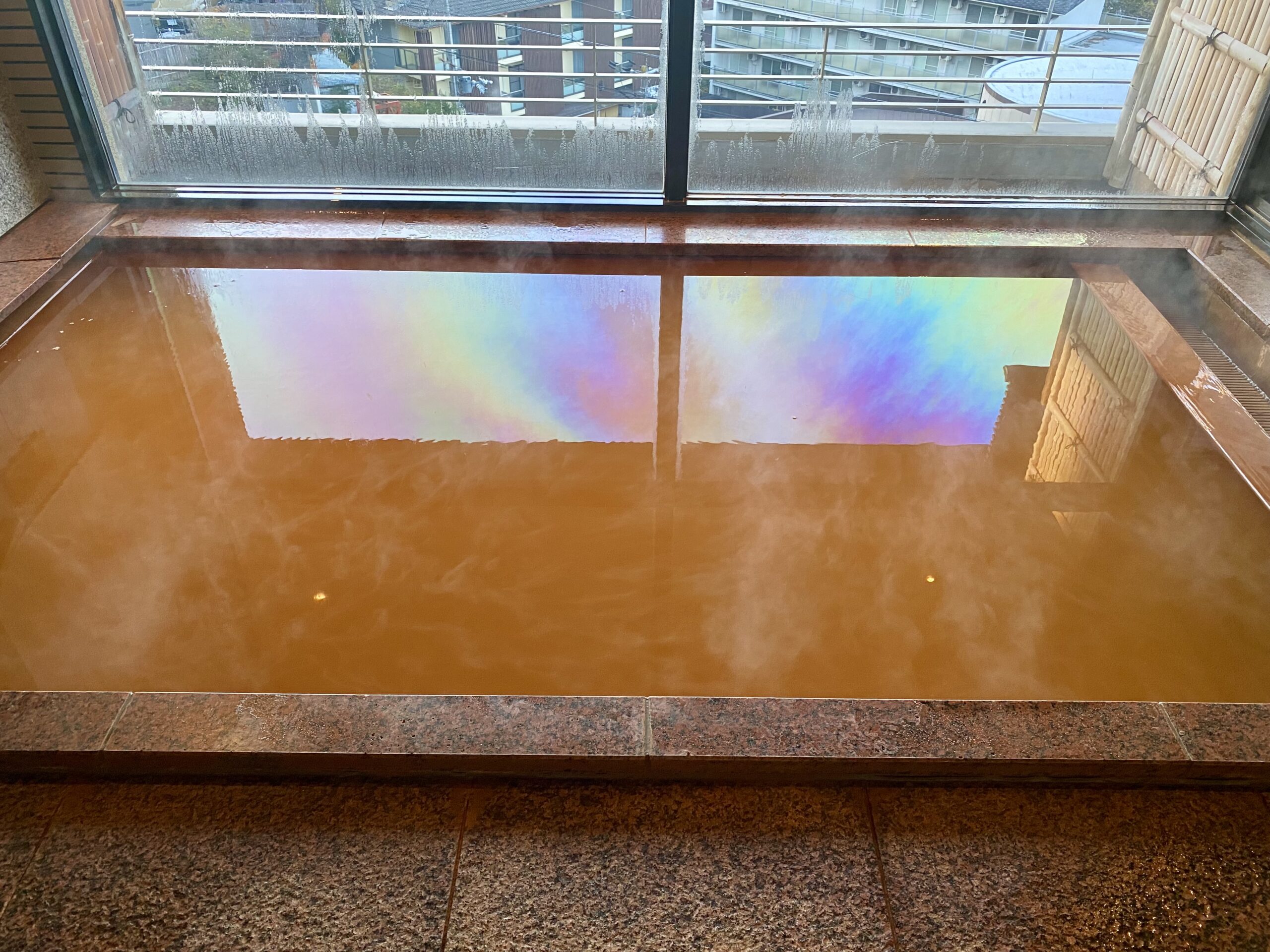 オレンジ色の濃く濁った内風呂は、極楽泉源を使用した金泉。何組か先客いても気にならないくらいのサイズだけど、部屋数多くないから、人とかぶらなかった。