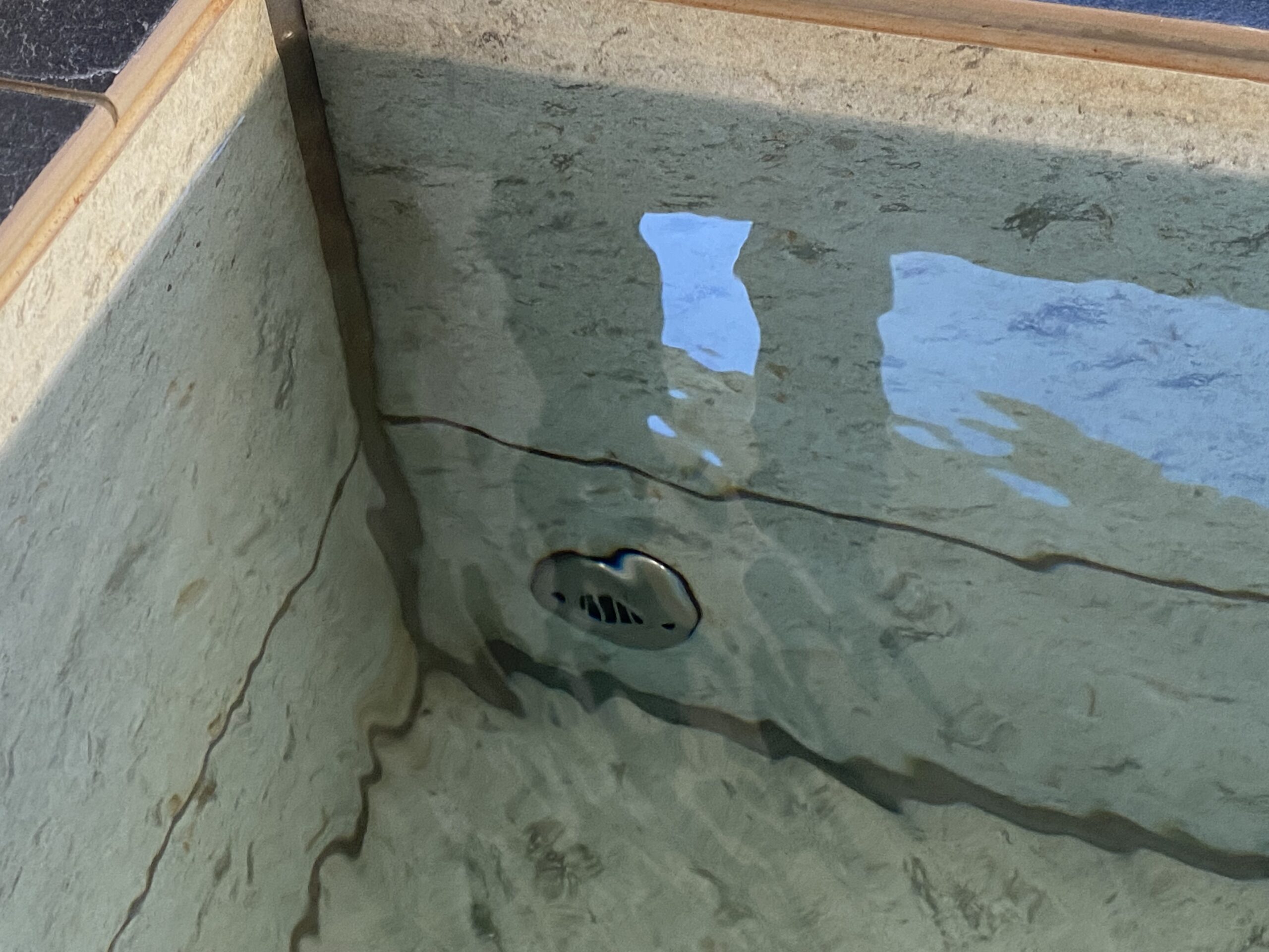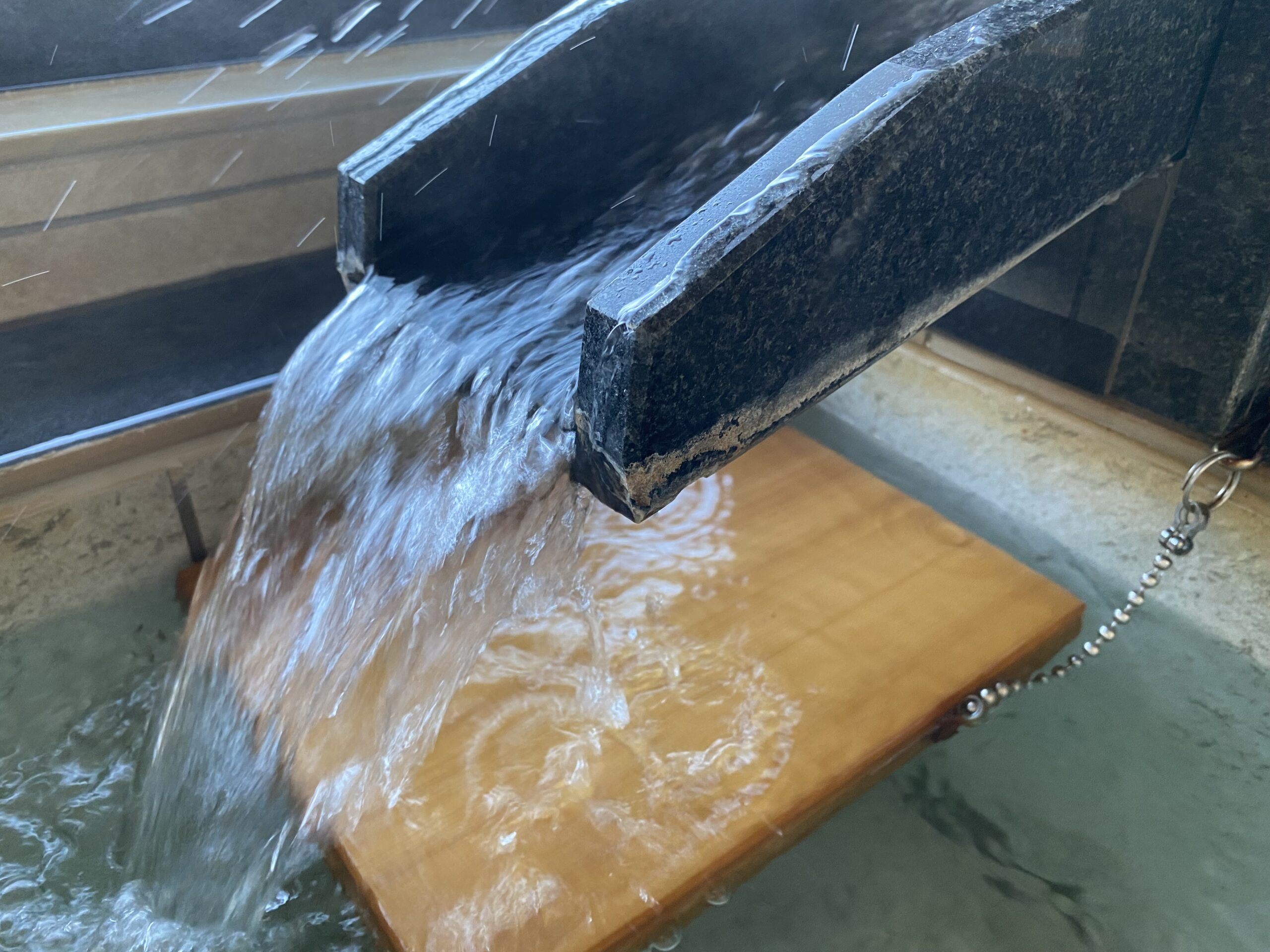 湯が減ると、湯口から足されるしくみ。女性1人くらいだとあまり溢れないので、洗面器で少し湯を出すと、足してもらえる。冷たくはない程度のぬるい湯が出てくる。ちりちり感が大浴場より弱い気がする。