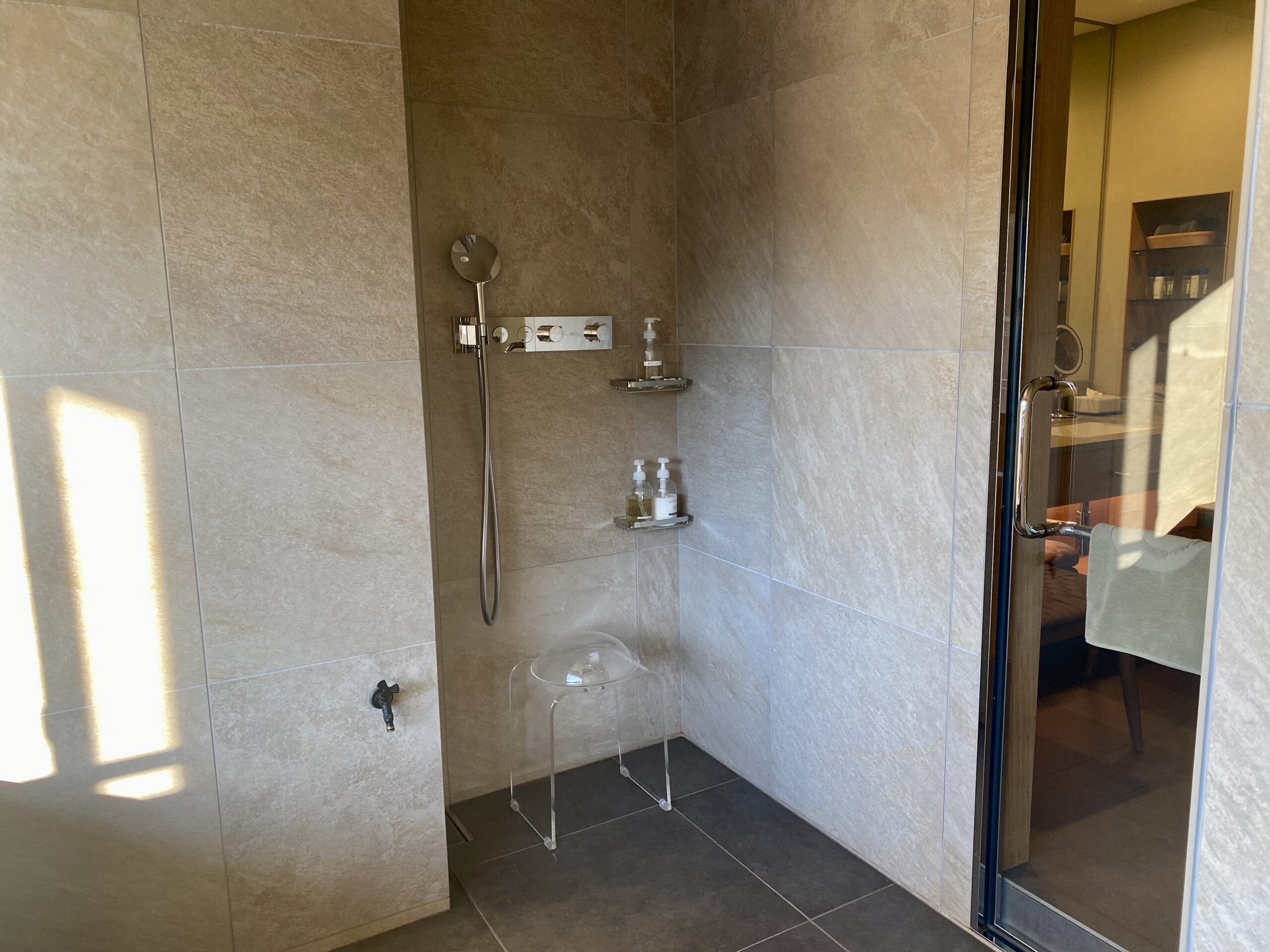 脱衣所側の出入り口にシャワー。天井にもシャワー付いてるやつで、おしゃれ過ぎて使い方分かりづらく、何度か上から浴びる事態に。