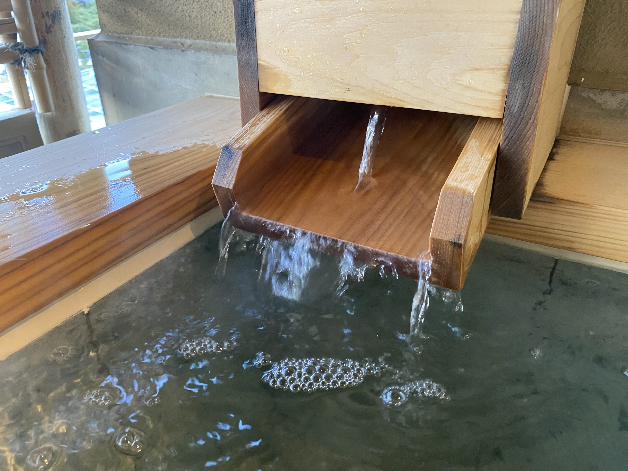 通常は湯口からはほぼ出てなくて、湯船の中の側面からかなりの勢いで湯を出し循環させてる。濃いから撹拌が必要なのかな。