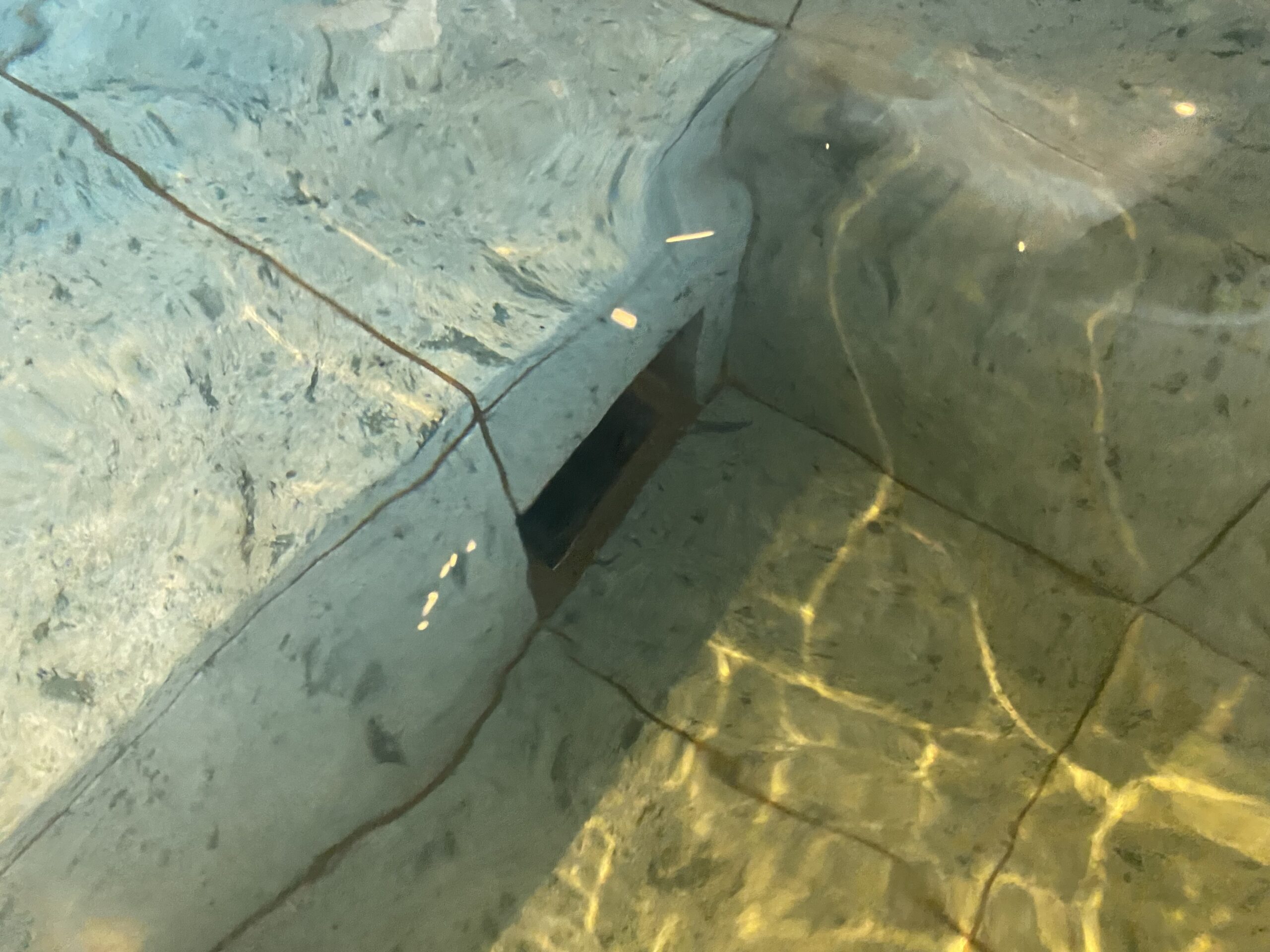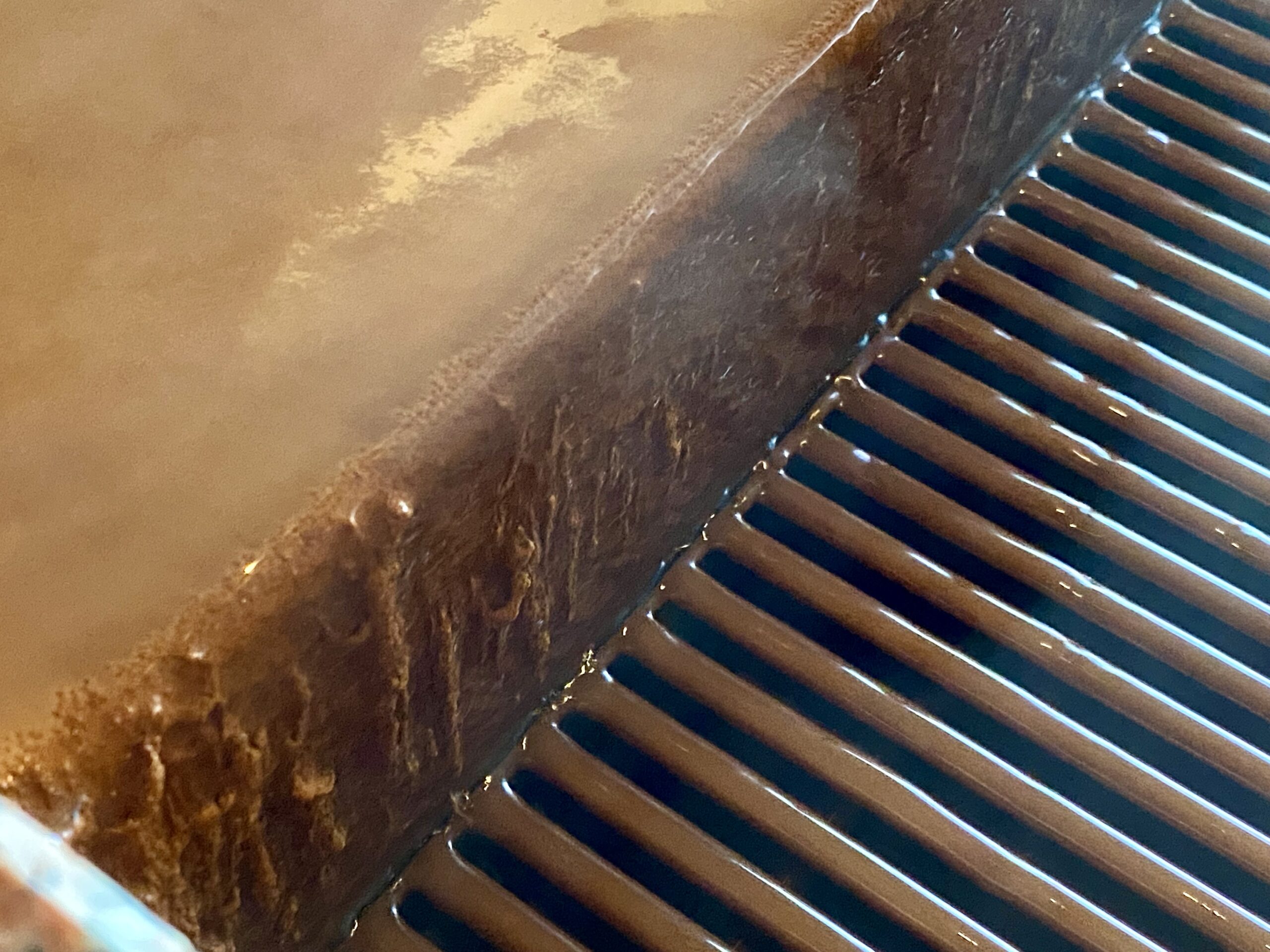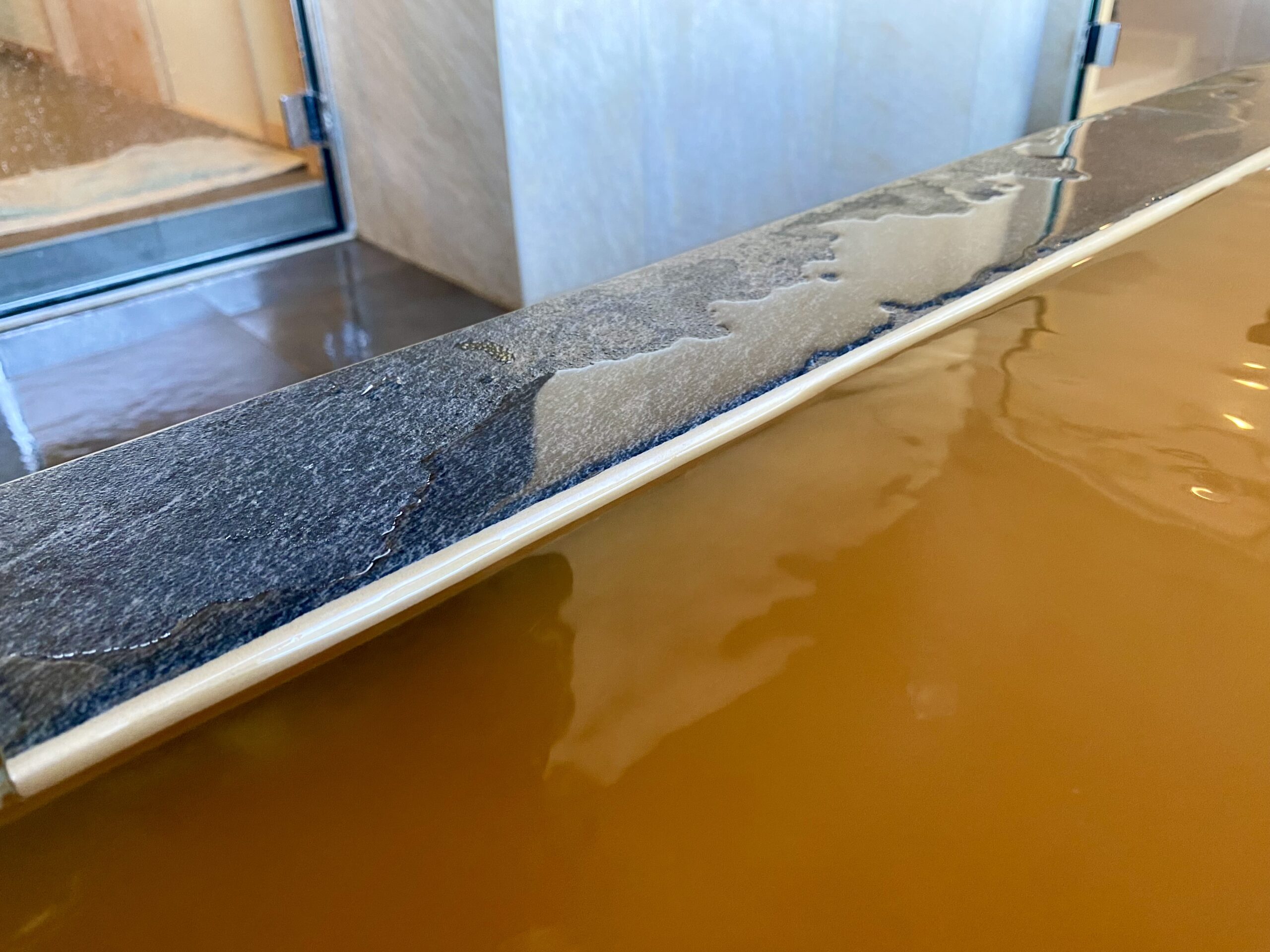かけ流しじゃないけど、加水はしてないとのこと。循環とかけ流しの併用で、溢れた分だけ注がれてるのか、湯尻から溢れ出る湯で、ただれたような析出が育ってる。